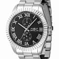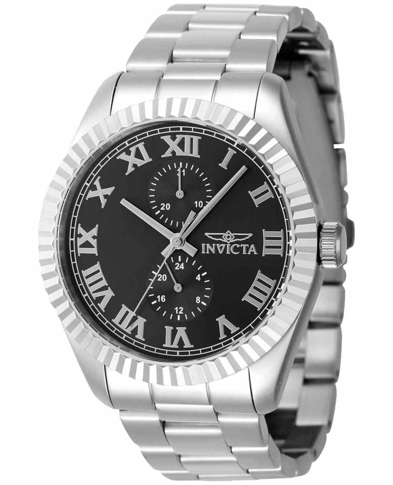 Мужские наручные часы Invicta Specialty IN47420 сочетают в себе классический дизайн и надежность современных технологий . Модель обладает круглым корпусом, выполненным из нержавеющей стали, что обеспечивает высокую устойчивость к внешним воздействиям. БезельБезельВнешний ободок, закрепляющий стекло. В спортивных часах так называется поворотное кольцо с делениями на циферблате, выполняет роль таймера – замеряет отрезки времени на шкале. Неподвижный безель – элемент декора. Однонаправленно вращающийся безель на дайверских часах позволяет фиксировать моменты погружения и выныривания на поверхность. украшен рифленой отделкой, придающей часам дополнительную элегантность . Браслет также изготовлен из нержавеющей стали и оснащен раскладывающейся застежкойРаскладной замокДанный вариант застежки используется только на часах с металлическим браслетом. Отличительная особенность такого крепления в том, что длина браслета становится универсальной и вы можете самостоятельно отрегулировать нужный вам размер – застежка просто двигается по браслету часов., гарантирующей комфортное ношение и безопасность. Черный циферблат дополнен метками в виде римских цифр. 12-ти и 24-х часовой формат времени и дата вынесены на отдельные циферблаты. Для защиты используется минеральное стеклоМинеральное стеклоМинеральное стекло представляет собой искусственно выращенный минерал кварца. Такое стекло отличается особой устойчивостью к повреждениям и царапинам. Уступает по некоторым качествам сапфировому стеклу., которое обеспечивает прочность и устойчивость к царапинам. Часы оснащены кварцевым механизмом калибра Seiko TMI VH61, что гарантирует точность хода без необходимости подзаводки. Водонепроницаемость модели достигает 50 метров (5 атмосфер), что позволяет использовать их в повседневной жизни, включая контакт с водой, например, при мытье рук или дожде. Сочетание классического дизайна и функциональности делает эту модель универсальным аксессуаром для различных случаев жизни.
