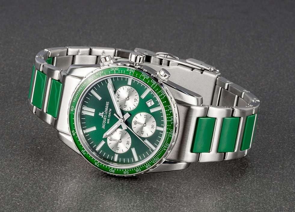 Мужские часы Jacques Lemans Liverpool 1-2059J — это стильное сочетание элегантности и современного дизайна. Корпус из нержавеющей стали диаметром 39 мм идеально сбалансирован и элегантен. Минеральное стеклоМинеральное стеклоМинеральное стекло представляет собой искусственно выращенный минерал кварца. Такое стекло отличается особой устойчивостью к повреждениям и царапинам. Уступает по некоторым качествам сапфировому стеклу. защищает циферблат от царапин. Браслет из нержавеющей стали на раскладной застёжкеРаскладная застёжкаТакой тип застёжки используется только на браслетах из металла. Она никогда не раскрывается полностью, происходит разделение на 2 и более частей. Раскладывающая застёжка снизит вероятность потери часов к минимуму. идеально дополняют дизайн часов, обеспечивая комфортное ношение. Стрелки и метки с люминесцентным покрытиемЛюминесцентное покрытиеПозволяет считывать показания времени в темноте. Производители наносят на стрелки, часовые индексы, безель или поверхность циферблата светонакопительный состав, дающий холодное свечение.. БезельБезельВнешний ободок, закрепляющий стекло. В спортивных часах так называется поворотное кольцо с делениями на циферблате, выполняет роль таймера – замеряет отрезки времени на шкале. Неподвижный безель – элемент декора. Однонаправленно вращающийся безель на дайверских часах позволяет фиксировать моменты погружения и выныривания на поверхность. с PVDPVDУльтратонкое покрытие наносится в технике вакуумного напыления, сочетает в себе нитрид титана особой прочности со слоем золота или оксида хрома. Несёт в себе декоративную или защитную функцию. покрытием и со шкалой тахиметраТахиметрРазмеченная шкала, располагается на ободке или безеле часов. Тахиметр позволяет рассчитать скорость на определённом участке пути, расстояние измеряется в километрах или милях. обрамляет циферблат. Функции хронографаХронографФункция позволяет измерять отрезки времени с особой точностью: часы, минуты, секунды. Верным признаком хронографа является наличие на циферблате 3 дополнительных окошек-счётчиков. с секундомеромСекундомерСекундоме́р — прибор, способный измерять интервалы времени с точностью до долей секунды. представляют собой стильный аксессуар, отражающий идеальное сочетание современного дизайна, надёжности и функциональности. Часы обладают впечатляющей водонепроницаемостью до 10 бар (100 метров), что делает их идеальными для повседневной носки.
