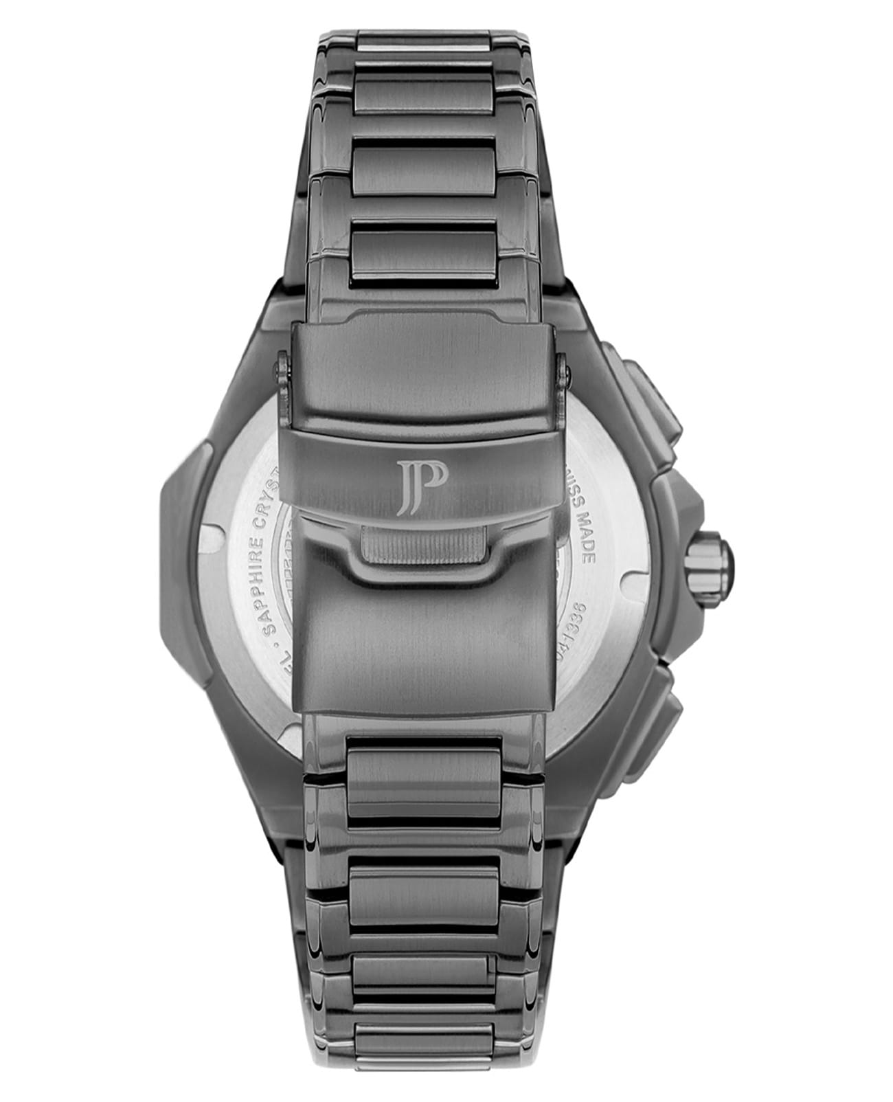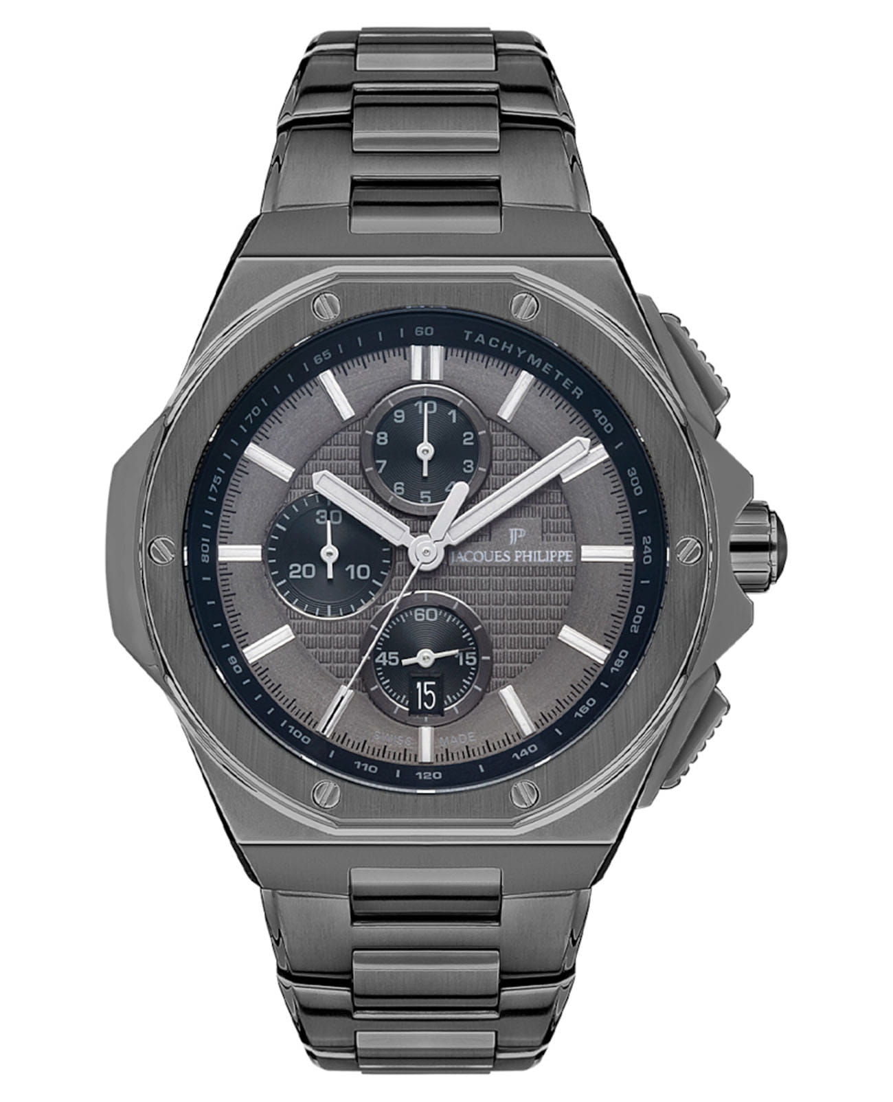 Швейцарские мужские часы-хронографХронографФункция позволяет измерять отрезки времени с особой точностью: часы, минуты, секунды. Верным признаком хронографа является наличие на циферблате 3 дополнительных окошек-счётчиков. с секундомеромСекундомерСекундоме́р — прибор, способный измерять интервалы времени с точностью до долей секунды. Jacques Philippe Esquire JPQGC048347B, кварцевый механизм с высокой точностью. Сапфировое стеклоСапфировое стеклоПрочный и надёжный материал из кристалла сапфира синтетического происхождения, характеризующийся особой твёрдостью и устойчивостью к царапинам и повреждениям. устойчивое к появлению царапин, обладающее высокой прозрачностью. Корпус часов изготовлен из нержавеющей стали. На циферблате три дополнительных индикатора. Стрелки с люминесцентным покрытиемЛюминесцентное покрытиеПозволяет считывать показания времени в темноте. Производители наносят на стрелки, часовые индексы, безель или поверхность циферблата светонакопительный состав, дающий холодное свечение.. Шкала тахиметраТахиметрРазмеченная шкала, располагается на ободке или безеле часов. Тахиметр позволяет рассчитать скорость на определённом участке пути, расстояние измеряется в километрах или милях. на циферблате. Класс водозащиты: 50 метров, позволит защитить корпус от случайных брызг или капель дождя. Стальной браслет на раскладной застёжкеРаскладная застёжкаТакой тип застёжки используется только на браслетах из металла. Она никогда не раскрывается полностью, происходит разделение на 2 и более частей. Раскладывающая застёжка снизит вероятность потери часов к минимуму..