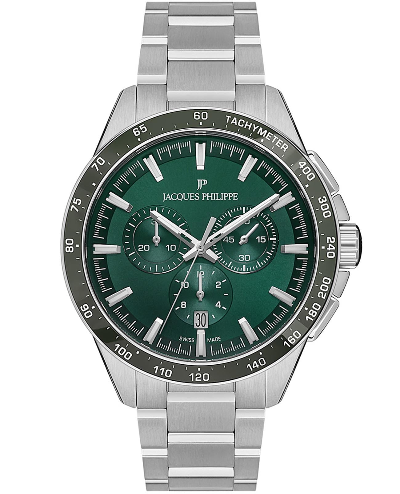 Швейцарские мужские часы-хронографХронографФункция позволяет измерять отрезки времени с особой точностью: часы, минуты, секунды. Верным признаком хронографа является наличие на циферблате 3 дополнительных окошек-счётчиков. с секундомеромСекундомерСекундоме́р — прибор, способный измерять интервалы времени с точностью до долей секунды. Jacques Philippe Magnificus JPQGC2513X6, кварцевый механизм с высокой точностью. Сапфировое стеклоСапфировое стеклоПрочный и надёжный материал из кристалла сапфира синтетического происхождения, характеризующийся особой твёрдостью и устойчивостью к царапинам и повреждениям. устойчивое к появлению царапин, обладающее высокой прозрачностью. Корпус часов изготовлен из нержавеющей стали. БезельБезельВнешний ободок, закрепляющий стекло. В спортивных часах так называется поворотное кольцо с делениями на циферблате, выполняет роль таймера – замеряет отрезки времени на шкале. Неподвижный безель – элемент декора. Однонаправленно вращающийся безель на дайверских часах позволяет фиксировать моменты погружения и выныривания на поверхность. с IP-покрытиемIP-покрытиеМетод ионного напыления. Демонстрирует повышенную устойчивость к истиранию, окислению и химическим веществам. Под воздействием высокого давления и температуры около 1500°C молекулы металла надёжно соединяются с частицами корпуса часов. с тахиметромТахиметрРазмеченная шкала, располагается на ободке или безеле часов. Тахиметр позволяет рассчитать скорость на определённом участке пути, расстояние измеряется в километрах или милях.. На циферблате три дополнительных индикатора. Окошко даты находится в положении 6 часов. Стрелки с люминесцентным покрытиемЛюминесцентное покрытиеПозволяет считывать показания времени в темноте. Производители наносят на стрелки, часовые индексы, безель или поверхность циферблата светонакопительный состав, дающий холодное свечение.. Класс водозащиты: 100 метров, позволит плавать, нырять и заниматься другими водными видами спорта. Стальной браслет на застёжке-бабочке.