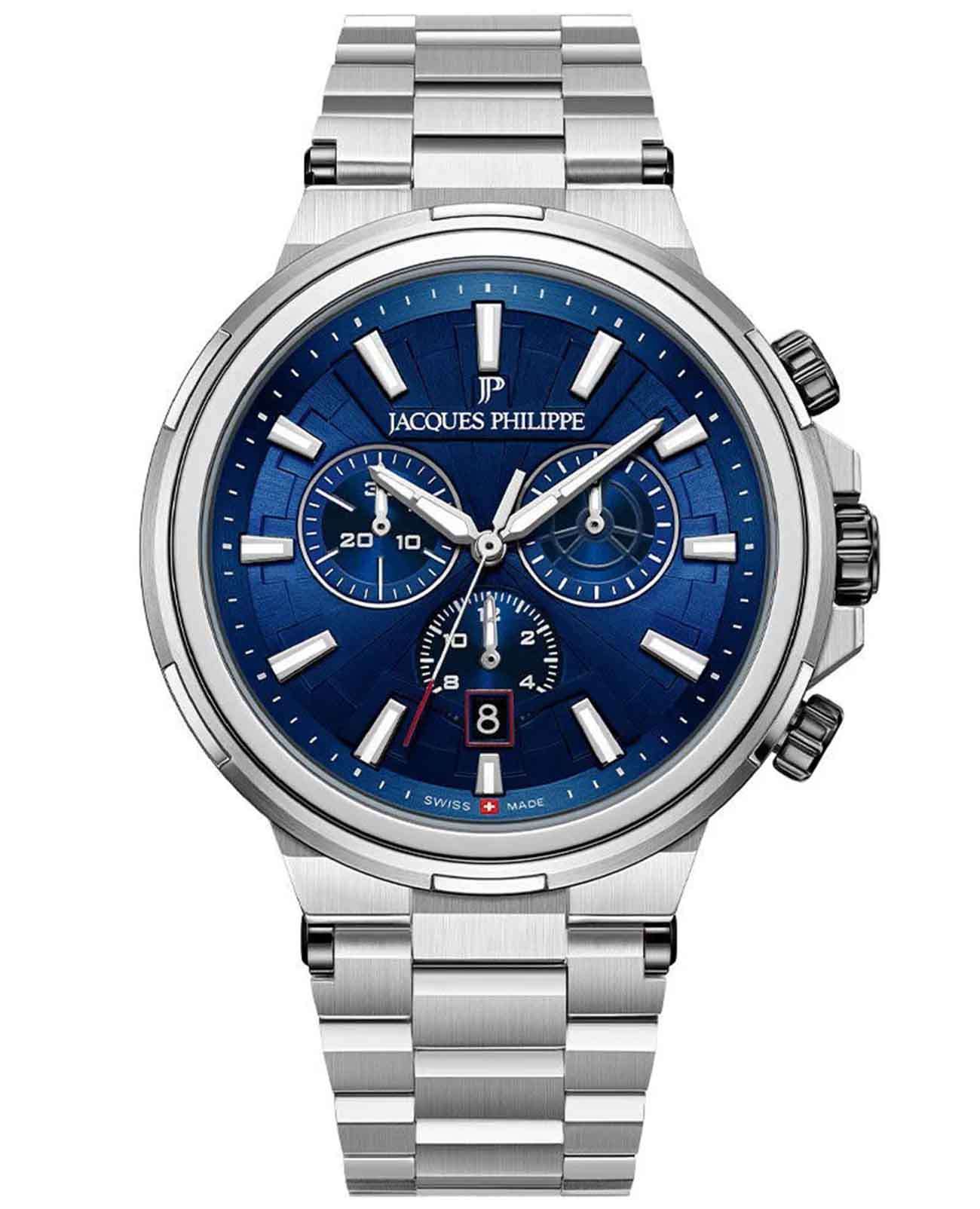 Jacques Philippe Corus JPQGC441336 — стильные швейцарские часы с функцией хронографаХронографФункция позволяет измерять отрезки времени с особой точностью: часы, минуты, секунды. Верным признаком хронографа является наличие на циферблате 3 дополнительных окошек-счётчиков. и секундомераСекундомерСекундоме́р — прибор, способный измерять интервалы времени с точностью до долей секунды., которые сочетают в себе элегантность и современный функционал. Модель оснащена точным кварцевым механизмом и надежным корпусом из нержавеющей стали 316L, что гарантирует долговечность и устойчивость к механическим воздействиям. Сапфировое стеклоСапфировое стеклоПрочный и надёжный материал из кристалла сапфира синтетического происхождения, характеризующийся особой твёрдостью и устойчивостью к царапинам и повреждениям. отличается высокой прозрачностью и устойчивостью к царапинам, сохраняя безупречный внешний вид часов даже при активном использовании. Серебристый циферблат украшен тремя дополнительными индикаторами и удобным окошком даты в положении «4 часа», а стрелки с люминесцентным покрытиемЛюминесцентное покрытиеПозволяет считывать показания времени в темноте. Производители наносят на стрелки, часовые индексы, безель или поверхность циферблата светонакопительный состав, дающий холодное свечение. обеспечивают отличную читаемость в любое время суток. Браслет из нержавеющей стали 316 оснащен удобной застежкой «бабочка»Застёжка "бабочка"Такой вид застёжки дополняется предохранителями, помогающими избежать случайного раскрытия браслета. Обладают изящным исполнением. , что обеспечивает комфорт и надежность при носке. Класс водозащиты 10 ATM (100 метров) позволяет не снимать часы во время мытья рук или прогулок под дождем.
