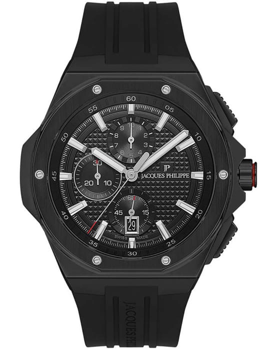 Швейцарские мужские часы-хронографХронографФункция позволяет измерять отрезки времени с особой точностью: часы, минуты, секунды. Верным признаком хронографа является наличие на циферблате 3 дополнительных окошек-счётчиков. с секундомеромСекундомерСекундоме́р — прибор, способный измерять интервалы времени с точностью до долей секунды. Jacques Philippe Esquire JPQGC484411, кварцевый механизм с высокой точностью. Сапфировое стеклоСапфировое стеклоПрочный и надёжный материал из кристалла сапфира синтетического происхождения, характеризующийся особой твёрдостью и устойчивостью к царапинам и повреждениям. устойчивое к появлению царапин, обладающее высокой прозрачностью. Корпус часов изготовлен из нержавеющей стали с IP-покрытиемIP-покрытиеМетод ионного напыления. Демонстрирует повышенную устойчивость к истиранию, окислению и химическим веществам. Под воздействием высокого давления и температуры около 1500°C молекулы металла надёжно соединяются с частицами корпуса часов.. На циферблате три дополнительных индикатора. Стрелки и метки с люминесцентным покрытиемЛюминесцентное покрытиеПозволяет считывать показания времени в темноте. Производители наносят на стрелки, часовые индексы, безель или поверхность циферблата светонакопительный состав, дающий холодное свечение.. Шкала тахиметраТахиметрРазмеченная шкала, располагается на ободке или безеле часов. Тахиметр позволяет рассчитать скорость на определённом участке пути, расстояние измеряется в километрах или милях. на циферблате. Класс водозащиты: 50 метров, позволит защитить корпус от случайных брызг или капель дождя. Силиконовый ремешок.