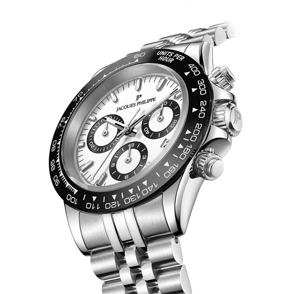 Швейцарские наручные часы Jacques Philippe JPQGC711326SBB сочетают в себе современный дизайн, надежность и функциональность, это стильные швейцарские часы с функцией хронографаХронографФункция позволяет измерять отрезки времени с особой точностью: часы, минуты, секунды. Верным признаком хронографа является наличие на циферблате 3 дополнительных окошек-счётчиков. и секундомераСекундомерСекундоме́р — прибор, способный измерять интервалы времени с точностью до долей секунды.. Корпус круглой формы диаметром 39 мм выполнен из прочной нержавеющей стали, а безельБезельВнешний ободок, закрепляющий стекло. В спортивных часах так называется поворотное кольцо с делениями на циферблате, выполняет роль таймера – замеряет отрезки времени на шкале. Неподвижный безель – элемент декора. Однонаправленно вращающийся безель на дайверских часах позволяет фиксировать моменты погружения и выныривания на поверхность. с элегантным черным IP-покрытиемIP-покрытиеМетод ионного напыления. Демонстрирует повышенную устойчивость к истиранию, окислению и химическим веществам. Под воздействием высокого давления и температуры около 1500°C молекулы металла надёжно соединяются с частицами корпуса часов., а сапфировое стеклоСапфировое стеклоПрочный и надёжный материал из кристалла сапфира синтетического происхождения, характеризующийся особой твёрдостью и устойчивостью к царапинам и повреждениям. надежно защищает белый циферблат от царапин и повреждений. Модель оснащена точным кварцевым механизмом RONDA 5030.D-4H, а также дополнительными функциями — тахиметромТахиметрРазмеченная шкала, располагается на ободке или безеле часов. Тахиметр позволяет рассчитать скорость на определённом участке пути, расстояние измеряется в километрах или милях. и индикатором даты, что делает часы не только стильным аксессуаром, но и практичным помощником на каждый день. Серебристый браслет шириной 20 мм удобно фиксируется на запястье с помощью застежки «бабочка»Застёжка "бабочка"Такой вид застёжки дополняется предохранителями, помогающими избежать случайного раскрытия браслета. Обладают изящным исполнением. . Стрелки имеют люминесцентное покрытиеЛюминесцентное покрытиеПозволяет считывать показания времени в темноте. Производители наносят на стрелки, часовые индексы, безель или поверхность циферблата светонакопительный состав, дающий холодное свечение. для удобства чтения времени в темноте. Водозащита 5 АТМ позволяет не снимать часы при дожде и случайных контактах с водой.