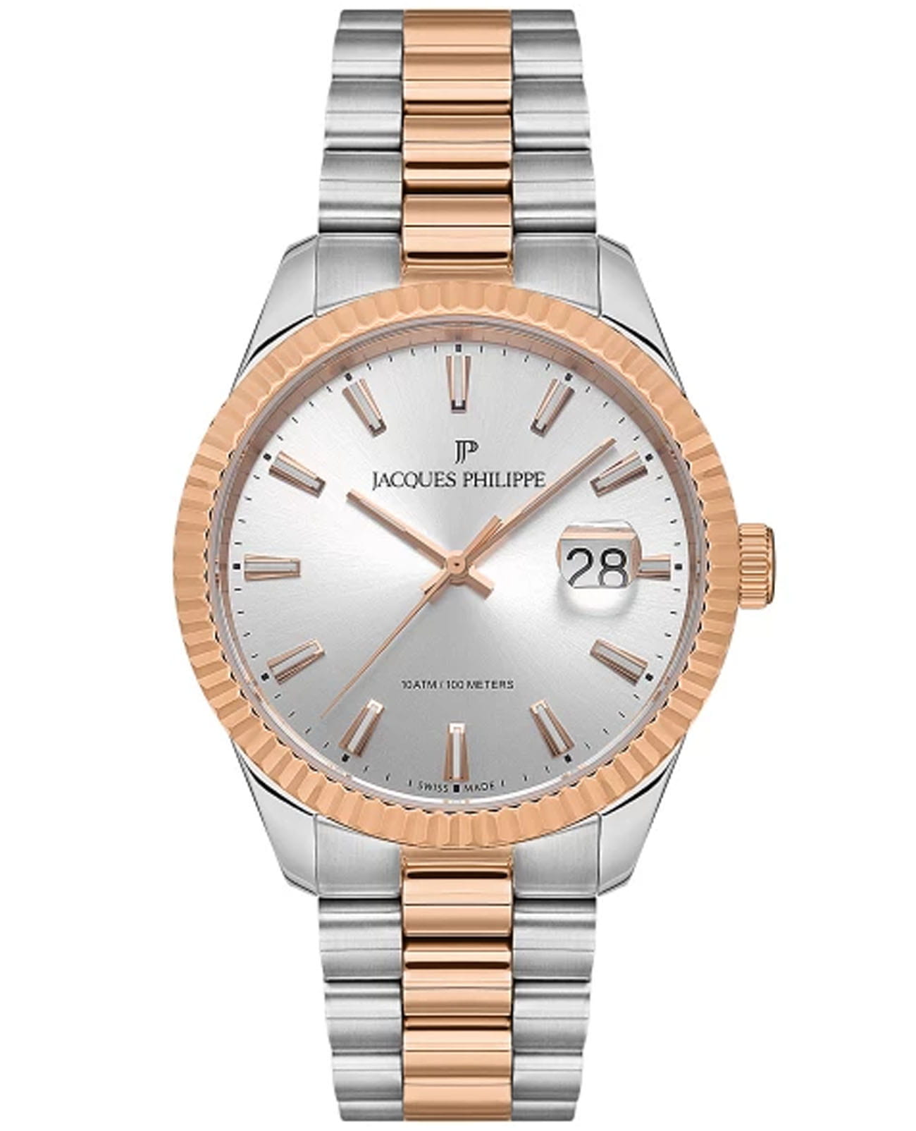 Швейцарские мужские часы Jacques Philippe Solis JPQGS237328, кварцевый механизм с высокой точностью. Сапфировое стеклоСапфировое стеклоПрочный и надёжный материал из кристалла сапфира синтетического происхождения, характеризующийся особой твёрдостью и устойчивостью к царапинам и повреждениям. устойчивое к появлению царапин, обладающее высокой прозрачностью. Корпус часов изготовлен из нержавеющей стали. Класс водозащиты: 100 метров, позволит плавать, нырять и заниматься другими водными видами спорта. Стальной браслет с частичным PVD-покрытиемPVDУльтратонкое покрытие наносится в технике вакуумного напыления, сочетает в себе нитрид титана особой прочности со слоем золота или оксида хрома. Несёт в себе декоративную или защитную функцию. на застёжке-бабочке с кнопкамиЗастёжка "бабочка"Такой вид застёжки дополняется предохранителями, помогающими избежать случайного раскрытия браслета. Обладают изящным исполнением. . Окошко даты находится в положении 3 часа. Стрелки и метки с люминесцентным покрытиемЛюминесцентное покрытиеПозволяет считывать показания времени в темноте. Производители наносят на стрелки, часовые индексы, безель или поверхность циферблата светонакопительный состав, дающий холодное свечение.. БезельБезельВнешний ободок, закрепляющий стекло. В спортивных часах так называется поворотное кольцо с делениями на циферблате, выполняет роль таймера – замеряет отрезки времени на шкале. Неподвижный безель – элемент декора. Однонаправленно вращающийся безель на дайверских часах позволяет фиксировать моменты погружения и выныривания на поверхность. с PVD-покрытиемPVDУльтратонкое покрытие наносится в технике вакуумного напыления, сочетает в себе нитрид титана особой прочности со слоем золота или оксида хрома. Несёт в себе декоративную или защитную функцию..