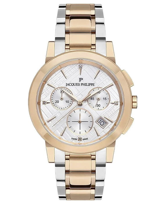 Швейцарские женские часы c хронографомХронографФункция позволяет измерять отрезки времени с особой точностью: часы, минуты, секунды. Верным признаком хронографа является наличие на циферблате 3 дополнительных окошек-счётчиков. Jacques Philippe Cosmos JPQLC323328N, кварцевый механизм с высокой точностью. Сапфировое стеклоСапфировое стеклоПрочный и надёжный материал из кристалла сапфира синтетического происхождения, характеризующийся особой твёрдостью и устойчивостью к царапинам и повреждениям. устойчивое к появлению царапин, обладающее высокой прозрачностью. Корпус часов изготовлен из нержавеющей стали с PVD-покрытиемPVDУльтратонкое покрытие наносится в технике вакуумного напыления, сочетает в себе нитрид титана особой прочности со слоем золота или оксида хрома. Несёт в себе декоративную или защитную функцию.. Класс водозащиты: 50 метров, позволит защитить корпус от случайных брызг или капель дождя. Стальной браслет с PVD-покрытиемPVDУльтратонкое покрытие наносится в технике вакуумного напыления, сочетает в себе нитрид титана особой прочности со слоем золота или оксида хрома. Несёт в себе декоративную или защитную функцию. на застёжке-бабочке с кнопкамиЗастёжка "бабочка"Такой вид застёжки дополняется предохранителями, помогающими избежать случайного раскрытия браслета. Обладают изящным исполнением. . Окошко даты находится в положении между 4 и 5 часов. Циферблат инкрустирован кристаллами.
