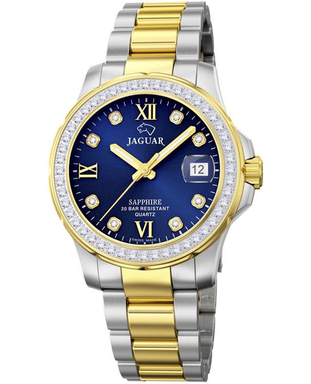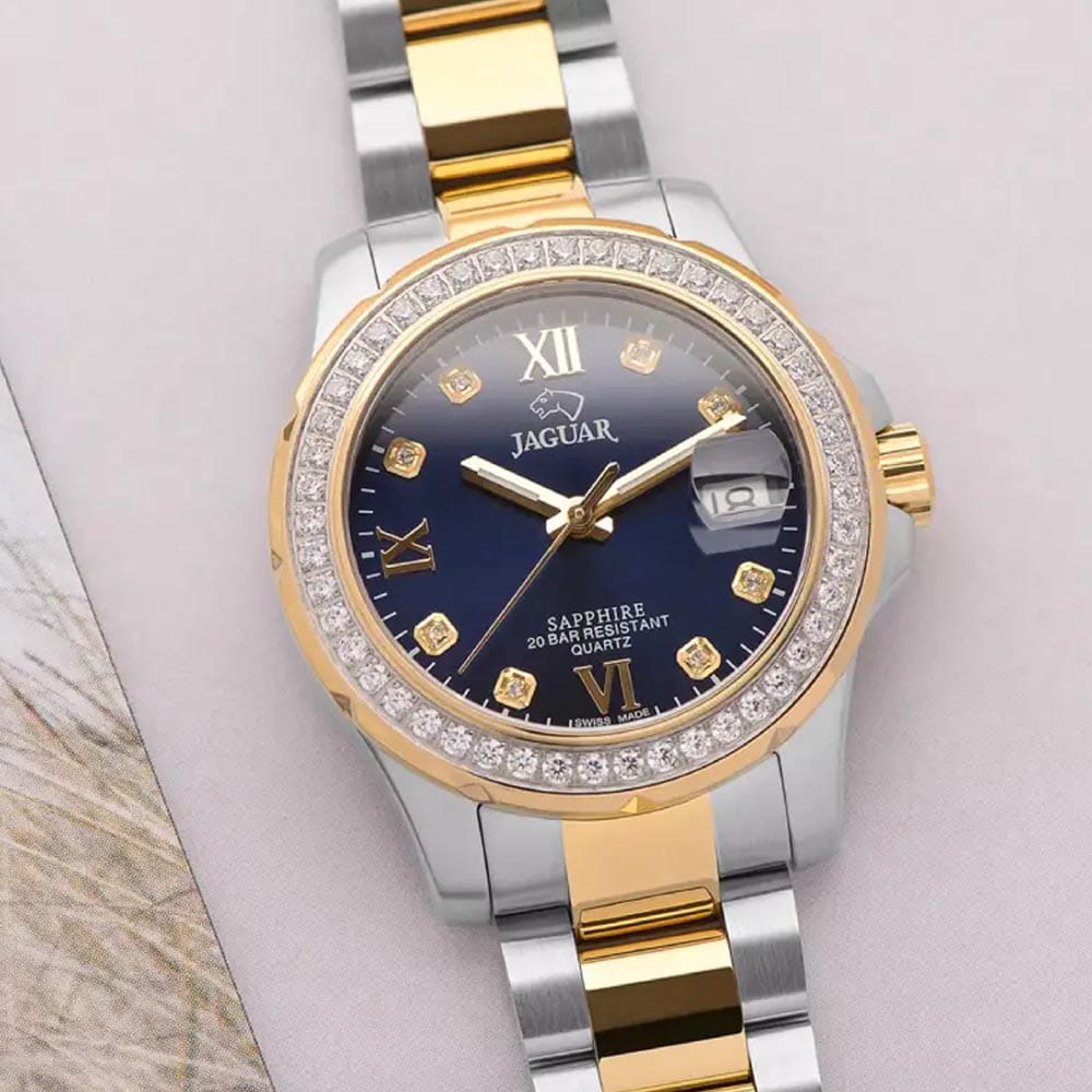 Женские швейцарские часы Jaguar Woman J893/2. Кварцевый швейцарский калибр Ronda 705. Сапфировое стеклоСапфировое стеклоПрочный и надёжный материал из кристалла сапфира синтетического происхождения, характеризующийся особой твёрдостью и устойчивостью к царапинам и повреждениям. устойчивое к мелким механическим повреждениям. Корпус и браслет часов изготовлены из нержавеющей стали, с безелем, инкрустированным цирконием. Стрелки с люминесцентным покрытиемЛюминесцентное покрытиеПозволяет считывать показания времени в темноте. Производители наносят на стрелки, часовые индексы, безель или поверхность циферблата светонакопительный состав, дающий холодное свечение.. Окошко даты находится в положении 3 часа. Класс водозащиты: 200 метров, позволит плавать, нырять и заниматься другими водными видами спорта. Стальной браслет с частичным PVD-покрытиемPVDУльтратонкое покрытие наносится в технике вакуумного напыления, сочетает в себе нитрид титана особой прочности со слоем золота или оксида хрома. Несёт в себе декоративную или защитную функцию. на раскладной застёжкеРаскладная застёжкаТакой тип застёжки используется только на браслетах из металла. Она никогда не раскрывается полностью, происходит разделение на 2 и более частей. Раскладывающая застёжка снизит вероятность потери часов к минимуму.. Циферблат украшен кристаллами в роли часовых индексов. БезельБезельВнешний ободок, закрепляющий стекло. В спортивных часах так называется поворотное кольцо с делениями на циферблате, выполняет роль таймера – замеряет отрезки времени на шкале. Неподвижный безель – элемент декора. Однонаправленно вращающийся безель на дайверских часах позволяет фиксировать моменты погружения и выныривания на поверхность. с PVD-покрытиемPVDУльтратонкое покрытие наносится в технике вакуумного напыления, сочетает в себе нитрид титана особой прочности со слоем золота или оксида хрома. Несёт в себе декоративную или защитную функцию. инкрустирован кристаллами.