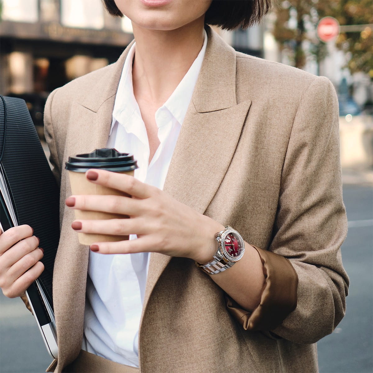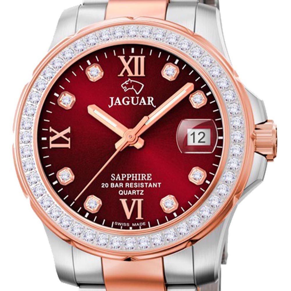 Женские швейцарские часы Jaguar Woman J894/3. Кварцевый швейцарский калибр Ronda 705. Сапфировое стеклоСапфировое стеклоПрочный и надёжный материал из кристалла сапфира синтетического происхождения, характеризующийся особой твёрдостью и устойчивостью к царапинам и повреждениям. устойчивое к мелким механическим повреждениям. Корпус и браслет часов изготовлены из нержавеющей стали, с безелем, инкрустированным цирконием. Стрелки с люминесцентным покрытиемЛюминесцентное покрытиеПозволяет считывать показания времени в темноте. Производители наносят на стрелки, часовые индексы, безель или поверхность циферблата светонакопительный состав, дающий холодное свечение.. Окошко даты находится в положении 3 часа. Класс водозащиты: 200 метров, позволит плавать, нырять и заниматься другими водными видами спорта. Стальной браслет с частичным PVD-покрытиемPVDУльтратонкое покрытие наносится в технике вакуумного напыления, сочетает в себе нитрид титана особой прочности со слоем золота или оксида хрома. Несёт в себе декоративную или защитную функцию. на раскладной застёжкеРаскладная застёжкаТакой тип застёжки используется только на браслетах из металла. Она никогда не раскрывается полностью, происходит разделение на 2 и более частей. Раскладывающая застёжка снизит вероятность потери часов к минимуму.. Циферблат украшен кристаллами в роли часовых индексов. БезельБезельВнешний ободок, закрепляющий стекло. В спортивных часах так называется поворотное кольцо с делениями на циферблате, выполняет роль таймера – замеряет отрезки времени на шкале. Неподвижный безель – элемент декора. Однонаправленно вращающийся безель на дайверских часах позволяет фиксировать моменты погружения и выныривания на поверхность. с PVD-покрытиемPVDУльтратонкое покрытие наносится в технике вакуумного напыления, сочетает в себе нитрид титана особой прочности со слоем золота или оксида хрома. Несёт в себе декоративную или защитную функцию. инкрустирован кристаллами.