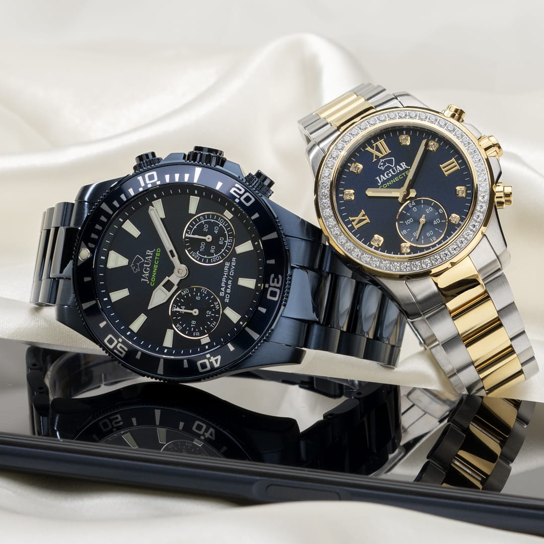 Мужские швейцарские часы Jaguar Connected J930/1. Сапфировое стеклоСапфировое стеклоПрочный и надёжный материал из кристалла сапфира синтетического происхождения, характеризующийся особой твёрдостью и устойчивостью к царапинам и повреждениям. устойчивое к мелким механическим повреждениям. Корпус часов изготовлен из нержавеющей стали с PVD-покрытиемPVDУльтратонкое покрытие наносится в технике вакуумного напыления, сочетает в себе нитрид титана особой прочности со слоем золота или оксида хрома. Несёт в себе декоративную или защитную функцию.. Стрелки и метки с люминесцентным покрытиемЛюминесцентное покрытиеПозволяет считывать показания времени в темноте. Производители наносят на стрелки, часовые индексы, безель или поверхность циферблата светонакопительный состав, дающий холодное свечение.. Календарь находится в положении 8 часов. Класс водозащиты: 200 метров, позволит плавать, нырять и заниматься другими водными видами спорта. Стальной браслет с PVD-покрытиемPVDУльтратонкое покрытие наносится в технике вакуумного напыления, сочетает в себе нитрид титана особой прочности со слоем золота или оксида хрома. Несёт в себе декоративную или защитную функцию. на раскладной застёжкеРаскладная застёжкаТакой тип застёжки используется только на браслетах из металла. Она никогда не раскрывается полностью, происходит разделение на 2 и более частей. Раскладывающая застёжка снизит вероятность потери часов к минимуму.. БезельБезельВнешний ободок, закрепляющий стекло. В спортивных часах так называется поворотное кольцо с делениями на циферблате, выполняет роль таймера – замеряет отрезки времени на шкале. Неподвижный безель – элемент декора. Однонаправленно вращающийся безель на дайверских часах позволяет фиксировать моменты погружения и выныривания на поверхность. с PVD-покрытиемPVDУльтратонкое покрытие наносится в технике вакуумного напыления, сочетает в себе нитрид титана особой прочности со слоем золота или оксида хрома. Несёт в себе декоративную или защитную функцию.. За точный ход работы часов, из коллекции Connected, отвечает кварцевый гибридный механизм швейцарского производства со Смарт-Модулем. Данный тип механизма обеспечивает возможность подключить часы к телефону через Bluetooth и управлять большим рядом дополнительных функций на выбор с помошью приложения Jaguar. Дополнительные функции: отображение даты и дня недели, секундомер, таймер, GMT, шагомер, поиск телефона, включение/выключение звука телефона при входящих вызовах, переключение музыки, вибро-уведомления.