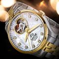 Женские швейцарские часы Jaguar Automatic Open Heart J995/1, механизм — автоподзавод. В часах с автоподзаводом заводная головка практически не используется, что исключает истирание ее материала и материала корпуса. Сапфировое стеклоСапфировое стеклоПрочный и надёжный материал из кристалла сапфира синтетического происхождения, характеризующийся особой твёрдостью и устойчивостью к царапинам и повреждениям. устойчивое к мелким механическим повреждениям. Корпус часов изготовлен из нержавеющей стали. Класс водозащиты: 50 метров, позволит защитить корпус от случайных брызг или капель дождя. Стальной браслет с частичным  PVD-покрытиемPVDУльтратонкое покрытие наносится в технике вакуумного напыления, сочетает в себе нитрид титана особой прочности со слоем золота или оксида хрома. Несёт в себе декоративную или защитную функцию. на застёжке-бабочке с кнопкамиЗастёжка "бабочка"Такой вид застёжки дополняется предохранителями, помогающими избежать случайного раскрытия браслета. Обладают изящным исполнением. . Циферблат украшен кристаллами в роли часовых индексов, крупная апертура в виде сердца, открывающая обзор на балансовое колесо механизма. БезельБезельВнешний ободок, закрепляющий стекло. В спортивных часах так называется поворотное кольцо с делениями на циферблате, выполняет роль таймера – замеряет отрезки времени на шкале. Неподвижный безель – элемент декора. Однонаправленно вращающийся безель на дайверских часах позволяет фиксировать моменты погружения и выныривания на поверхность. с PVD-покрытиемPVDУльтратонкое покрытие наносится в технике вакуумного напыления, сочетает в себе нитрид титана особой прочности со слоем золота или оксида хрома. Несёт в себе декоративную или защитную функцию..