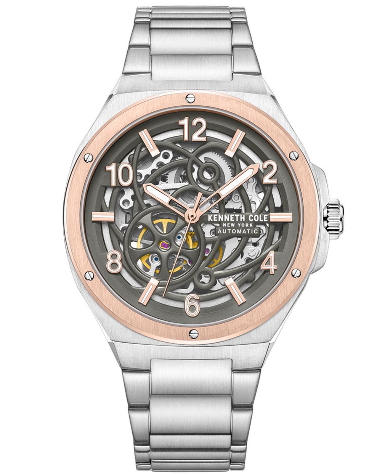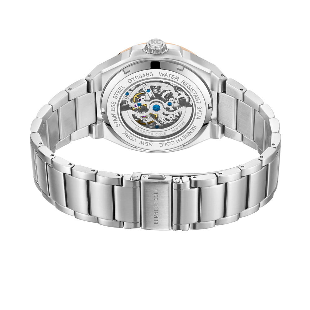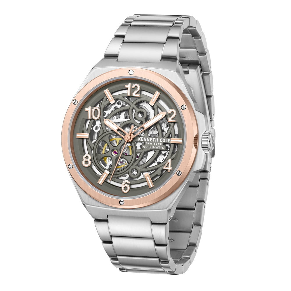 Kenneth Cole KCWGY0046303 — стильные мужские часы с автоматическим механизмом, которые сочетают современный дизайн и функциональность. Корпус диаметром 43,5 мм выполнен из нержавеющей стали, что обеспечивает прочность и долговечность. Минеральное стеклоМинеральное стеклоМинеральное стекло представляет собой искусственно выращенный минерал кварца. Такое стекло отличается особой устойчивостью к повреждениям и царапинам. Уступает по некоторым качествам сапфировому стеклу. защищает циферблат от царапин. БезельБезельВнешний ободок, закрепляющий стекло. В спортивных часах так называется поворотное кольцо с делениями на циферблате, выполняет роль таймера – замеряет отрезки времени на шкале. Неподвижный безель – элемент декора. Однонаправленно вращающийся безель на дайверских часах позволяет фиксировать моменты погружения и выныривания на поверхность. с PVD-покрытиемPVDУльтратонкое покрытие наносится в технике вакуумного напыления, сочетает в себе нитрид титана особой прочности со слоем золота или оксида хрома. Несёт в себе декоративную или защитную функцию.. Скелетонизированный циферблат позволяет наблюдать за работой механизма. Серые акценты и люминесцентные стрелкиЛюминесцентное покрытиеПозволяет считывать показания времени в темноте. Производители наносят на стрелки, часовые индексы, безель или поверхность циферблата светонакопительный состав, дающий холодное свечение. обеспечивают удобное считывание времени. Часы оснащены автоматическим механизмом, работающим без необходимости замены батареи. Водозащита до 3 ATM (30 метров) делает их подходящими для повседневного использования. Браслет из нержавеющей стали с раскладной застёжкойРаскладная застёжкаТакой тип застёжки используется только на браслетах из металла. Она никогда не раскрывается полностью, происходит разделение на 2 и более частей. Раскладывающая застёжка снизит вероятность потери часов к минимуму. гарантирует комфортное ношение и надёжную фиксацию. Kenneth Cole KCWGY0046303 — это идеальный выбор для мужчин, которые ценят стиль и инновационные технологии.