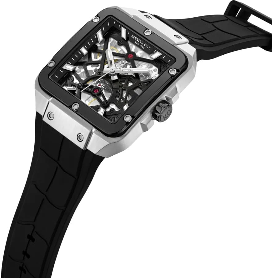 Мужские механические часы с автоподзаводом Kenneth Cole — это выразительный и элегантный аксессуар. Корпус размером 41,5 мм выполнен из нержавеющей стали 316L. БезельБезельВнешний ободок, закрепляющий стекло. В спортивных часах так называется поворотное кольцо с делениями на циферблате, выполняет роль таймера – замеряет отрезки времени на шкале. Неподвижный безель – элемент декора. Однонаправленно вращающийся безель на дайверских часах позволяет фиксировать моменты погружения и выныривания на поверхность. из нержавеющей стали с IP-покрытиемIP-покрытиеМетод ионного напыления. Демонстрирует повышенную устойчивость к истиранию, окислению и химическим веществам. Под воздействием высокого давления и температуры около 1500°C молекулы металла надёжно соединяются с частицами корпуса часов.. Циферблат чёрного цвета оформлен в стиле скелетон, что позволяет наблюдать за работой механизма. Циферблат защищён минеральным стекломМинеральное стеклоМинеральное стекло представляет собой искусственно выращенный минерал кварца. Такое стекло отличается особой устойчивостью к повреждениям и царапинам. Уступает по некоторым качествам сапфировому стеклу.. Механизм — автоматический с функцией подзавода от движения руки. Прозрачная задняя крышка открывает вид на механизм. Часы оснащены силиконовым ремешком с стандартной застёжкой. Водонепроницаемость 50 м позволяет использовать часы в повседневных условиях. Идеальный выбор для тех, кто ценит стиль, технологии и американское качество.