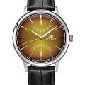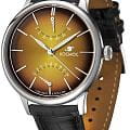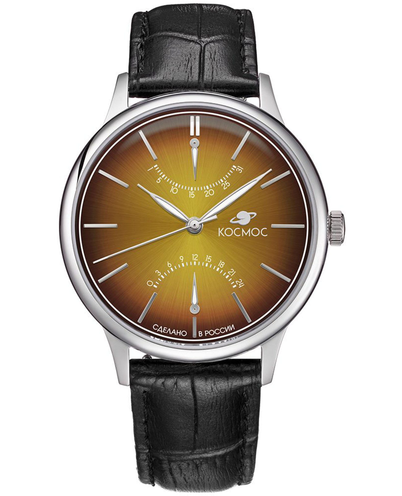 Мужские наручные часы Космос Космопорт K 058.11.37 — это сочетание традиций часового искусства 60-70-х годов и футуристического дизайна, вдохновленного космическими исследованиями. Они не только служат напоминанием о прошлом, но и побуждают задуматься о будущем, позволяя наслаждаться качеством и смыслом, вложенными в каждую деталь. Полированный корпус часов выполнен в виде силуэта летающей тарелки благодаря выпуклым формам стекла и нижней части корпуса. Стальные ушки, которые напоминают опоры летающей тарелки, завершает общий образ. На задней крышке часов выгравирован фантазийный сюжет – космическая станция будущего. Циферблат желтого цвета выполнен в ретро стиле с закруглёнными краями, что требует применения сложной технологии производства, характерной для часов прошлых лет. Кончик секундной стрелки повторяет эту форму, а на выпуклом градиентном циферблате выполнена шлифовка, напоминающая солнечные лучи. Индексы, изготовленные вручную и закрепленные на двух штифтах, добавляют изысканности. Также присутствуют ретроградные индикаторы даты и второго времени (24 часа), которые возвращаются в исходное положение одним движением.  Люминесцентное покрытиеЛюминесцентное покрытиеПозволяет считывать показания времени в темноте. Производители наносят на стрелки, часовые индексы, безель или поверхность циферблата светонакопительный состав, дающий холодное свечение. на часовой и минутной стрелках, а также на стрелках ретроградных индикаторов и окантовке циферблата создает эффект светящегося ореола в темноте. Форма минерального стеклаМинеральное стеклоМинеральное стекло представляет собой искусственно выращенный минерал кварца. Такое стекло отличается особой устойчивостью к повреждениям и царапинам. Уступает по некоторым качествам сапфировому стеклу., представляющего собой двояковыпуклую конструкцию, тщательно проработана. Такое стекло не искажает изображение на циферблате, потому что внутренняя поверхность остаётся плоской, создавая эффект линзы. Производственный процесс для достижения двух параллельно изогнутых поверхностей очень сложен, и требуется высокая точность, чтобы избежать повреждения стекла. Ремешок из черной натуральной кожи оснащён креплениями, которые позволяют легко снимать и надевать его без использования дополнительных инструментов. Заводная головка, застежка и ремешок украшены фирменным логотипом, что подчеркивает индивидуальность и стиль этих часов.