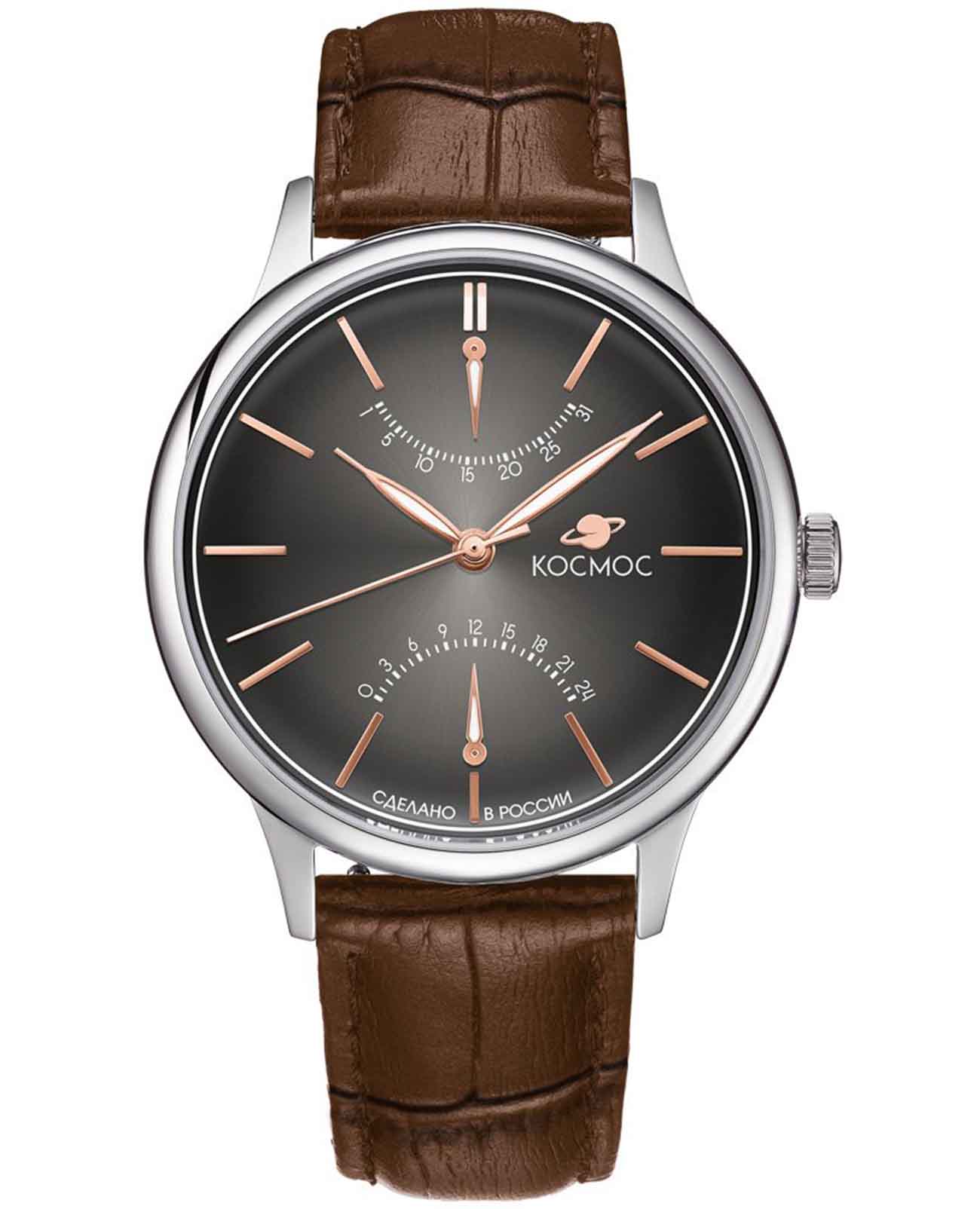 Российские мужские кварцевые часы Космос K 058.12.34 из коллекции Космопорт оснащены корпусом из нержавеющей стали 316L диаметром 41 мм и защищены минеральным стекломМинеральное стеклоМинеральное стекло представляет собой искусственно выращенный минерал кварца. Такое стекло отличается особой устойчивостью к повреждениям и царапинам. Уступает по некоторым качествам сапфировому стеклу., выпуклым с обеих сторон. Циферблат дополнен функциями отображения даты и 24-часового формата времени. Индикаторы дня недели и 24 часов выполнены по принципу ретрограда: стрелка, достигнув конца отрезка, возвращается в исходное положение одним движением. Секундная стрелка выгнута, что соответствует форме циферблата. На стальной задней крышке выгравирован фантазийный сюжет о космическом будущем человека. Заводная головка декорирована логотипом бренда в виде стилизованного изображения планеты. Часы имеют водонепроницаемость 50 метров, позволит защитить корпус от случайных брызг или капель дождя.Модель комплектуется ремешком из натуральной кожи коричневого цвета с прошивкой на стандартной застежке. Специальные крепежи позволяют легко заменить ремешок на часах самостоятельно. Прочный корпус, уникальный дизайн и надежный механизм делают эти часы универсальным аксессуаром для повседневного использования, подчеркивая индивидуальность владельца.