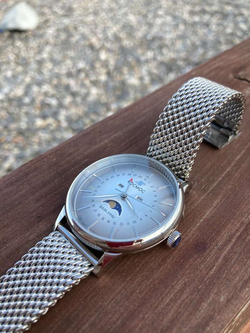 Российские мужские кварцевые часы Космос K 067.10.33 из коллекции Сатурн оснащены механизмом Miyota. Круглый корпус из нержавеющей стали 316L диаметром 41 мм и толщиной 13 мм защищен минеральным стекломМинеральное стеклоМинеральное стекло представляет собой искусственно выращенный минерал кварца. Такое стекло отличается особой устойчивостью к повреждениям и царапинам. Уступает по некоторым качествам сапфировому стеклу.. Серебристый циферблат с серыми элементами и градиентной шлифовкой в стиле солнечных лучей украшен изготовленными вручную индексами, крепящимися на двух штифтах. Часы имеют функции отображения даты центральной стрелкой, дня недели и индикатора фаз луны. Часовая, минутная стрелки, круг по краю циферблата и линия вокруг окошка индикатора фаз луны имеют люминесцентное покрытиеЛюминесцентное покрытиеПозволяет считывать показания времени в темноте. Производители наносят на стрелки, часовые индексы, безель или поверхность циферблата светонакопительный состав, дающий холодное свечение., которое светится в темноте, создавая эффект ореола вокруг Земли. На задней крышке выгравирован фантазийный сюжет — космическая станция будущего. Полированный корпус часов напоминает силуэт летающей тарелки благодаря выпуклым формам стекла и нижней части корпуса. Часы имеют водонепроницаемость 50 метров, позволит защитить корпус от случайных брызг или капель дождя. Модель комплектуется стальным браслетом миланского плетения на раскладном замкеРаскладной замокДанный вариант застежки используется только на часах с металлическим браслетом. Отличительная особенность такого крепления в том, что длина браслета становится универсальной и вы можете самостоятельно отрегулировать нужный вам размер – застежка просто двигается по браслету часов.. Эти часы сочетают в себе классический дизайн, современные технологии и футуристическое вдохновение, делая их идеальным выбором для ценителей точности и элегантности.