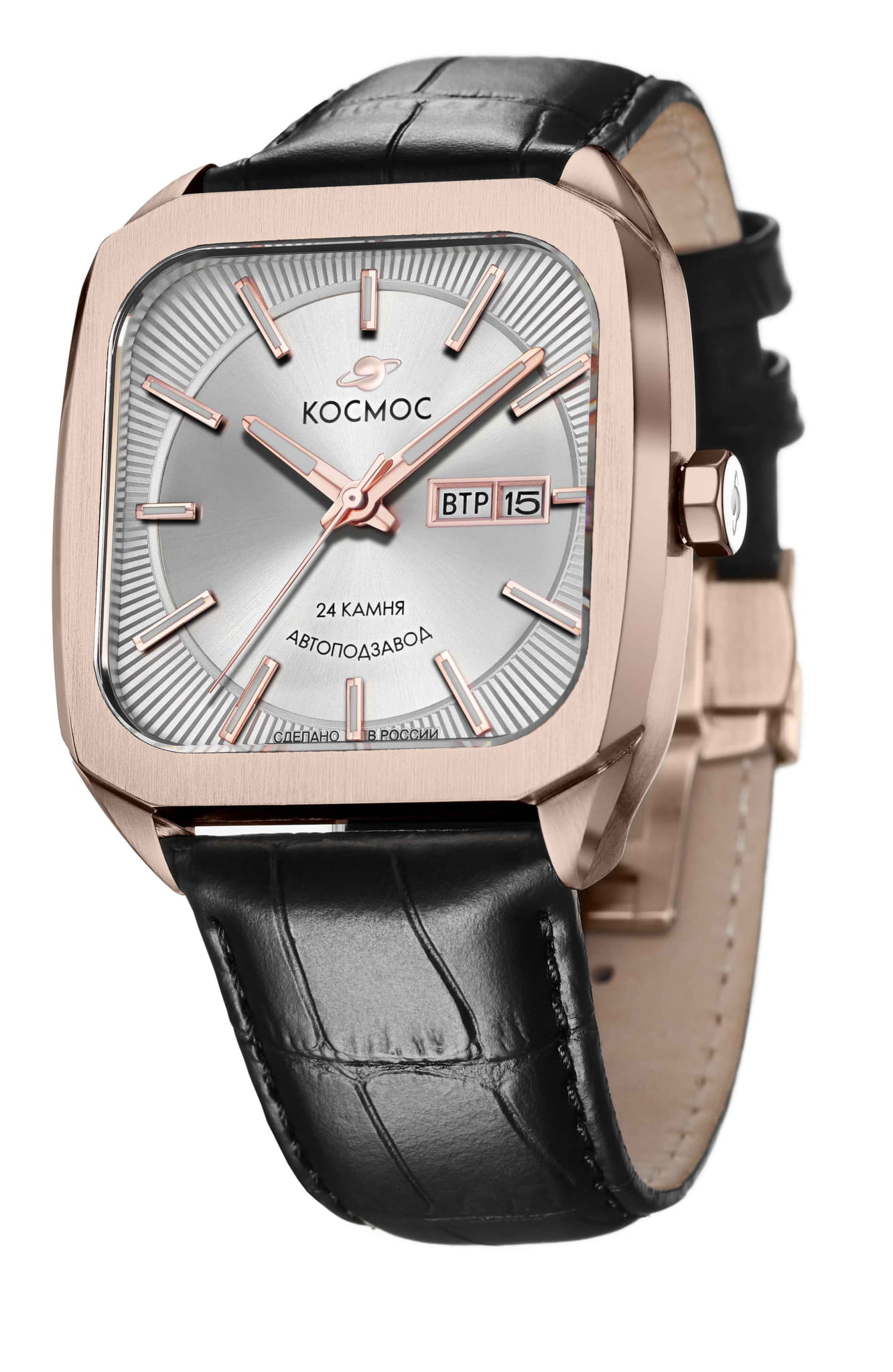 Мужские наручные часы Космос Марсоход K 213.41.33 — это уникальная лимитированная серия, посвященная аппарату, способному передвигаться по поверхности Красной планеты. Марсоход ассоциируется с брутальностью, мастерством и технической сложностью. Наша страна дважды запускала подобные аппараты еще в 70-х годах прошлого века. Дизайн часов серии Марсоход вдохновлен лучшими работами советских мастеров, сочетая современные технологии часового искусства с обаянием стиля ретро. Корпус в форме квадрата с закругленными углами выполнен из нержавеющей стали с PVDPVDУльтратонкое покрытие наносится в технике вакуумного напыления, сочетает в себе нитрид титана особой прочности со слоем золота или оксида хрома. Несёт в себе декоративную или защитную функцию. покрытием, украшенной зеркальной полировкой и сатинированием. Удобная заводная головка имеет форму гайки, что добавляет модели индустриальный шарм. Задняя крышка прозрачная, закрепленная на четырех винтах, и позволяет увидеть работу механизма TMI с подвижным ротором, на котором гравируется надпись «Сделано в России». Также здесь представлена гравировка с изображением космонавта, придающая часам особую значимость. Водостойкость достигает 10 атм (WR100), что позволяет использовать часы при плавании и других водных видах спорта. На задней крышке указан индивидуальный номер модели в формате от 01/50 до 50/50 (первый выпуск) или от 051/100 до 100/100 (второй выпуск). Объемный циферблат состоит из двух уровней. В центре движутся три стрелки, часовая и минутная из которых имеют люминесцентное покрытиеЛюминесцентное покрытиеПозволяет считывать показания времени в темноте. Производители наносят на стрелки, часовые индексы, безель или поверхность циферблата светонакопительный состав, дающий холодное свечение., позволяющее определять время даже в темноте. Индексы накладные, как и стальная рамка, выделяющая сдвоенное окошко даты и дня недели, где день недели отображается на двух языках — русском и английском. Циферблат защищен прочным сапфировым стеклом с антибликовым покрытиемСапфировое стеклоПрочный и надёжный материал из кристалла сапфира синтетического происхождения, характеризующийся особой твёрдостью и устойчивостью к царапинам и повреждениям., обеспечивающим отличную читаемость показаний в любых условиях. Кожаный ремешок оснащен удобной застёжкой «бабочка» с кнопкамиЗастёжка "бабочка"Такой вид застёжки дополняется предохранителями, помогающими избежать случайного раскрытия браслета. Обладают изящным исполнением. , которая сводит к минимуму вероятность потери. Коллекция Марсоход — идеальный выбор для ценителей истории космических достижений и современных технологий.