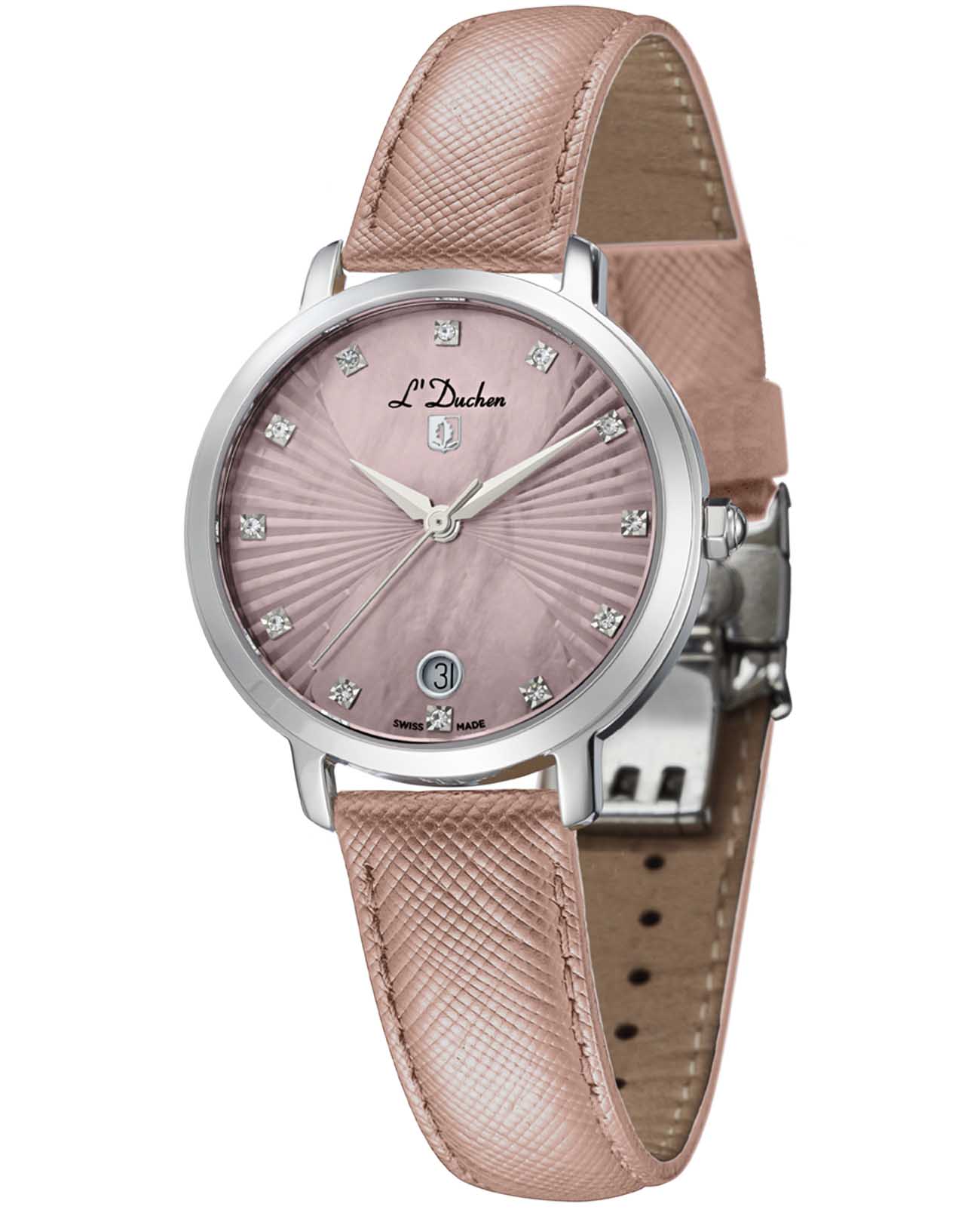 Женские швейцарские часы L'Duchen Eternity D 801.15.35, кварцевый механизм с высокой точностью. Сапфировое стеклоСапфировое стеклоПрочный и надёжный материал из кристалла сапфира синтетического происхождения, характеризующийся особой твёрдостью и устойчивостью к царапинам и повреждениям. устойчивое к появлению царапин, обладающее высокой прозрачностью. Корпус часов выполнен из нержавеющей стали. Окошко даты находится в положении 6 часов. Класс водозащиты: 50 метров, позволит защитить корпус от случайных брызг или капель дождя. Кожаный ремешок на застёжке «бабочка» с кнопкамиЗастёжка "бабочка"Такой вид застёжки дополняется предохранителями, помогающими избежать случайного раскрытия браслета. Обладают изящным исполнением. .
