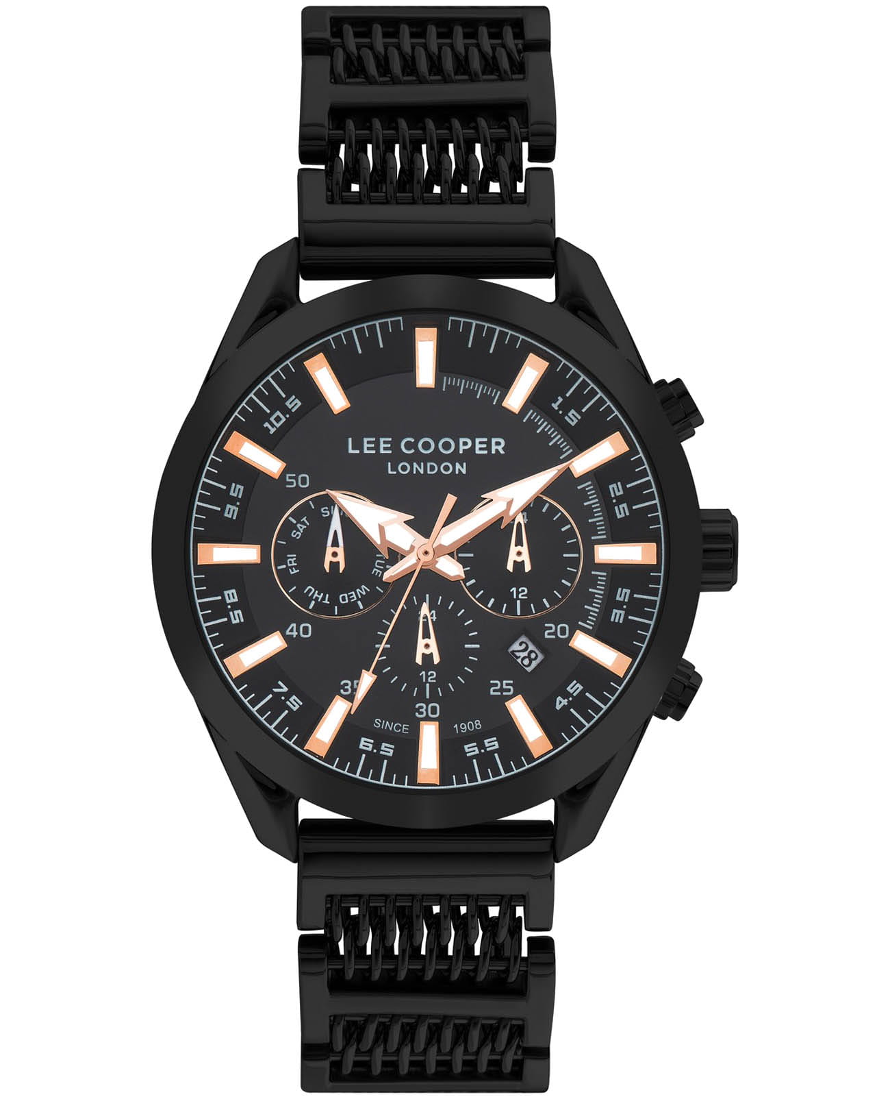Мужские часы Lee Cooper LC07556.650 — это стильное сочетание элегантности и современного дизайна. Круглый корпус диаметром 46 мм выполнен из суперметалла с IP-покрытиемIP-покрытиеМетод ионного напыления. Демонстрирует повышенную устойчивость к истиранию, окислению и химическим веществам. Под воздействием высокого давления и температуры около 1500°C молекулы металла надёжно соединяются с частицами корпуса часов. черного цвета, что придает модели особый вид. Циферблат защищен минеральным стекломМинеральное стеклоМинеральное стекло представляет собой искусственно выращенный минерал кварца. Такое стекло отличается особой устойчивостью к повреждениям и царапинам. Уступает по некоторым качествам сапфировому стеклу., обеспечивающим устойчивость к царапинам. Метки в виде штрихов. Часы оснащены надежным кварцевым механизмом, а стальной браслет с IP-покрытиемIP-покрытиеМетод ионного напыления. Демонстрирует повышенную устойчивость к истиранию, окислению и химическим веществам. Под воздействием высокого давления и температуры около 1500°C молекулы металла надёжно соединяются с частицами корпуса часов. на застёжке-бабочкеЗастёжка "бабочка"Такой вид застёжки дополняется предохранителями, помогающими избежать случайного раскрытия браслета. Обладают изящным исполнением. гарантирует комфортную посадку на запястье. Окошко даты находится в положении между 4 и 5 часов. Мультифункциональная модель с индикацией даты, дня недели, с дополнительным 24-х часовым индикатором. Стрелки и метки с люминесцентным покрытиемЛюминесцентное покрытиеПозволяет считывать показания времени в темноте. Производители наносят на стрелки, часовые индексы, безель или поверхность циферблата светонакопительный состав, дающий холодное свечение. позволяют легко считывать время даже в условиях недостаточного освещения. Водозащита 50 метров позволит защитить корпус от случайных брызг или капель дождя. Lee Cooper — отличный выбор для тех, кто ценит утонченность и качество.