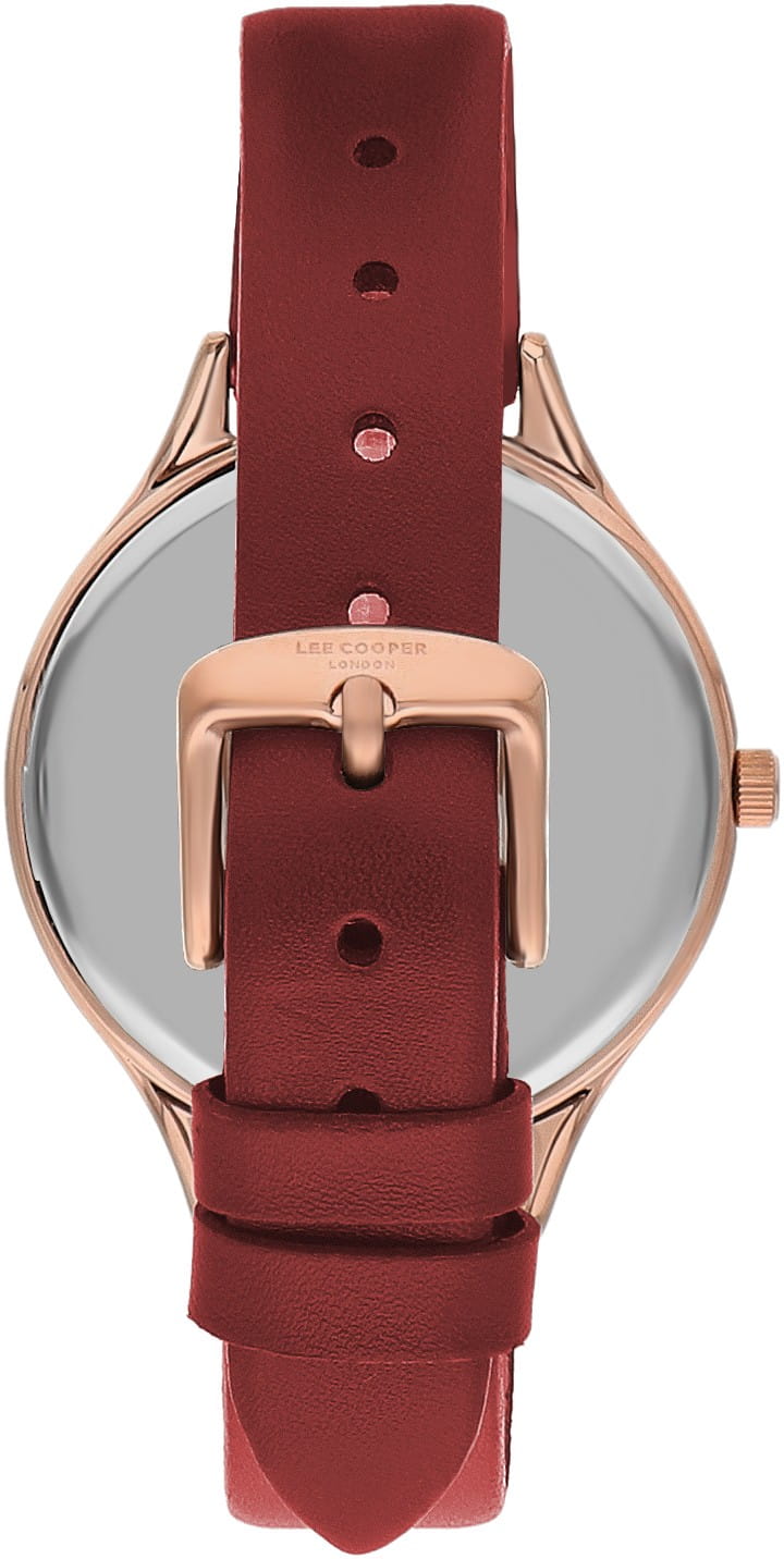 Женские часы Lee Cooper LC07567.488 — идеальное сочетание классического дизайна и современных технологий. Эти часы станут вашим верным спутником, подчеркивая вашу индивидуальность и безупречный вкус. Круглый корпус диаметром 36 мм выполнен из суперметалла с IP-покрытиемIP-покрытиеМетод ионного напыления. Демонстрирует повышенную устойчивость к истиранию, окислению и химическим веществам. Под воздействием высокого давления и температуры около 1500°C молекулы металла надёжно соединяются с частицами корпуса часов. цвета розового золота, что придает модели особый блеск. Циферблат с минималистичными метками и стрелками придает часам элегантность и утонченность, делая их идеальным аксессуаром для любой женщины, а минеральное стеклоМинеральное стеклоМинеральное стекло представляет собой искусственно выращенный минерал кварца. Такое стекло отличается особой устойчивостью к повреждениям и царапинам. Уступает по некоторым качествам сапфировому стеклу., обеспечивает устойчивость к царапинам. Часы оснащены надежным кварцевым механизмом. Кожаный ремешок на стандартной застёжке гарантирует комфортную посадку на запястье. Водозащита 30 метров защищает модель от случайных брызг и дождя. Lee Cooper  — отличный выбор для тех, кто ценит утонченность и качество.