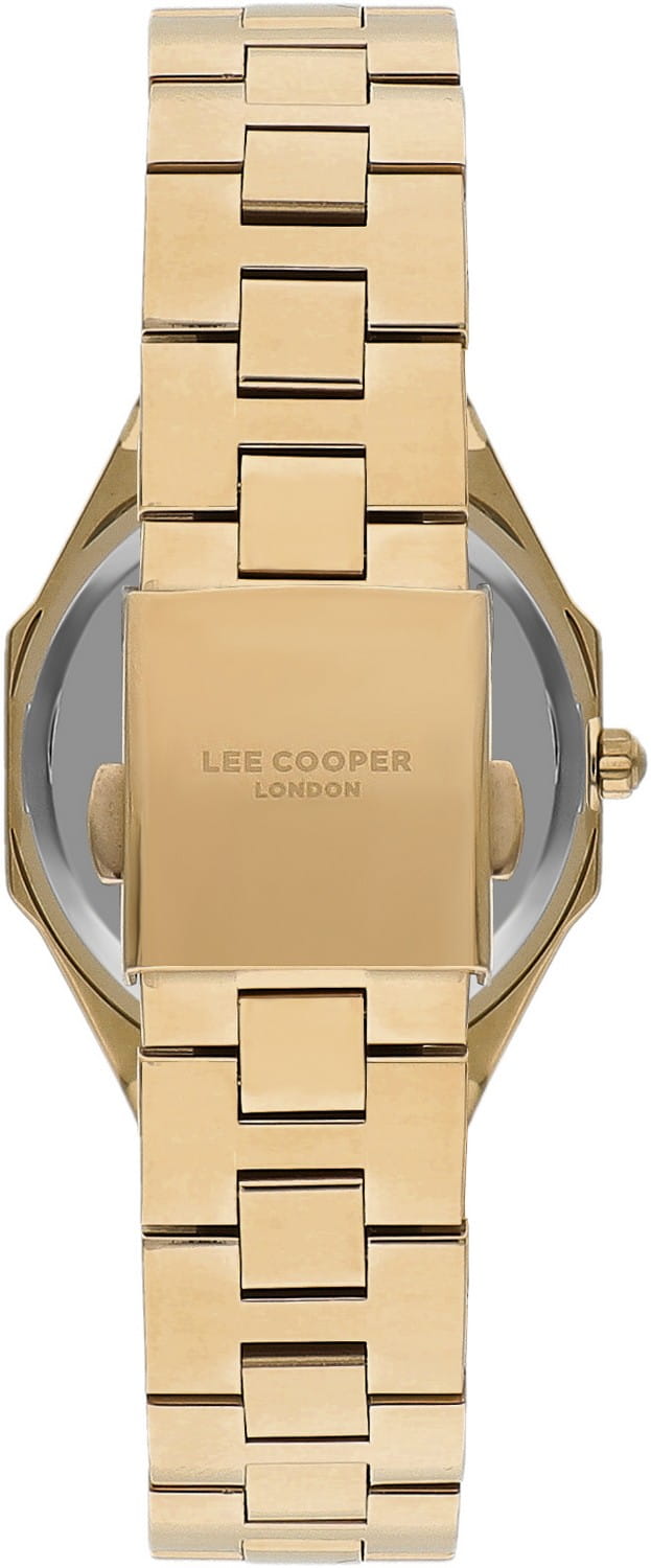 Женские часы Lee Cooper LC07599.110 — это стильное сочетание элегантности и современного дизайна. Круглый корпус диаметром 35 мм выполнен из суперметалла с IP-покрытиемIP-покрытиеМетод ионного напыления. Демонстрирует повышенную устойчивость к истиранию, окислению и химическим веществам. Под воздействием высокого давления и температуры около 1500°C молекулы металла надёжно соединяются с частицами корпуса часов. золотистого цвета. Циферблат защищен минеральным стекломМинеральное стеклоМинеральное стекло представляет собой искусственно выращенный минерал кварца. Такое стекло отличается особой устойчивостью к повреждениям и царапинам. Уступает по некоторым качествам сапфировому стеклу., обеспечивающий устойчивость к царапинам. Неподвижный безельБезельВнешний ободок, закрепляющий стекло. В спортивных часах так называется поворотное кольцо с делениями на циферблате, выполняет роль таймера – замеряет отрезки времени на шкале. Неподвижный безель – элемент декора. Однонаправленно вращающийся безель на дайверских часах позволяет фиксировать моменты погружения и выныривания на поверхность. и циферблат инкрустированы цирконами. Центральные часовая, минутная и секундная стрелки. Часы оснащены надежным кварцевым механизмом, источник питания - батарейка. Металлический браслет на раскладной застёжкеРаскладная застёжкаТакой тип застёжки используется только на браслетах из металла. Она никогда не раскрывается полностью, происходит разделение на 2 и более частей. Раскладывающая застёжка снизит вероятность потери часов к минимуму. гарантирует комфортную посадку на запястье. Водозащита 30 метров защищает модель от случайных брызг и дождя. Lee Cooper — отличный выбор для тех, кто ценит утонченность и качество.