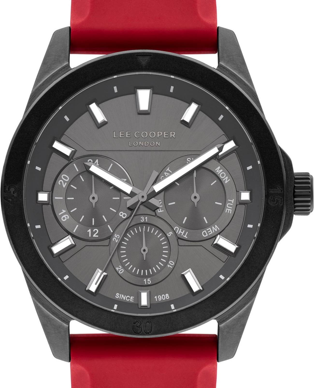 Мужские кварцевые часы Lee Cooper LC07626.668 — это мультифункциональный аксессуар с лаконичным дизайном. Корпус диаметром 46 мм выполнен из суперметалла с IP-покрытиемIP-покрытиеМетод ионного напыления. Демонстрирует повышенную устойчивость к истиранию, окислению и химическим веществам. Под воздействием высокого давления и температуры около 1500°C молекулы металла надёжно соединяются с частицами корпуса часов. в двухцветном исполнении — сером и чёрном. Циферблат серого цвета оформлен индексами и дополнен окошками даты, дня недели и 24-часового индикатора. Циферблат защищён минеральным стекломМинеральное стеклоМинеральное стекло представляет собой искусственно выращенный минерал кварца. Такое стекло отличается особой устойчивостью к повреждениям и царапинам. Уступает по некоторым качествам сапфировому стеклу.. Стрелки и метки с люминесцентным покрытиемЛюминесцентное покрытиеПозволяет считывать показания времени в темноте. Производители наносят на стрелки, часовые индексы, безель или поверхность циферблата светонакопительный состав, дающий холодное свечение., обеспечивающим хорошую читаемость в темноте. Часы оснащены каучуковым ремешком красного цвета с классической пряжкой. Водонепроницаемость 50 м позволяет использовать часы для плавания и повседневного ношения. Универсальный выбор для тех, кто ценит функциональность и надёжность.