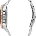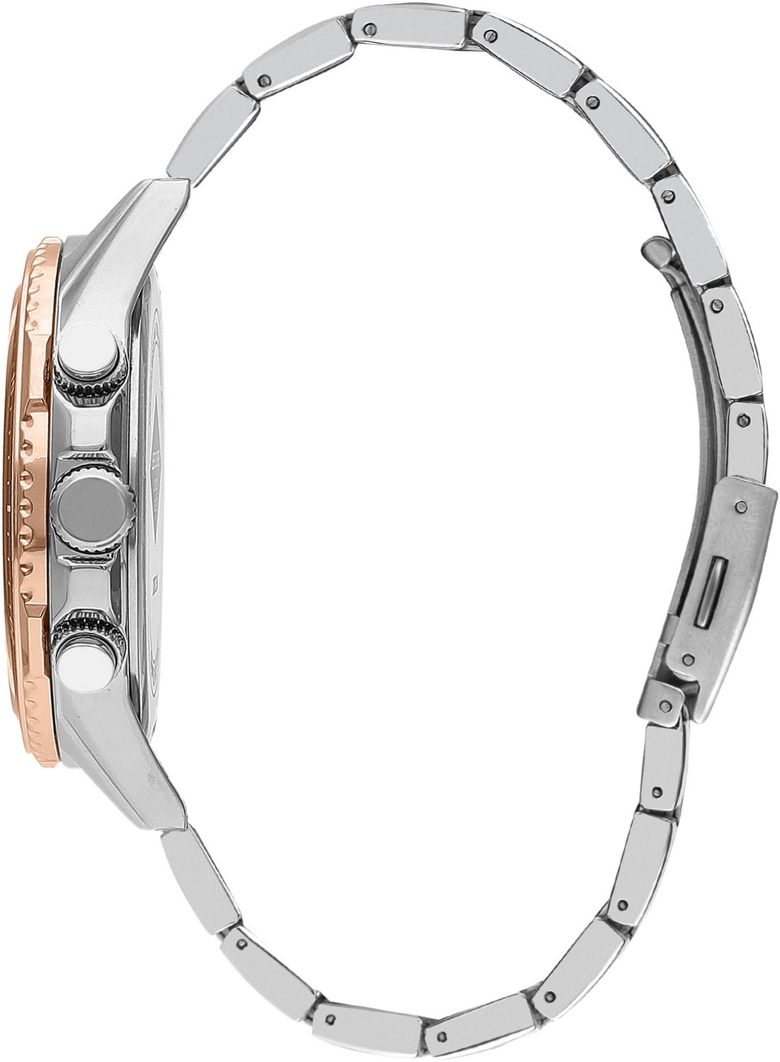 Мужские кварцевые часы Lee Cooper LC07627.540 — это мультифункциональный аксессуар с лаконичным дизайном. Корпус диаметром 46 мм выполнен из суперметалла. Безель с IP-покрытиемIP-покрытиеМетод ионного напыления. Демонстрирует повышенную устойчивость к истиранию, окислению и химическим веществам. Под воздействием высокого давления и температуры около 1500°C молекулы металла надёжно соединяются с частицами корпуса часов. в двухцветном исполнении — чёрном и розовом золоте. Циферблат коричневого цвета оформлен индексами и дополнен окошками даты, дня недели и 24-часового индикатора. Циферблат защищён минеральным стекломМинеральное стеклоМинеральное стекло представляет собой искусственно выращенный минерал кварца. Такое стекло отличается особой устойчивостью к повреждениям и царапинам. Уступает по некоторым качествам сапфировому стеклу.. Стрелки и метки с люминесцентным покрытиемЛюминесцентное покрытиеПозволяет считывать показания времени в темноте. Производители наносят на стрелки, часовые индексы, безель или поверхность циферблата светонакопительный состав, дающий холодное свечение., обеспечивающим хорошую читаемость в темноте. Часы оснащены двухцветным стальным браслетом с IP-покрытиемIP-покрытиеМетод ионного напыления. Демонстрирует повышенную устойчивость к истиранию, окислению и химическим веществам. Под воздействием высокого давления и температуры около 1500°C молекулы металла надёжно соединяются с частицами корпуса часов. на раскладной застёжкеРаскладная застёжкаТакой тип застёжки используется только на браслетах из металла. Она никогда не раскрывается полностью, происходит разделение на 2 и более частей. Раскладывающая застёжка снизит вероятность потери часов к минимуму.. Водонепроницаемость 50 м позволяет использовать часы для плавания и повседневного ношения. Универсальный выбор для тех, кто ценит функциональность и стиль.