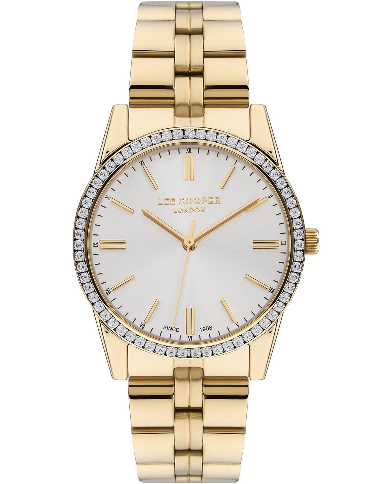 Женские наручные часы Lee Cooper LC07679.130 — это элегантная модель с утончённым дизайном. Корпус диаметром 35 мм выполнен из суперметалла с IP-покрытиемIP-покрытиеМетод ионного напыления. Демонстрирует повышенную устойчивость к истиранию, окислению и химическим веществам. Под воздействием высокого давления и температуры около 1500°C молекулы металла надёжно соединяются с частицами корпуса часов., что придаёт часам изысканный вид. Лаконичный циферблат украшен изящными метками и стрелками, обеспечивая удобное считывание времени. Циферблат защищён минеральным стекломМинеральное стеклоМинеральное стекло представляет собой искусственно выращенный минерал кварца. Такое стекло отличается особой устойчивостью к повреждениям и царапинам. Уступает по некоторым качествам сапфировому стеклу., устойчивым к царапинам. Изысканный безельБезельВнешний ободок, закрепляющий стекло. В спортивных часах так называется поворотное кольцо с делениями на циферблате, выполняет роль таймера – замеряет отрезки времени на шкале. Неподвижный безель – элемент декора. Однонаправленно вращающийся безель на дайверских часах позволяет фиксировать моменты погружения и выныривания на поверхность. украшен вставками из циркония.