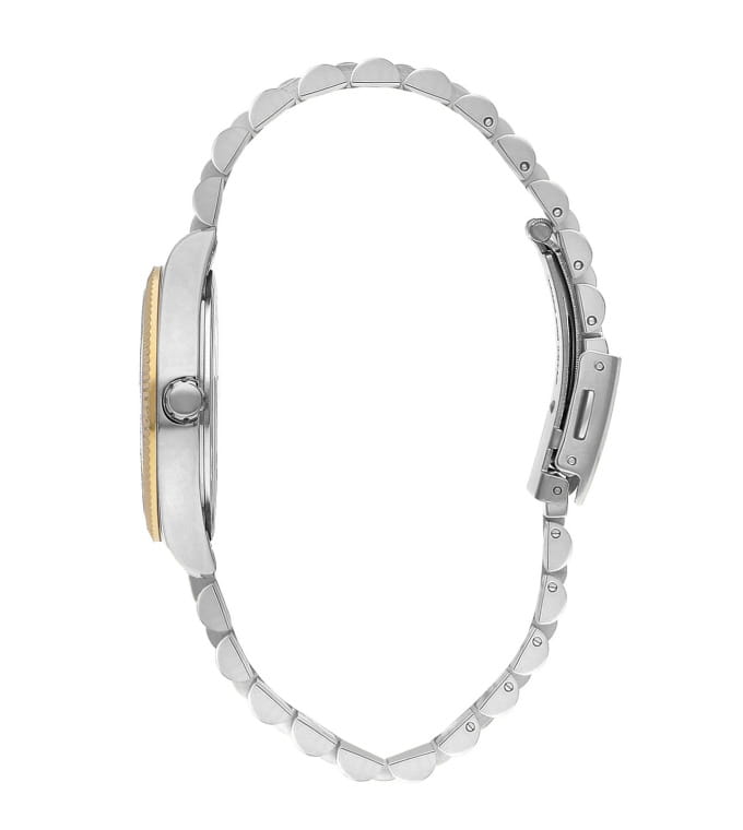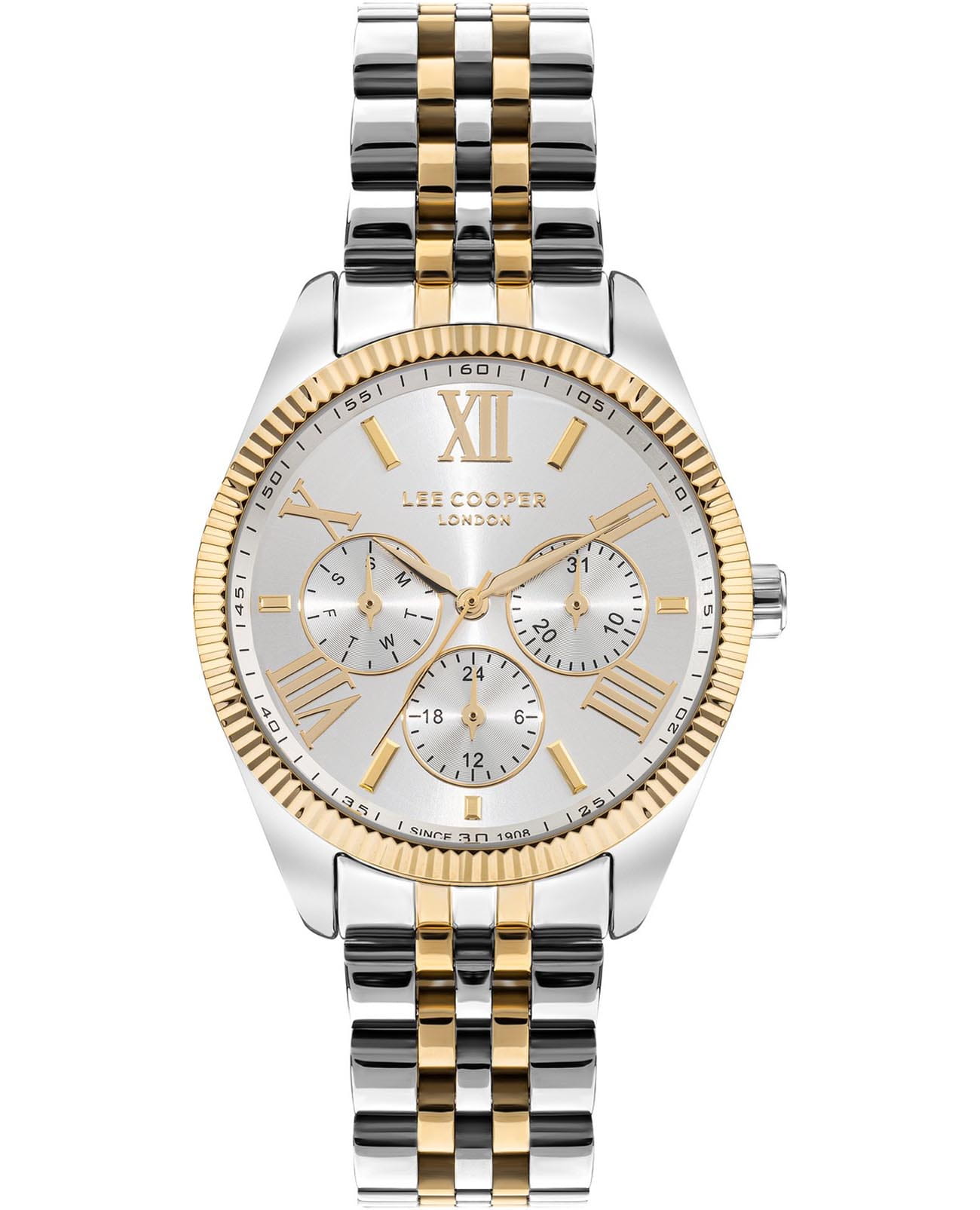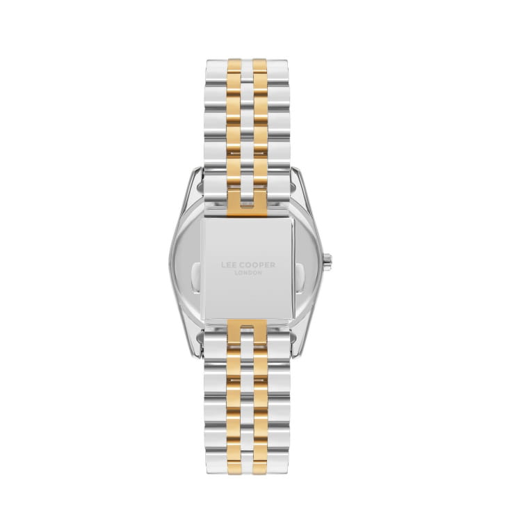 Женские часы Lee Cooper LC07811.230 — это стильное сочетание элегантности и современного дизайна. Корпус диаметром 37 мм выполнен из суперметалла серебристого цвета, придающий модели особый блеск. Неподвижный безельБезельВнешний ободок, закрепляющий стекло. В спортивных часах так называется поворотное кольцо с делениями на циферблате, выполняет роль таймера – замеряет отрезки времени на шкале. Неподвижный безель – элемент декора. Однонаправленно вращающийся безель на дайверских часах позволяет фиксировать моменты погружения и выныривания на поверхность. с IP-покрытиемIP-покрытиеМетод ионного напыления. Демонстрирует повышенную устойчивость к истиранию, окислению и химическим веществам. Под воздействием высокого давления и температуры около 1500°C молекулы металла надёжно соединяются с частицами корпуса часов. цвета золота. Изысканный циферблат защищен минеральным стекломМинеральное стеклоМинеральное стекло представляет собой искусственно выращенный минерал кварца. Такое стекло отличается особой устойчивостью к повреждениям и царапинам. Уступает по некоторым качествам сапфировому стеклу., обеспечивающим устойчивость к царапинам. Метки в виде римских цифр. Вынесенный циферблат с 24-х часовым указателем времени, индикацией даты и дня недели. Часы оснащены надежным кварцевым механизмом, а стальной браслет с частичным IP-покрытиемIP-покрытиеМетод ионного напыления. Демонстрирует повышенную устойчивость к истиранию, окислению и химическим веществам. Под воздействием высокого давления и температуры около 1500°C молекулы металла надёжно соединяются с частицами корпуса часов. на раскладной застёжкеРаскладная застёжкаТакой тип застёжки используется только на браслетах из металла. Она никогда не раскрывается полностью, происходит разделение на 2 и более частей. Раскладывающая застёжка снизит вероятность потери часов к минимуму. гарантирует комфортную посадку на запястье. Водозащита 50 метров защищает модель от случайных брызг и дождя. Lee Cooper — отличный выбор для тех, кто ценит утонченность и качество.