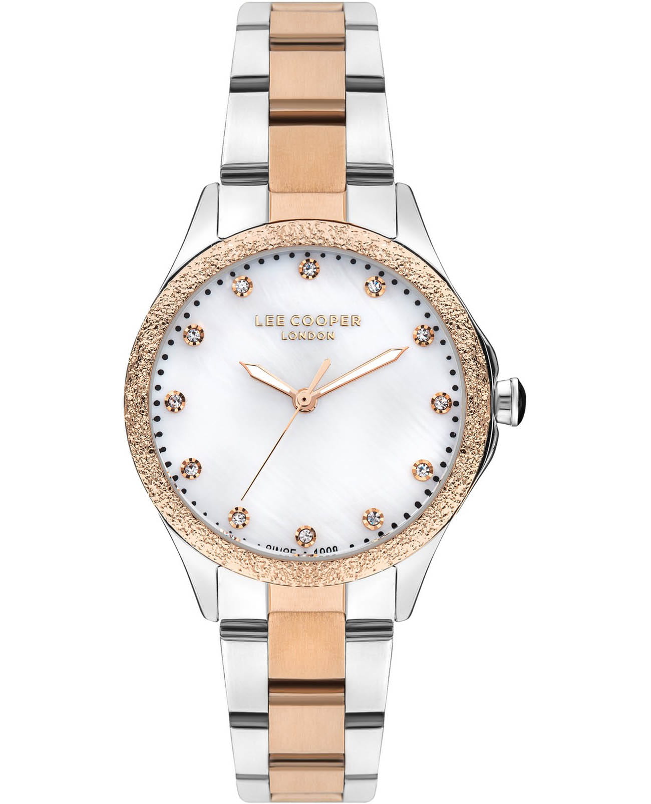 Женские наручные часы Lee Cooper LC07840.520 — это элегантная модель с утончённым дизайном. Корпус диаметром 35 мм выполнен из суперметалла с безелемБезельВнешний ободок, закрепляющий стекло. В спортивных часах так называется поворотное кольцо с делениями на циферблате, выполняет роль таймера – замеряет отрезки времени на шкале. Неподвижный безель – элемент декора. Однонаправленно вращающийся безель на дайверских часах позволяет фиксировать моменты погружения и выныривания на поверхность. с IP-покрытиемIP-покрытиеМетод ионного напыления. Демонстрирует повышенную устойчивость к истиранию, окислению и химическим веществам. Под воздействием высокого давления и температуры около 1500°C молекулы металла надёжно соединяются с частицами корпуса часов., что придаёт часам изысканный вид. Перламутровый циферблат украшен изящными вставками из циркония в виде меток времени и стрелками, обеспечивая удобное считывание времени. Циферблат защищён минеральным стекломМинеральное стеклоМинеральное стекло представляет собой искусственно выращенный минерал кварца. Такое стекло отличается особой устойчивостью к повреждениям и царапинам. Уступает по некоторым качествам сапфировому стеклу., устойчивым к царапинам. Часы работают на кварцевом механизме, обеспечивая точность хода. Часовая и минутная стрелки с люминесцентным покрытиемЛюминесцентное покрытиеПозволяет считывать показания времени в темноте. Производители наносят на стрелки, часовые индексы, безель или поверхность циферблата светонакопительный состав, дающий холодное свечение.. Браслет из нержавеющей стали с частичным IP-покрытиемIP-покрытиеМетод ионного напыления. Демонстрирует повышенную устойчивость к истиранию, окислению и химическим веществам. Под воздействием высокого давления и температуры около 1500°C молекулы металла надёжно соединяются с частицами корпуса часов. с раскладной застёжкойРаскладная застёжкаТакой тип застёжки используется только на браслетах из металла. Она никогда не раскрывается полностью, происходит разделение на 2 и более частей. Раскладывающая застёжка снизит вероятность потери часов к минимуму. гарантирует комфортное ношение и надёжную фиксацию на запястье. Водозащита 30 метров защищает часы от случайных брызг и дождя, делая их подходящими для повседневного использования.
