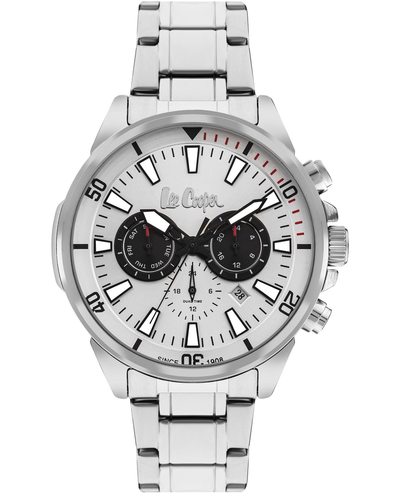 Мужские наручные часы Lee Cooper LC07846.330 оснащены кварцевым механизмом, обеспечивающий высокую точность хода и надежность. Элегантный корпус часов выполнен из суперметалла серебристого цвета, что делает их устойчивыми к внешним воздействиям и придает благородный вид. Циферблат украшен стрелками и метками с люминесцентным покрытиемЛюминесцентное покрытиеПозволяет считывать показания времени в темноте. Производители наносят на стрелки, часовые индексы, безель или поверхность циферблата светонакопительный состав, дающий холодное свечение., гармонично дополняющим общий дизайн модели. Для защиты циферблата используется минеральное стеклоМинеральное стеклоМинеральное стекло представляет собой искусственно выращенный минерал кварца. Такое стекло отличается особой устойчивостью к повреждениям и царапинам. Уступает по некоторым качествам сапфировому стеклу., устойчивое к царапинам и механическим повреждениям. Корпус имеет круглую форму диаметром 46 мм, что делает часы заметными и подходящими. Браслет из стали оснащен раскладной застёжкойРаскладная застёжкаТакой тип застёжки используется только на браслетах из металла. Она никогда не раскрывается полностью, происходит разделение на 2 и более частей. Раскладывающая застёжка снизит вероятность потери часов к минимуму., обеспечивающим комфортное и безопасное ношение. Вынесенный циферблат с 24-х часовым указателем времени, дня недели и вторым часовым поясомВторой часовой поясФункция, позволяющая отображать время двух часовых поясов одновременно.. Окошко даты находится в положении между 4 и 5 часов. Часы обладают водонепроницаемостью до 50 метров (5 АТМ), что позволяет использовать их в повседневной жизни, включая контакт с водой при мытье рук или дожде. Эти часы станут идеальным выбором для мужчин, ценящих стиль, качество и функциональность.