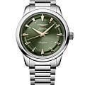 Циферблат глубокого зелёного оттенка оформлен с сатинированной отделкой «солнечные лучи» и украшен накладными индексами и стрелками с покрытием Swiss Super‑LumiNova. Для защиты от повреждений и чёткого отображения показаний используется куполообразное сапфировое стеклоСапфировое стеклоПрочный и надёжный материал из кристалла сапфира синтетического происхождения, характеризующийся особой твёрдостью и устойчивостью к царапинам и повреждениям. с антибликовым покрытием.
