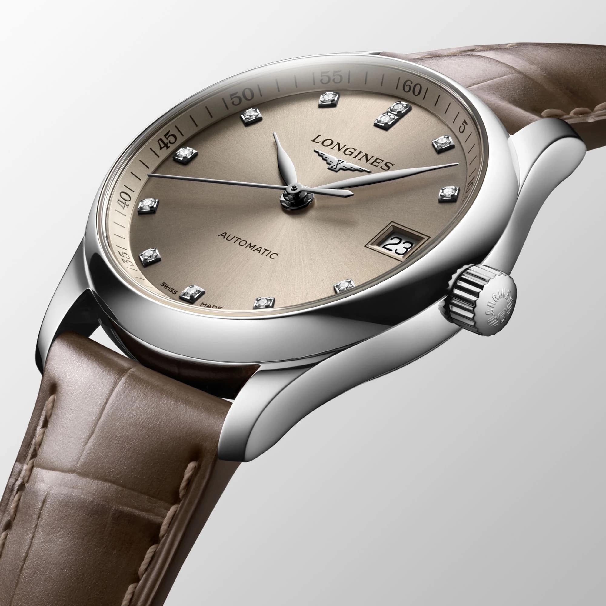 Швейцарские механические часы Longines Master Collection L2.357.4.07.2. Сапфировое стеклоСапфировое стеклоПрочный и надёжный материал из кристалла сапфира синтетического происхождения, характеризующийся особой твёрдостью и устойчивостью к царапинам и повреждениям. устойчивое к появлению царапин, обладающее высокой прозрачностью. Корпус часов изготовлен из нержавеющей стали. Циферблат с 12 бриллиантами группы Top Wesselton VS-SI общим весом 0.055 карата. Окошко даты в положении 3 часа. Автоматический механизм с частотой баланса 25 200 полуколебаний в час и запасом хода, которого хватает примерно на 72 часа работы. Класс водозащиты: 30 метров, позволит защитить корпус от случайных брызг или капель дождя. Ремешок из кожи аллигатора на застёжке «бабочка» с кнопкамиЗастёжка "бабочка"Такой вид застёжки дополняется предохранителями, помогающими избежать случайного раскрытия браслета. Обладают изящным исполнением. .