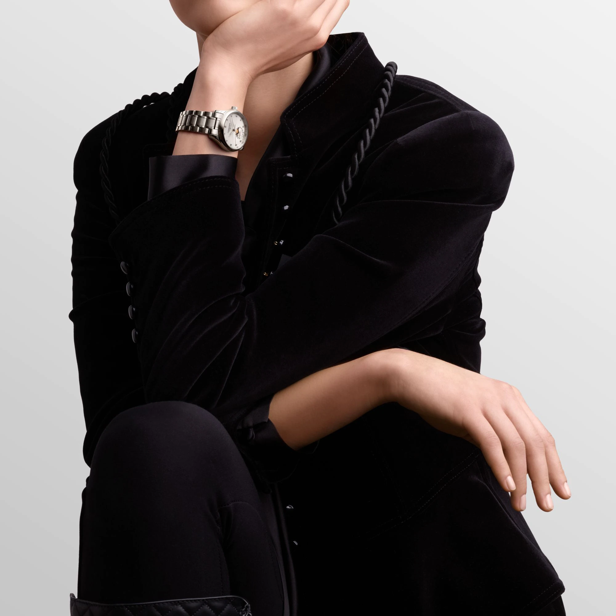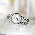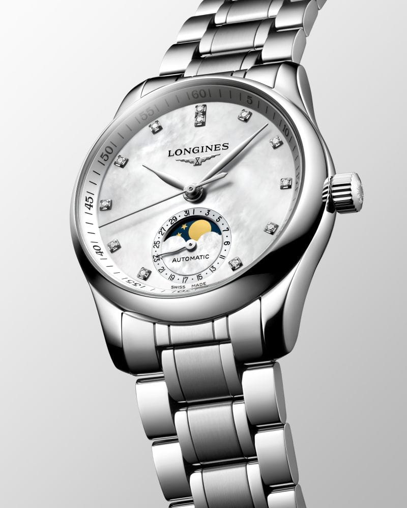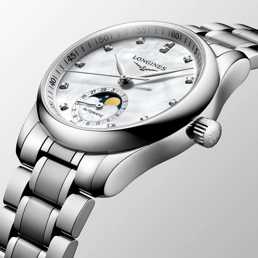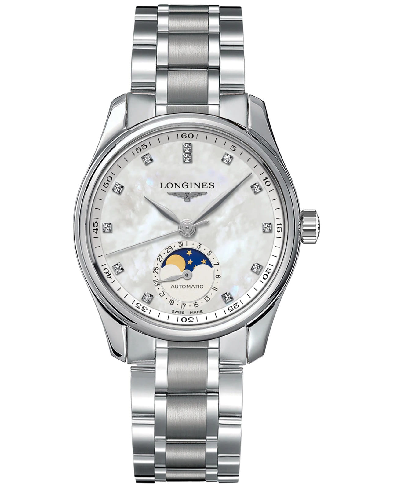 Женские швейцарские механические часы с автоподзаводом Longines Master Collection L2.409.4.87.6. Сапфировое стеклоСапфировое стеклоПрочный и надёжный материал из кристалла сапфира синтетического происхождения, характеризующийся особой твёрдостью и устойчивостью к царапинам и повреждениям. устойчивое к появлению царапин, обладающее высокой прозрачностью. Корпус часов изготовлен из нержавеющей стали. Циферблат с 12 бриллиантами группы Top Wesselton VS-SI общим весом 0.055 карата. Автоматический механизм с частотой баланса 25 200 полуколебаний в час и запасом хода, которого хватает примерно на 72 часа работы. Часы, минуты, секунды, маленький стрелочный указатель фаз Луны и даты в положении 6 часов. Прозрачная задняя крышка. Класс водозащиты: 30 метров, позволит защитить корпус от случайных брызг или капель дождя. Стальной браслет на застёжке «бабочка» с кнопкамиЗастёжка "бабочка"Такой вид застёжки дополняется предохранителями, помогающими избежать случайного раскрытия браслета. Обладают изящным исполнением. .