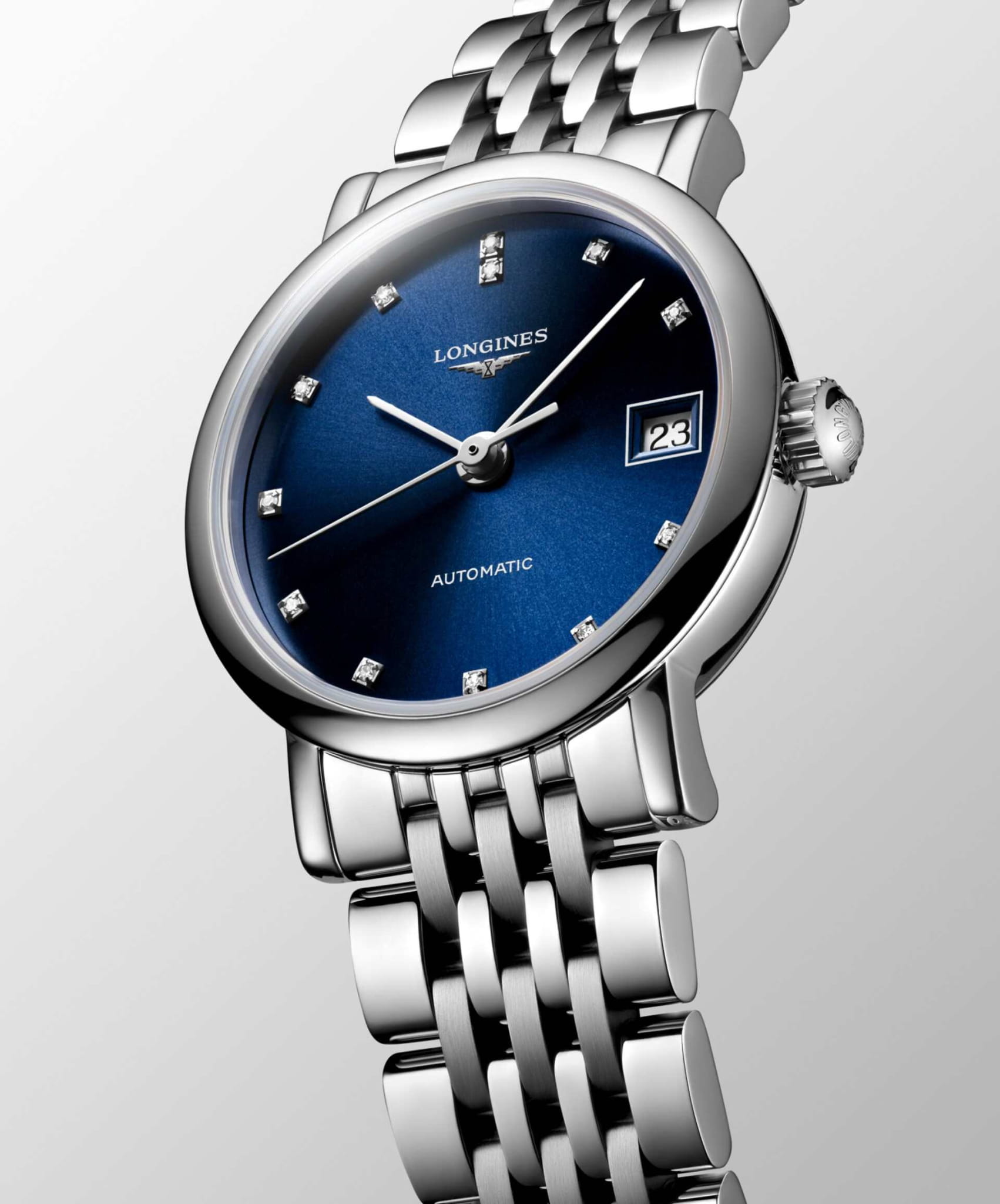 Изысканные женские часы Longines Elegance Elegant Collection 25.50 mm L4.309.4.90.6 — это воплощение спокойной роскоши и вечного стиля. Все элементы циферблата подчеркивают элегантность и классический вкус модели. Корпус часов изготовлен из нержавеющей стали, диаметром 25.50 мм. Защиту циферблата обеспечивает прочное сапфировое стеклоСапфировое стеклоПрочный и надёжный материал из кристалла сапфира синтетического происхождения, характеризующийся особой твёрдостью и устойчивостью к царапинам и повреждениям. гарантирующее четкость показаний. Циферблат украшен 12 бриллиантами Top Wesselton VS-SI общим весом 0,026 карата. Автоматический механизм L592 обеспечивает высокую точность и простоту использования. Водостойкость до 30 метров позволит плавать, нырять и заниматься другими водными видами спорта. Изысканный браслет выполнен из нержавеющей стали на застёжке-бабочке с кнопкамиЗастёжка "бабочка"Такой вид застёжки дополняется предохранителями, помогающими избежать случайного раскрытия браслета. Обладают изящным исполнением. , обеспечивающей комфортное ношение и надёжную фиксацию на запястье. Окошко даты в положении 3 часа. Коллекция The Elegant Collection сочетает в себе классическую элегантность и современный подход к дизайну, делая эти часы универсальным аксессуаром — как для торжественных случаев, так и для повседневной жизни.