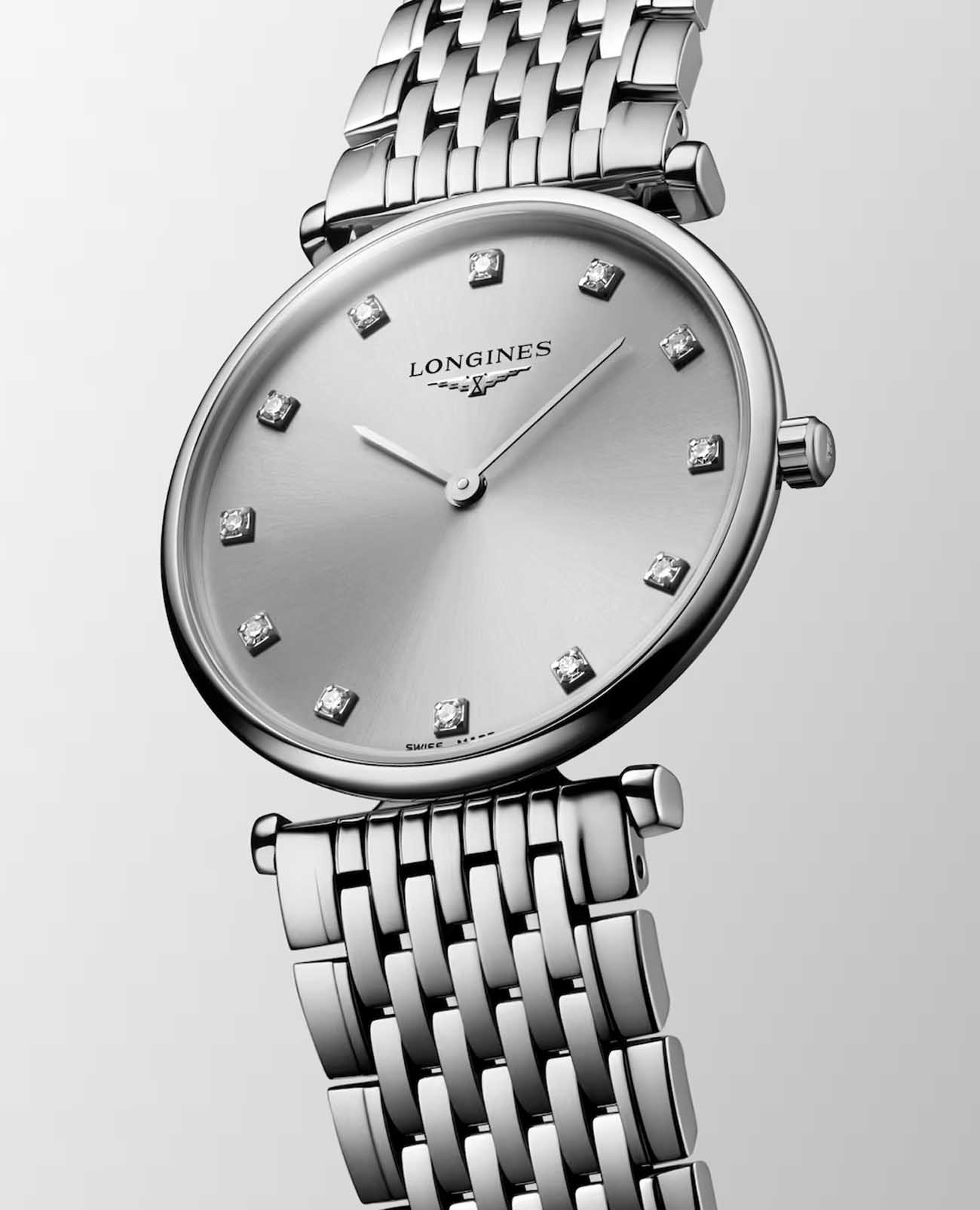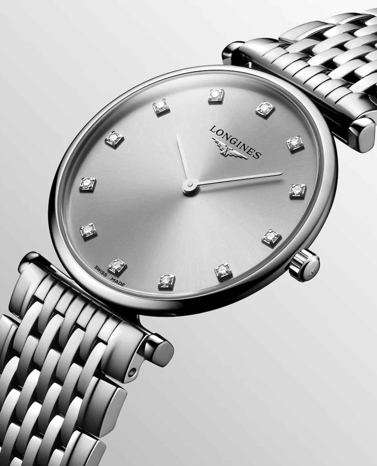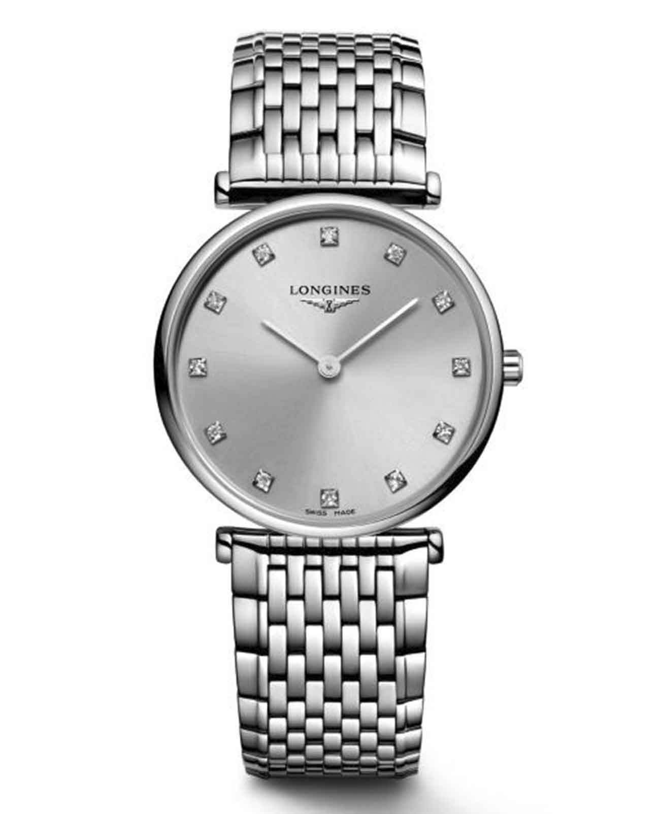 Женские швейцарские часы Longines La Grande Classique L4.512.4.70.6, кварцевый механизм с высокой точностью. Сапфировое стеклоСапфировое стеклоПрочный и надёжный материал из кристалла сапфира синтетического происхождения, характеризующийся особой твёрдостью и устойчивостью к царапинам и повреждениям. устойчивое к появлению царапин, обладающее высокой прозрачностью. Корпус часов изготовлен из стали. Циферблат с 12 бриллиантами группы Top Wesselton VS-SI общим весом 0.081 карата. Класс водозащиты: 30 метров, позволит защитить корпус от случайных брызг или капель дождя. Стальной браслет на застёжке-бабочке с кнопкамиЗастёжка "бабочка"Такой вид застёжки дополняется предохранителями, помогающими избежать случайного раскрытия браслета. Обладают изящным исполнением. .