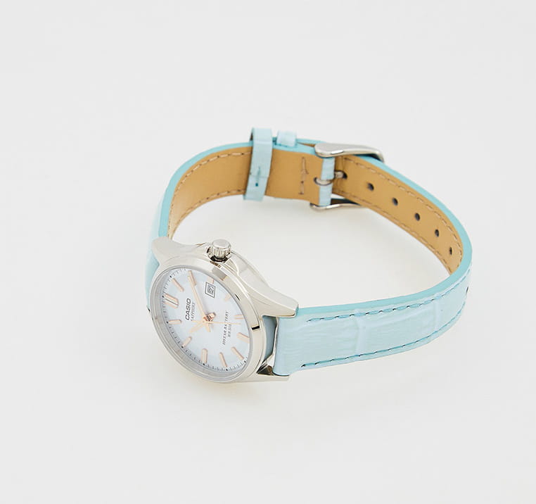 Наручные часы в классическом стиле подойдут в качестве элегантного и полезного аксессуара на любой случай жизни. Аккуратный круглый корпус выполнен из нержавеющей стали. Кожаный ремешок нежно-голубого цвета будет элегантно обрамлять запястье и подчеркнет женственность обладательницы аксессуара. Полезной особенностью часов является отображение текущей даты на дисплее. Подсветка NeobriteПодсветка NeobriteИспользование светонакопительных составов на основе сульфида цинка или алюмината стронция, яркий свет можно наблюдать на протяжении 6-10 часов после «зарядки» часов около источника света. позволяет аксессуару длительно светиться даже после непродолжительного нахождения на свету. Тип механизма - кварцевый. Батарейка имеет большой срок службы размером в 10 лет. Водонепроницаемость часов равна 5 Барам.