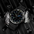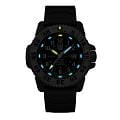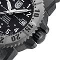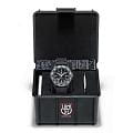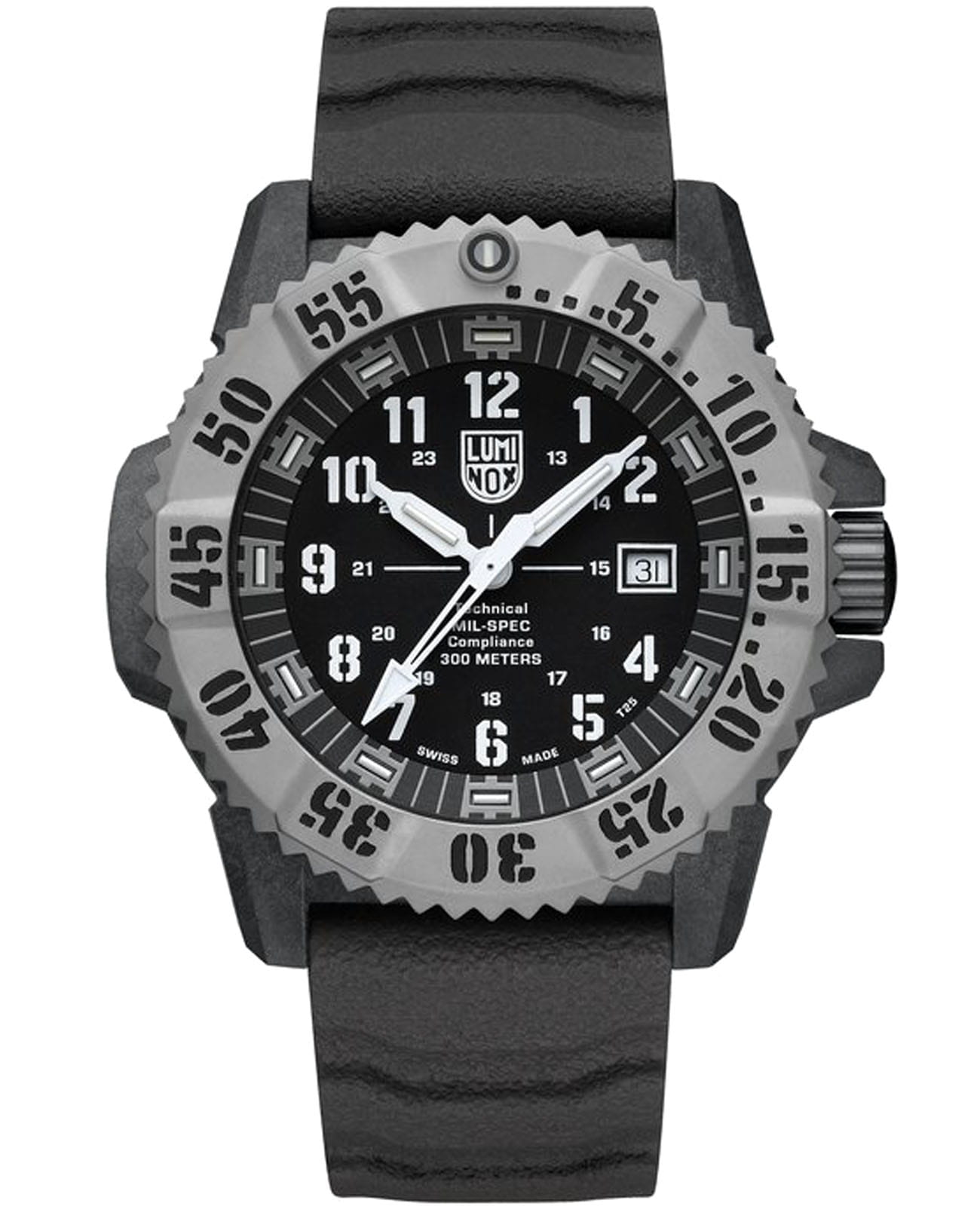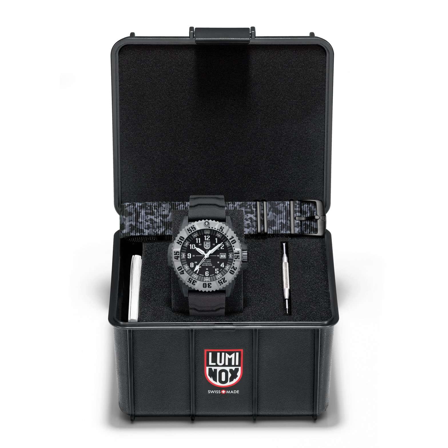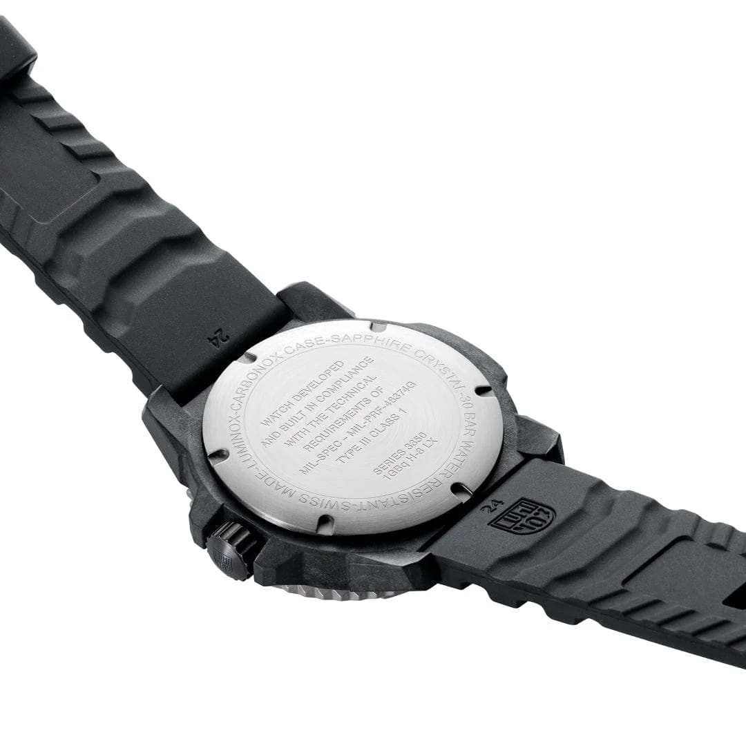 Luminox MIL-SPEC XL.3351.1.SET — мужская модель с мощным и функциональным дизайном, ориентированным на экстремальные условия. Корпус диаметром 46 мм выполнен из лёгкого и прочного карбона CARBONOX™+, а массивный односторонний вращающийся безельБезельВнешний ободок, закрепляющий стекло. В спортивных часах так называется поворотное кольцо с делениями на циферблате, выполняет роль таймера – замеряет отрезки времени на шкале. Неподвижный безель – элемент декора. Однонаправленно вращающийся безель на дайверских часах позволяет фиксировать моменты погружения и выныривания на поверхность. изготовлен из титана и дополнен крупной минутной разметкой для удобства под водой. Защитную функцию выполняет сапфировое стеклоСапфировое стеклоПрочный и надёжный материал из кристалла сапфира синтетического происхождения, характеризующийся особой твёрдостью и устойчивостью к царапинам и повреждениям. с антибликовым покрытиемАнтибликовое покрытиеСлой оксида металла в 0,13-0,3 микрон, благодаря которому стекло часов не бликует и не отражает свет. Антибликовое покрытие уменьшает отражение света в 10 раз, обеспечивая отличную читаемость показателей циферблата., обеспечивающим читаемость в любых условиях. В основе лежит швейцарский кварцевый механизм ETA F06.412 с индикацией часов, минут, секунд, даты и центральной секундной стрелкой. Водозащита 300 м (30 бар) соответствует профессиональным стандартам дайвинга. Благодаря технологии LLTLLTLLT — это автономный механизм подсветки, основанный на использовании микроскопических газонаполненных элементов. Специальные герметичные капсулы из боросиликатного стекла, интегрированные в циферблат, генерируют свечение без необходимости подключения к внешним источникам энергии. Для их работы не требуется ни дополнительный свет, ни механическое воздействие (например, нажатие кнопки). Свечение возникает благодаря химическому процессу: реакция между тритием, заключенным в капсулах, и люминофорным покрытием создает стабильное автономное освещение. Технология обеспечивает энергетическую независимость и долговечность подсветки.-подсветки, эти часы гарантируют превосходную видимость в темноте на протяжении 25 лет. Комплект MIL-SPEC поставляется на чёрном каучуковом ремешке с фирменной пряжкой CARBONOX™, дополнительным камуфляжным ремешком и инструментом для замены ремешка. Механизм с функцией HeavyDrive создает противоимпульс при ударе, чтобы предотвратить проскальзывание стрелок, что делает его более устойчивым к дисбалансу. Механизм с функцией PreciDrive, использующий термокомпенсационный блок, подает импульсы в зависимости от изменений температуры окружающей среды и воды.