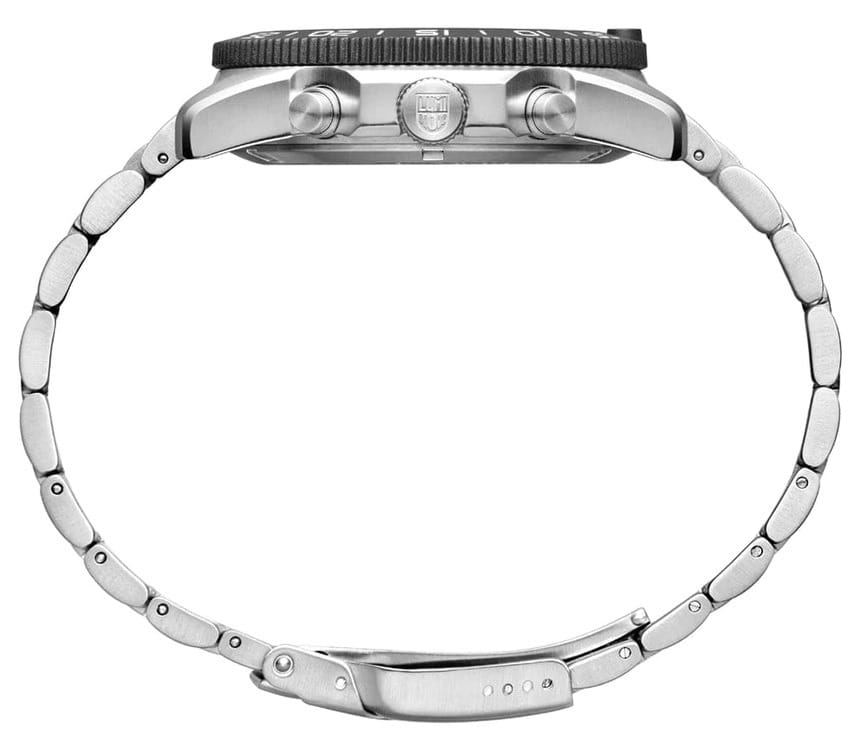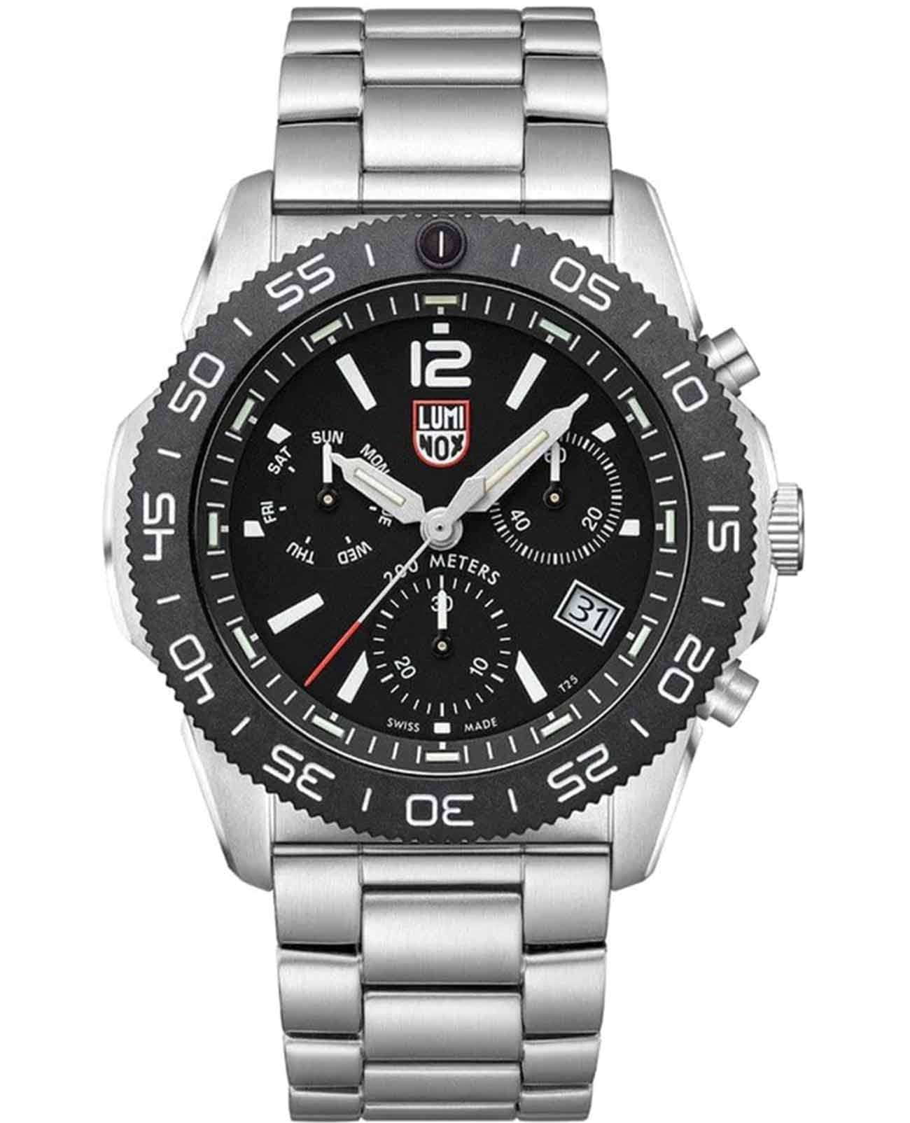 Швейцарские наручные часы Luminox Pacific Diver Chronograph XS.3142 – это идеальный симбиоз стиля и высокой функциональности. Оснащенные высокоточным кварцевым механизмом, они гарантируют безупречное времяизмерение и надежность в любом случае. Часы-хронографХронографФункция позволяет измерять отрезки времени с особой точностью: часы, минуты, секунды. Верным признаком хронографа является наличие на циферблате 3 дополнительных окошек-счётчиков. обладают функцией секундомераСекундомерСекундоме́р — прибор, способный измерять интервалы времени с точностью до долей секунды., что делает их практичными в использовании. Циферблат этих часов защищен сапфировым стекломСапфировое стеклоПрочный и надёжный материал из кристалла сапфира синтетического происхождения, характеризующийся особой твёрдостью и устойчивостью к царапинам и повреждениям. с антибликовым покрытиемАнтибликовое покрытиеСлой оксида металла в 0,13-0,3 микрон, благодаря которому стекло часов не бликует и не отражает свет. Антибликовое покрытие уменьшает отражение света в 10 раз, обеспечивая отличную читаемость показателей циферблата., которое славится своей прочностью и устойчивостью к царапинам, обеспечивая кристально чистый обзор. Корпус часов выполнен из качественной стали, что свидетельствует о долговечности и прочности изделия. Стрелки с LLTLLTLLT — это автономный механизм подсветки, основанный на использовании микроскопических газонаполненных элементов. Специальные герметичные капсулы из боросиликатного стекла, интегрированные в циферблат, генерируют свечение без необходимости подключения к внешним источникам энергии. Для их работы не требуется ни дополнительный свет, ни механическое воздействие (например, нажатие кнопки). Свечение возникает благодаря химическому процессу: реакция между тритием, заключенным в капсулах, и люминофорным покрытием создает стабильное автономное освещение. Технология обеспечивает энергетическую независимость и долговечность подсветки.-подсветкой, обеспечивают отличную видимость даже в условиях недостаточной освещенности, что делает их удобными для использования в любых условиях. Дополнительно часы располагают окошком даты в положении 4 часа, позволяющим быстро и удобно отслеживать текущую дату. Их внушительный класс водозащиты в 200 метров делает их идеальными для любителей водных видов спорта, таких как плавание и ныряние, не беспокоясь о повреждении механизма. Стальной ремешок, надёжно фиксирующий часы на запястье с помощью раскладной застёжкиРаскладная застёжкаТакой тип застёжки используется только на браслетах из металла. Она никогда не раскрывается полностью, происходит разделение на 2 и более частей. Раскладывающая застёжка снизит вероятность потери часов к минимуму., обеспечивает комфортное ношение в течение всего дня. Стильный вращающийся безельБезельВнешний ободок, закрепляющий стекло. В спортивных часах так называется поворотное кольцо с делениями на циферблате, выполняет роль таймера – замеряет отрезки времени на шкале. Неподвижный безель – элемент декора. Однонаправленно вращающийся безель на дайверских часах позволяет фиксировать моменты погружения и выныривания на поверхность., изготовленный из карбонаКарбонОт «carbon», «carbone» - углерод, углепластик - полимерный композиционный материал из переплетённ