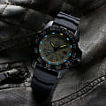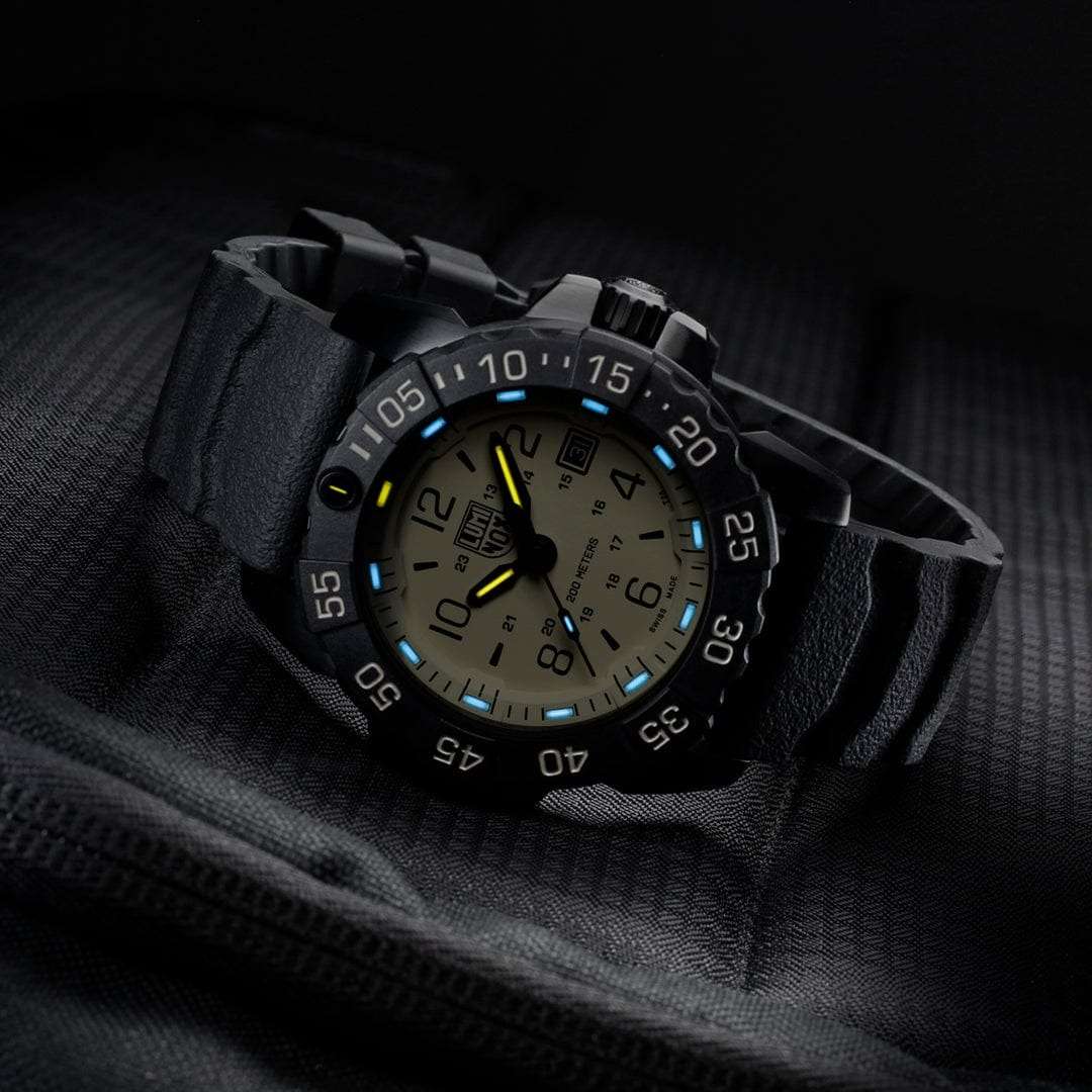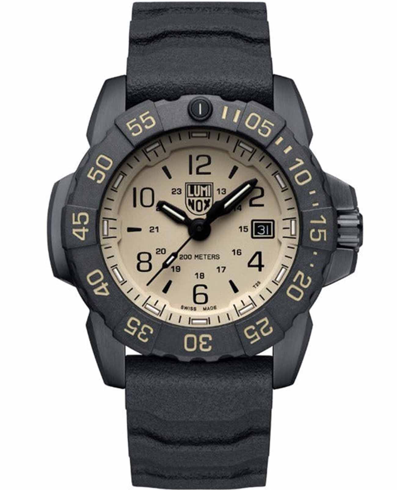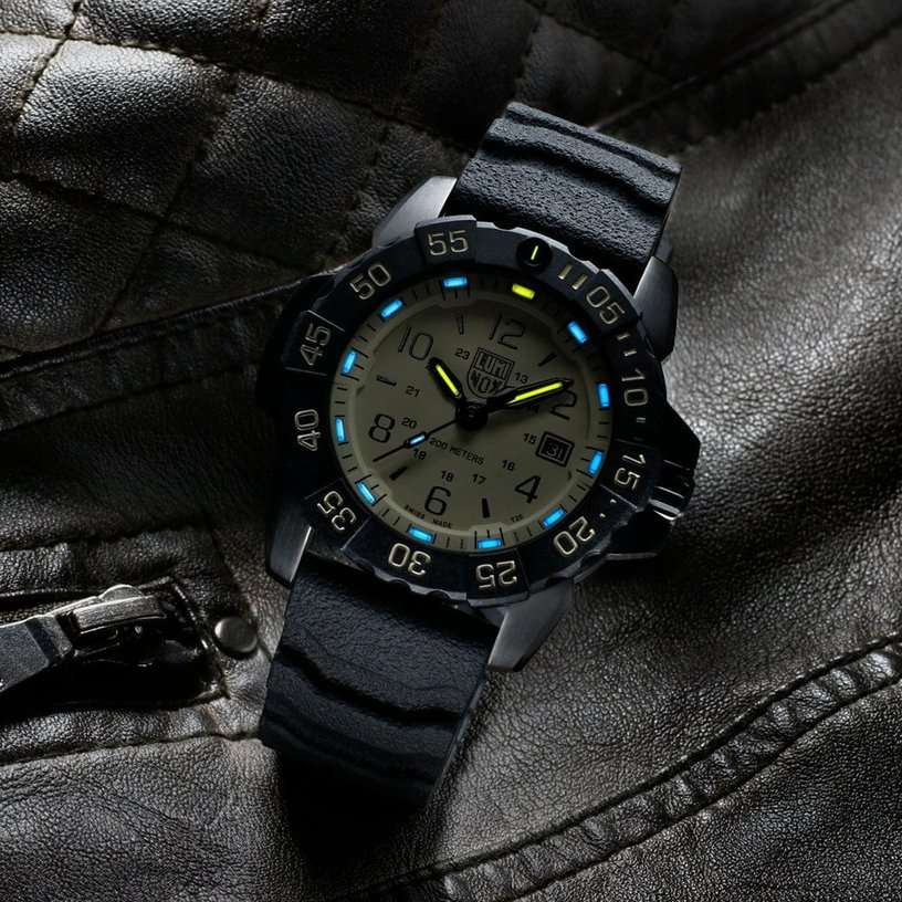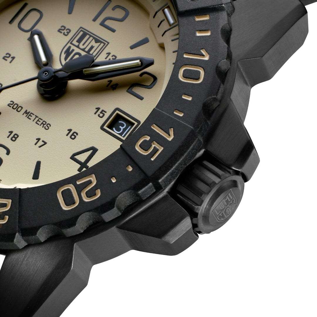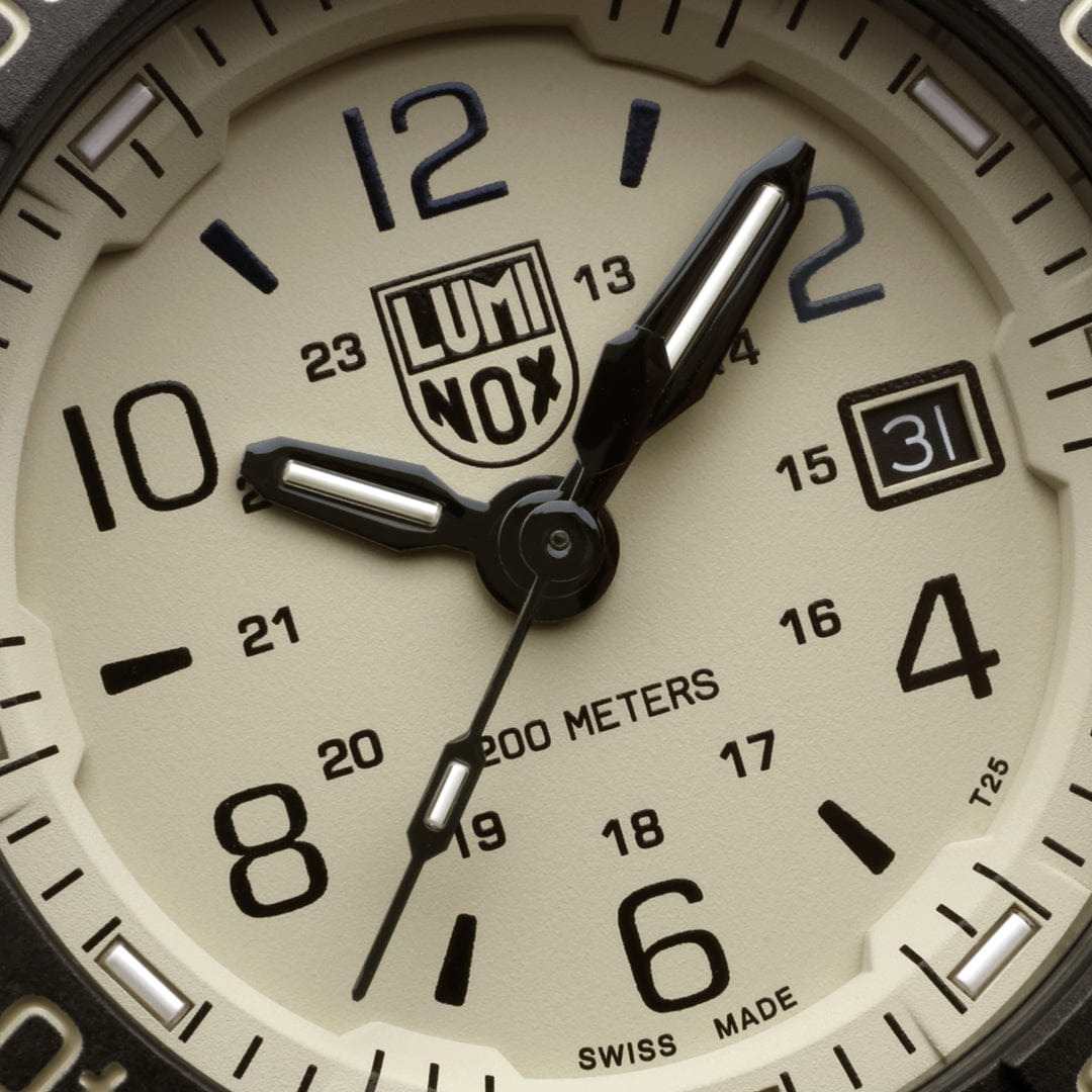 Luminox SEAL Foundation XS.3251.CBNSF.SET — это высококачественные швейцарские часы, созданные для тех, кто ценит надежность и стиль в повседневной жизни. Эти спортивные часы оборудованы кварцевым механизмом, который обеспечивает точность и стабильность работы. Их корпус выполнен из прочной стали 316L с PVD-покрытиемPVDУльтратонкое покрытие наносится в технике вакуумного напыления, сочетает в себе нитрид титана особой прочности со слоем золота или оксида хрома. Несёт в себе декоративную или защитную функцию., что придаёт часам современный и технологичный вид. Черный циферблат, на котором нанесены метки в виде штрихов и арабских цифр, защищен сапфировым стекломСапфировое стеклоПрочный и надёжный материал из кристалла сапфира синтетического происхождения, характеризующийся особой твёрдостью и устойчивостью к царапинам и повреждениям. с антибликовым покрытиемАнтибликовое покрытиеСлой оксида металла в 0,13-0,3 микрон, благодаря которому стекло часов не бликует и не отражает свет. Антибликовое покрытие уменьшает отражение света в 10 раз, обеспечивая отличную читаемость показателей циферблата., что позволяет без труда считывать время даже при ярком солнечном свете. Технология LLTLLTLLT — это автономный механизм подсветки, основанный на использовании микроскопических газонаполненных элементов. Специальные герметичные капсулы из боросиликатного стекла, интегрированные в циферблат, генерируют свечение без необходимости подключения к внешним источникам энергии. Для их работы не требуется ни дополнительный свет, ни механическое воздействие (например, нажатие кнопки). Свечение возникает благодаря химическому процессу: реакция между тритием, заключенным в капсулах, и люминофорным покрытием создает стабильное автономное освещение. Технология обеспечивает энергетическую независимость и долговечность подсветки.-подсветки обеспечивает отличную видимость в темноте, сохраняя свою эффективность на протяжении 25 лет. Окошко даты удобно расположено в позиции 3 часов. Часы оснащены вращающимся в одном направлении безелемБезельВнешний ободок, закрепляющий стекло. В спортивных часах так называется поворотное кольцо с делениями на циферблате, выполняет роль таймера – замеряет отрезки времени на шкале. Неподвижный безель – элемент декора. Однонаправленно вращающийся безель на дайверских часах позволяет фиксировать моменты погружения и выныривания на поверхность. со светящейся меткой на 12 часов, что добавляет функциональности и удобства. Завинчивающаяся заводная головка с защитой и завинчивающаяся задняя крышка с гравировкой обеспечивают дополнительную герметичность и стильный внешний вид. Резиновый черный ремешок с классической застежкой обеспечивает комфортное ношение и надежность фиксации на запястье, также в комплекте идет дополнительный бежевый нейлоновый ремешок. Эти часы обладают водозащитой до 200 метров, что делает их отличным выбором для активного отдыха и водных видов спорта.