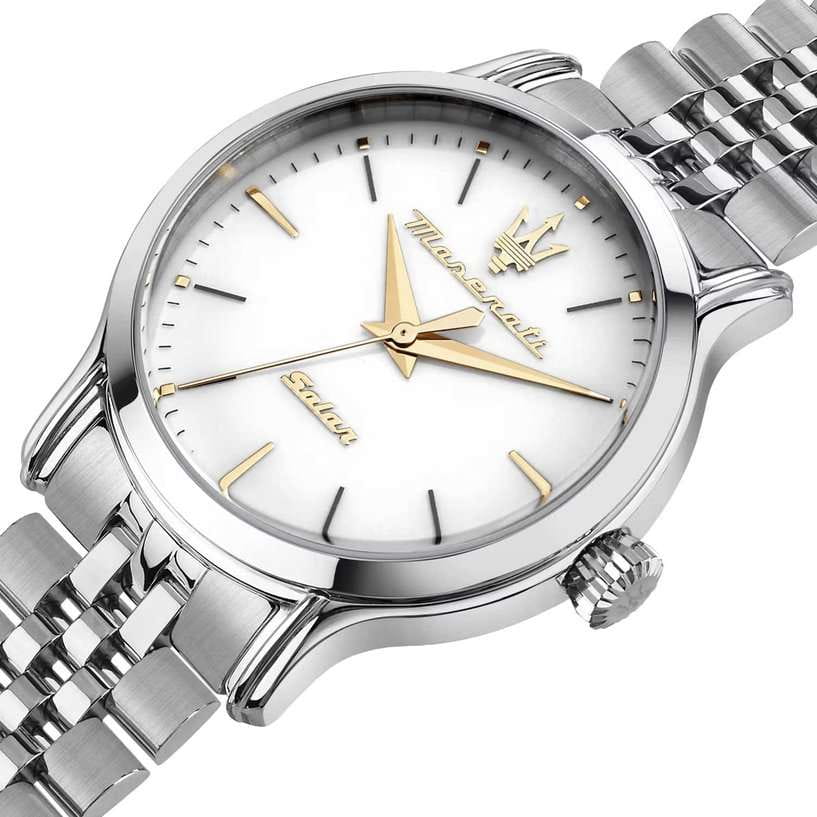 Maserati Attrazione Epoca R8853118519 — воплощение стиля и функциональности для современных женщин, ценящих качество и элегантность. Корпус диаметром 34 мм выполнен из нержавеющей стали, обеспечивая прочность и долговечность.Минеральное стеклоМинеральное стеклоМинеральное стекло представляет собой искусственно выращенный минерал кварца. Такое стекло отличается особой устойчивостью к повреждениям и царапинам. Уступает по некоторым качествам сапфировому стеклу. надежно защищает циферблат. Благодаря водостойкости до 10 метров (100 АТМ), эти часы станут вашим надежным спутником в любых условиях, будь то деловая встреча или активный отдых. Завершающий штрих — стальной браслет на раскладной застёжкеРаскладная застёжкаТакой тип застёжки используется только на браслетах из металла. Она никогда не раскрывается полностью, происходит разделение на 2 и более частей. Раскладывающая застёжка снизит вероятность потери часов к минимуму., который подчеркивает общий стиль, обеспечивая комфорт и надежность в носке. Циферблат с метками в виде штрихов украшен фирменным логотипом «Maserati». Завинчивающаяся задняя крышка и заводная головка.