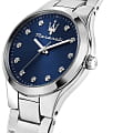 Maserati Attrazione R8853151506 — воплощение стиля и функциональности для современных женщин, ценящих качество и элегантность. Корпус диаметром 30 мм выполнен из нержавеющей стали, обеспечивая прочность и долговечность.Минеральное стеклоМинеральное стеклоМинеральное стекло представляет собой искусственно выращенный минерал кварца. Такое стекло отличается особой устойчивостью к повреждениям и царапинам. Уступает по некоторым качествам сапфировому стеклу. надежно защищает синий циферблат с изящными рисками, придавая часам утонченный вид. Благодаря водостойкости до 50 метров (50 АТМ), эти часы станут вашим надежным спутником в любых условиях, будь то деловая встреча или активный отдых. Завершающий штрих — стальной браслет с раскладной застёжкойРаскладная застёжкаТакой тип застёжки используется только на браслетах из металла. Она никогда не раскрывается полностью, происходит разделение на 2 и более частей. Раскладывающая застёжка снизит вероятность потери часов к минимуму., который подчеркивает общий стиль, обеспечивая комфорт и надежность в носке. Циферблат выполнен по технологии Sunray (солнечные лучи) и украшен фирменным логотипом «Maserati». Метки в виде точек, инкрустированные кристаллами.
