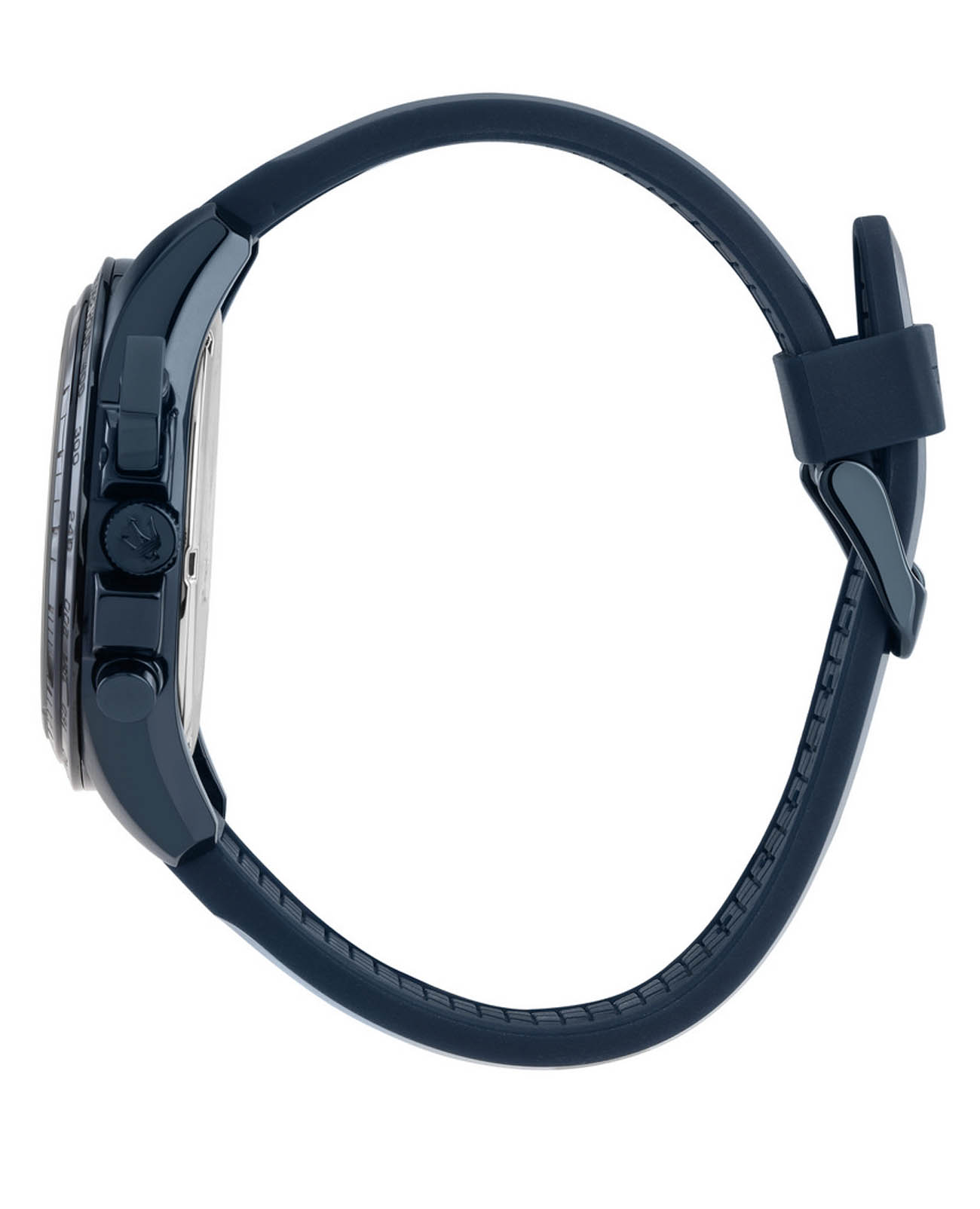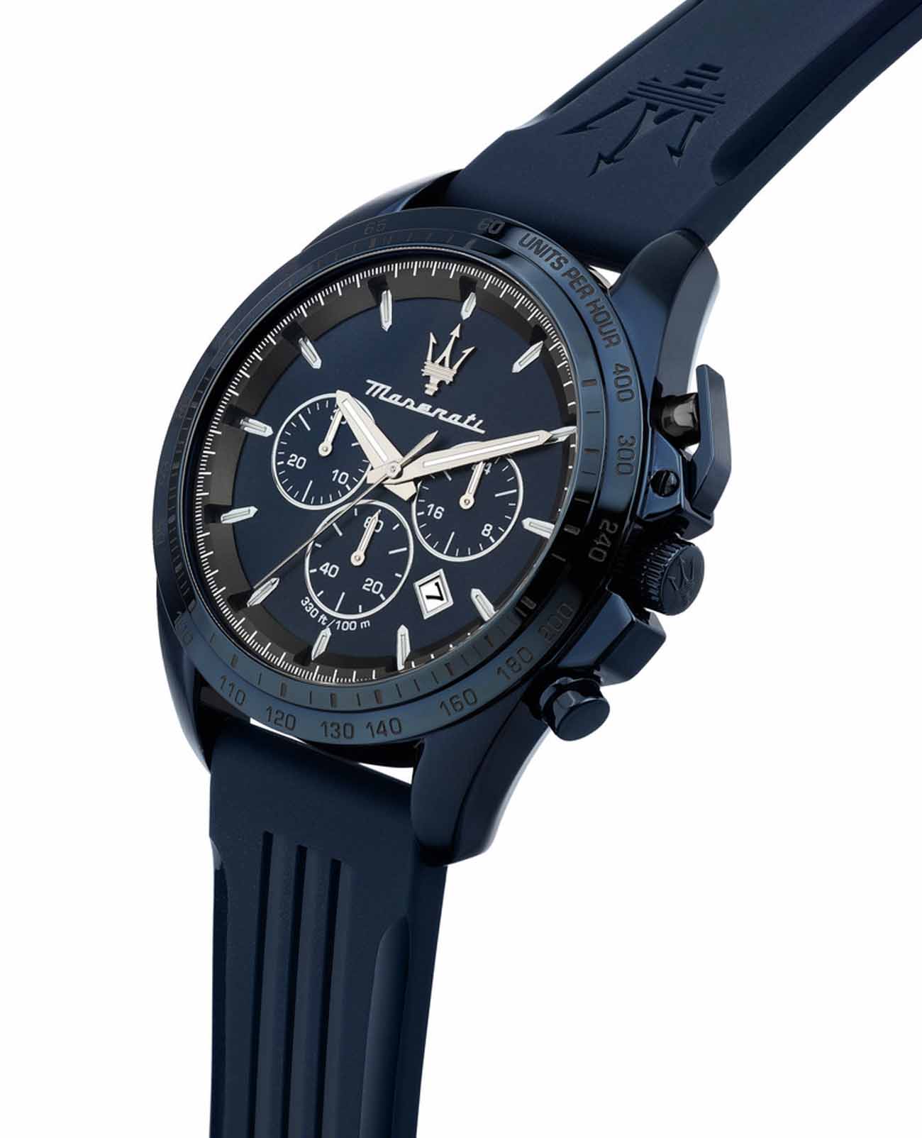 Мужские итальянские часы c хронографомХронографФункция позволяет измерять отрезки времени с особой точностью: часы, минуты, секунды. Верным признаком хронографа является наличие на циферблате 3 дополнительных окошек-счётчиков. Maserati Traguardo R8871612042, кварцевый механизм с высокой точностью. Корпус часов изготовлен из стали с PVD-покрытиемPVDУльтратонкое покрытие наносится в технике вакуумного напыления, сочетает в себе нитрид титана особой прочности со слоем золота или оксида хрома. Несёт в себе декоративную или защитную функцию.. Стрелки с люминесцентным покрытиемЛюминесцентное покрытиеПозволяет считывать показания времени в темноте. Производители наносят на стрелки, часовые индексы, безель или поверхность циферблата светонакопительный состав, дающий холодное свечение.. Класс водозащиты: 100 метров, позволит плавать, нырять и заниматься другими водными видами спорта. Каучуковый ремешок на стандартной застежке.