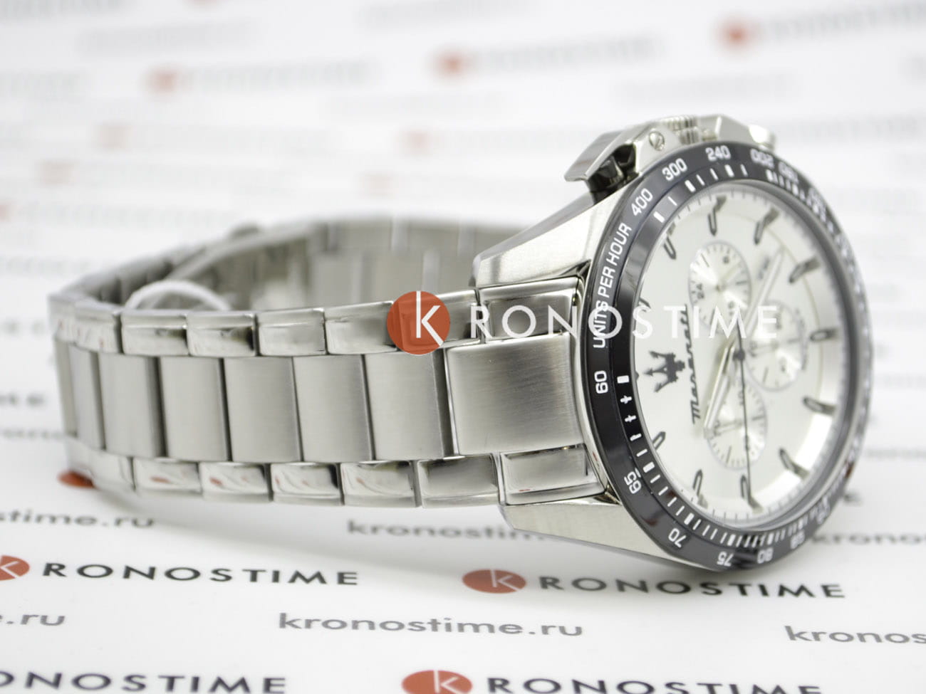 Мужские наручные часы-хронографХронографФункция позволяет измерять отрезки времени с особой точностью: часы, минуты, секунды. Верным признаком хронографа является наличие на циферблате 3 дополнительных окошек-счётчиков. Maserati R8873650002, кварцевый механизм (автоматический калибр) с высокой точностью. Минеральное стеклоМинеральное стеклоМинеральное стекло представляет собой искусственно выращенный минерал кварца. Такое стекло отличается особой устойчивостью к повреждениям и царапинам. Уступает по некоторым качествам сапфировому стеклу. устойчивое к появлению царапин, обладающее высокой прозрачностью. Стрелки и метки с люминесцентным покрытиемЛюминесцентное покрытиеПозволяет считывать показания времени в темноте. Производители наносят на стрелки, часовые индексы, безель или поверхность циферблата светонакопительный состав, дающий холодное свечение.. Класс водозащиты: 100 метров, позволит плавать, нырять и заниматься другими водными видами спорта.БезельБезельВнешний ободок, закрепляющий стекло. В спортивных часах так называется поворотное кольцо с делениями на циферблате, выполняет роль таймера – замеряет отрезки времени на шкале. Неподвижный безель – элемент декора. Однонаправленно вращающийся безель на дайверских часах позволяет фиксировать моменты погружения и выныривания на поверхность. изготовлен из нержавеющей стали с PVD-покрытиемPVDУльтратонкое покрытие наносится в технике вакуумного напыления, сочетает в себе нитрид титана особой прочности со слоем золота или оксида хрома. Несёт в себе декоративную или защитную функцию.. Браслет с раскладной застёжкойРаскладная застёжкаТакой тип застёжки используется только на браслетах из металла. Она никогда не раскрывается полностью, происходит разделение на 2 и более частей. Раскладывающая застёжка снизит вероятность потери часов к минимуму. и с PVD-покрытиемPVDУльтратонкое покрытие наносится в технике вакуумного напыления, сочетает в себе нитрид титана особой прочности со слоем золота или оксида хрома. Несёт в себе декоративную или защитную функцию..