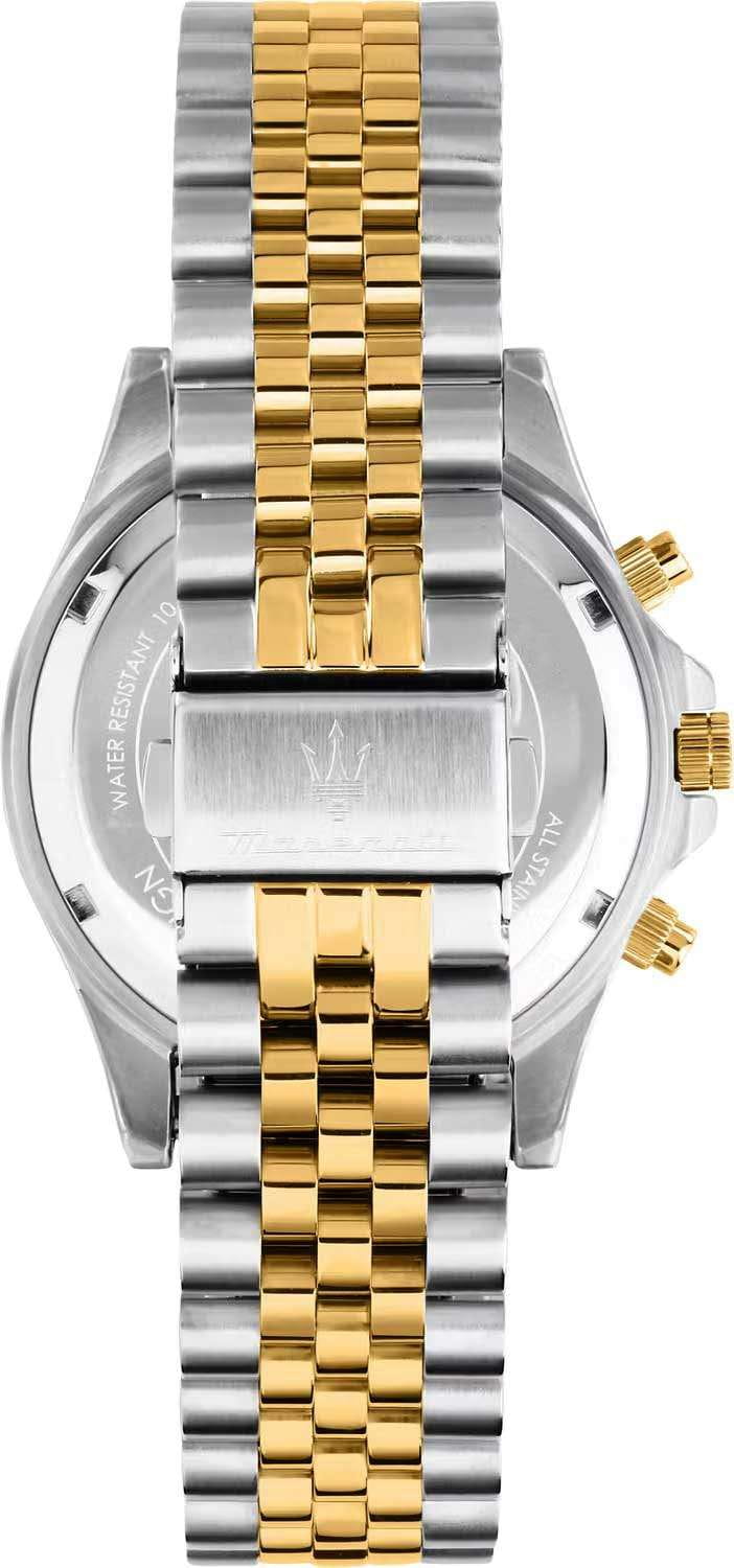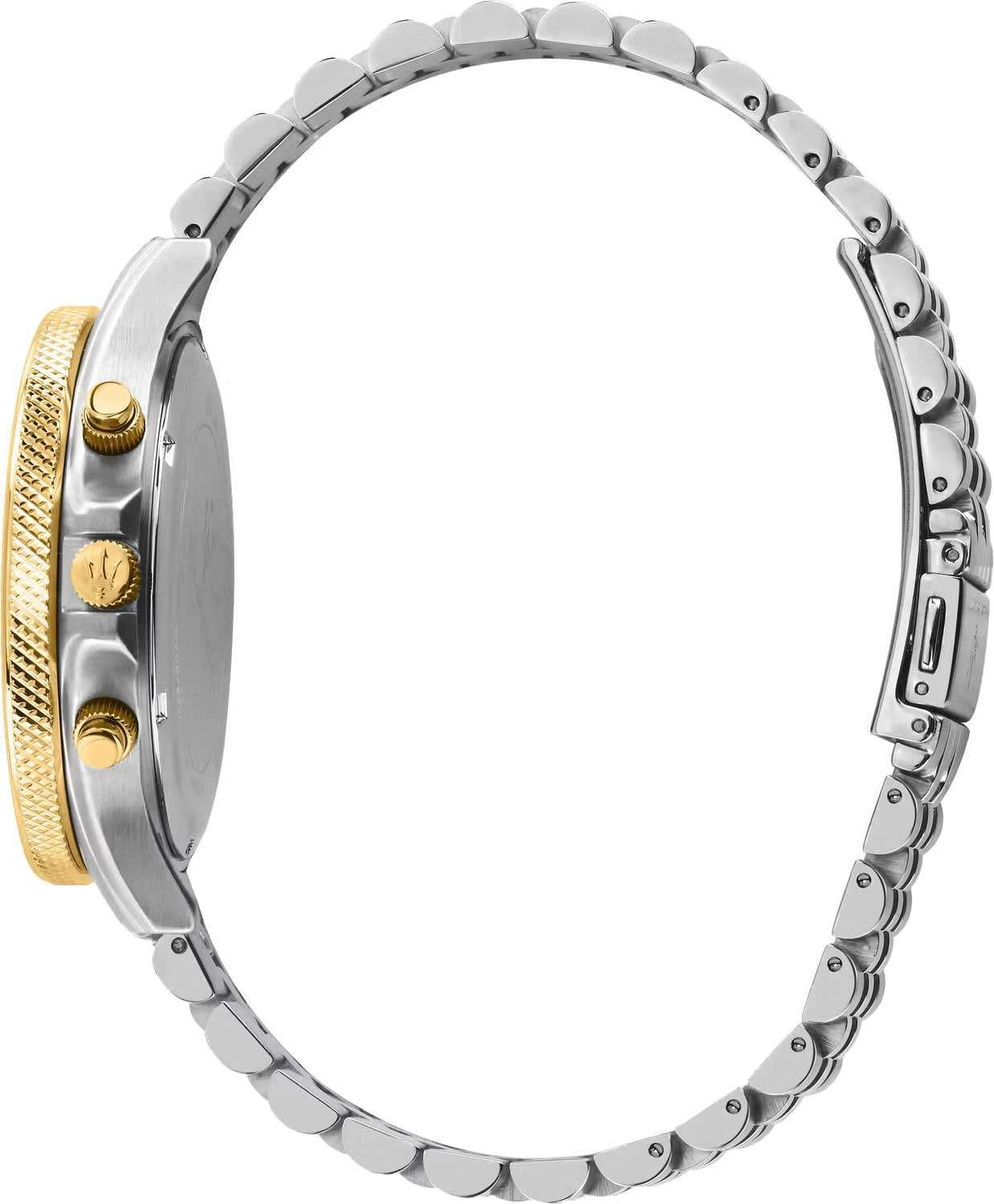 Часы Maserati Sfida R8873640024 представляют собой воплощение итальянской элегантности и технологической точности. Эти часы-хронографХронографФункция позволяет измерять отрезки времени с особой точностью: часы, минуты, секунды. Верным признаком хронографа является наличие на циферблате 3 дополнительных окошек-счётчиков. оборудованы надёжным кварцевым механизмом с калибром Miyota JS25, обеспечивающим точность и долговечность. Корпус диаметром 44 мм выполнен из стали и украшен керамической вставкой, что придаёт им современный и стильный вид. Серебристый циферблат, выполненный по технологии Sunray, эффектно играет на свету, создавая впечатление солнечных лучей. Он украшен фирменным логотипом «Maserati» и метками в виде штрихов, а также содержит окошко даты, расположенное между отметками 4 и 5 часов. Функциональность часов подчёркнута наличием секундомераСекундомерСекундоме́р — прибор, способный измерять интервалы времени с точностью до долей секунды. и возможностью выбора 12-ти или 24-х часового формата времени. БезельБезельВнешний ободок, закрепляющий стекло. В спортивных часах так называется поворотное кольцо с делениями на циферблате, выполняет роль таймера – замеряет отрезки времени на шкале. Неподвижный безель – элемент декора. Однонаправленно вращающийся безель на дайверских часах позволяет фиксировать моменты погружения и выныривания на поверхность. с золотистым и черным PVDPVDУльтратонкое покрытие наносится в технике вакуумного напыления, сочетает в себе нитрид титана особой прочности со слоем золота или оксида хрома. Несёт в себе декоративную или защитную функцию. покрытием имеет шкалу тахиметраТахиметрРазмеченная шкала, располагается на ободке или безеле часов. Тахиметр позволяет рассчитать скорость на определённом участке пути, расстояние измеряется в километрах или милях.. Люминесцентное покрытиеЛюминесцентное покрытиеПозволяет считывать показания времени в темноте. Производители наносят на стрелки, часовые индексы, безель или поверхность циферблата светонакопительный состав, дающий холодное свечение. на стрелках обеспечивает отличную видимость в темноте. Минеральное стеклоМинеральное стеклоМинеральное стекло представляет собой искусственно выращенный минерал кварца. Такое стекло отличается особой устойчивостью к повреждениям и царапинам. Уступает по некоторым качествам сапфировому стеклу. защищает циферблат, а завинчивающаяся задняя крышка и заводная головка с защитой гарантируют водозащиту до 100WR, позволяя без опасений использовать часы в различных условиях. Стальной браслет с частичным PVDPVDУльтратонкое покрытие наносится в технике вакуумного напыления, сочетает в себе нитрид титана особой прочности со слоем золота или оксида хрома. Несёт в себе декоративную или защитную функцию. покрытием и раскладной застёжкойРаскладная застёжкаТакой тип застёжки используется только на браслетах из металла. Она никогда не раскрывается полностью, происходит разделение на 2 и более частей. Раскладывающая застёжка снизит вероятность потери часов к минимуму. обеспечивает комфортное ношение и надёжную фиксацию на запястье. Эти часы идеально подойдут для тех, кто ценит стиль и функциональность в одном аксессуаре.