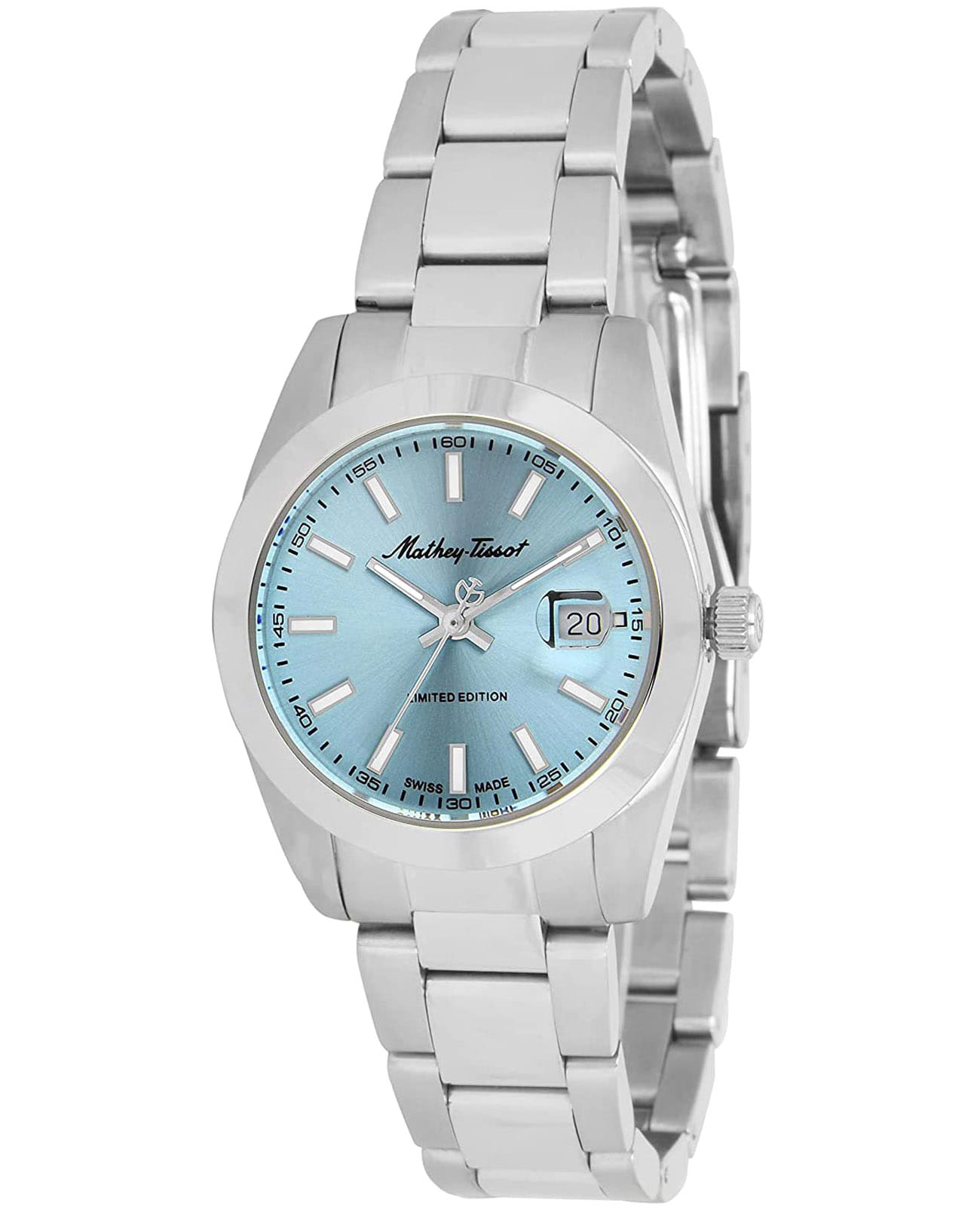 Женские кварцевые часы Mathey-Tissot Mathy D451BU — это стильное сочетание элегантности и современного дизайна. Лимитированная серия. Изящный корпус выполнен из нержавеющей стали, диаметром 32 мм, что придаст образу женственности и романтизма. Изысканный циферблат с метками в виде штрихов придает модели особый блеск. Циферблат защищен минеральным стекломМинеральное стеклоМинеральное стекло представляет собой искусственно выращенный минерал кварца. Такое стекло отличается особой устойчивостью к повреждениям и царапинам. Уступает по некоторым качествам сапфировому стеклу., обеспечивающий устойчивость к царапинам. Стрелки и метки с люминесцентным покрытиемЛюминесцентное покрытиеПозволяет считывать показания времени в темноте. Производители наносят на стрелки, часовые индексы, безель или поверхность циферблата светонакопительный состав, дающий холодное свечение.. Окошко даты находится в положении 3 часа. Часы оснащены надежным кварцевым механизмом. Стальной браслет на раскладной застёжке с фиксаторомРаскладная застёжкаТакой тип застёжки используется только на браслетах из металла. Она никогда не раскрывается полностью, происходит разделение на 2 и более частей. Раскладывающая застёжка снизит вероятность потери часов к минимуму., гарантирует комфортное и безопасное ношение. Класс водозащиты: 50 метров позволит защитить корпус от случайных брызг или капель дождя. Mathey-Tissot — отличный выбор для тех, кто ценит утонченность и качество.