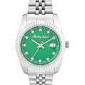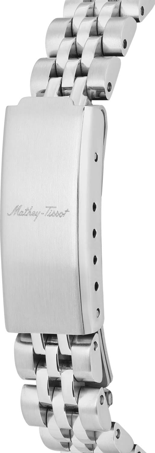 Женские кварцевые часы Mathey-Tissot Mathy D810AV — это стильное сочетание элегантности и современного дизайна. Изящный корпус выполнен из нержавеющей стали, диаметром 32 мм, что придаст образу женственности и романтизма. Изысканный циферблат с метками в виде точек украшены цирконами, что придает модели особый блеск. Циферблат защищен минеральным стекломМинеральное стеклоМинеральное стекло представляет собой искусственно выращенный минерал кварца. Такое стекло отличается особой устойчивостью к повреждениям и царапинам. Уступает по некоторым качествам сапфировому стеклу., обеспечивающий устойчивость к царапинам. Стрелки с люминесцентным покрытиемЛюминесцентное покрытиеПозволяет считывать показания времени в темноте. Производители наносят на стрелки, часовые индексы, безель или поверхность циферблата светонакопительный состав, дающий холодное свечение.. Окошко даты находится в положении 3 часа. Часы оснащены надежным кварцевым механизмом. Стальной браслет на раскладной застёжкеРаскладная застёжкаТакой тип застёжки используется только на браслетах из металла. Она никогда не раскрывается полностью, происходит разделение на 2 и более частей. Раскладывающая застёжка снизит вероятность потери часов к минимуму., гарантирует комфортное и безопасное ношение. Класс водозащиты: 50 метров позволит защитить корпус от случайных брызг или капель дождя. Mathey-Tissot — отличный выбор для тех, кто ценит утонченность и качество.