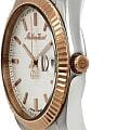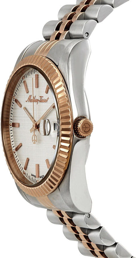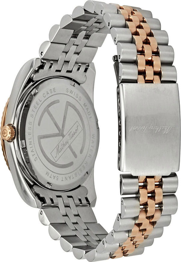 Мужские кварцевые часы Mathey-Tissot Mathy H810RA — это стильное сочетание элегантности и современного дизайна. Изящный корпус выполнен из нержавеющей стали, диаметром 40 мм, что придаст образу элегантности и надежности. Изысканный циферблат с метками в виде штрихов придает модели особый блеск. Циферблат защищен минеральным стекломМинеральное стеклоМинеральное стекло представляет собой искусственно выращенный минерал кварца. Такое стекло отличается особой устойчивостью к повреждениям и царапинам. Уступает по некоторым качествам сапфировому стеклу., обеспечивает устойчивость к царапинам. Стрелки с люминесцентным покрытиемЛюминесцентное покрытиеПозволяет считывать показания времени в темноте. Производители наносят на стрелки, часовые индексы, безель или поверхность циферблата светонакопительный состав, дающий холодное свечение., которое светится в темноте после непродолжительной зарядки на свету. БезельБезельВнешний ободок, закрепляющий стекло. В спортивных часах так называется поворотное кольцо с делениями на циферблате, выполняет роль таймера – замеряет отрезки времени на шкале. Неподвижный безель – элемент декора. Однонаправленно вращающийся безель на дайверских часах позволяет фиксировать моменты погружения и выныривания на поверхность. с PVD-покрытиемPVDУльтратонкое покрытие наносится в технике вакуумного напыления, сочетает в себе нитрид титана особой прочности со слоем золота или оксида хрома. Несёт в себе декоративную или защитную функцию. золотистого цвета. Окошко даты находится в положении 3 часа. Часы оснащены надежным кварцевым механизмом. Стальной браслет с частичным PVD-покрытиемPVDУльтратонкое покрытие наносится в технике вакуумного напыления, сочетает в себе нитрид титана особой прочности со слоем золота или оксида хрома. Несёт в себе декоративную или защитную функцию. на раскладной застёжке с фиксаторомРаскладная застёжкаТакой тип застёжки используется только на браслетах из металла. Она никогда не раскрывается полностью, происходит разделение на 2 и более частей. Раскладывающая застёжка снизит вероятность потери часов к минимуму., гарантирует комфортное и безопасное ношение. Рифленая заводная головка. Класс водозащиты: 50 метров позволит защитить корпус от случайных брызг или капель дождя. Mathey-Tissot — отличный выбор для тех, кто ценит утонченность и качество.