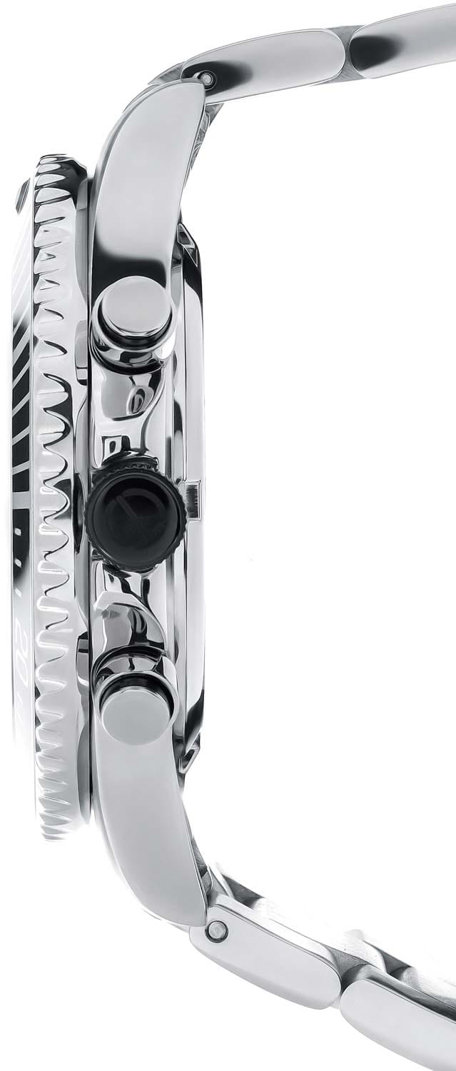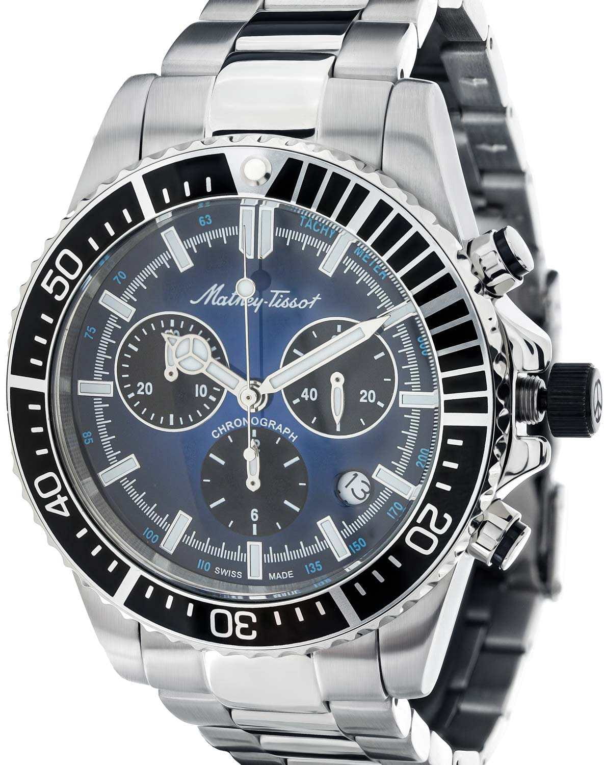 Мужские кварцевые часы-хронографХронографФункция позволяет измерять отрезки времени с особой точностью: часы, минуты, секунды. Верным признаком хронографа является наличие на циферблате 3 дополнительных окошек-счётчиков. с секундомеромСекундомерСекундоме́р — прибор, способный измерять интервалы времени с точностью до долей секунды. Mathey-Tissot Mathy H908CHABU — это стильное сочетание элегантности и современного дизайна. Лимитированная серия. Изящный корпус выполнен из нержавеющей стали, диаметром 42 мм, что придаст образу элегантности и надежности. Изысканный циферблат с метками в виде штрихов придает модели особый блеск. Циферблат защищен минеральным стекломМинеральное стеклоМинеральное стекло представляет собой искусственно выращенный минерал кварца. Такое стекло отличается особой устойчивостью к повреждениям и царапинам. Уступает по некоторым качествам сапфировому стеклу. с сапфировым покрытием, обеспечивает устойчивость к царапинам. Стрелки и метки с люминесцентным покрытиемЛюминесцентное покрытиеПозволяет считывать показания времени в темноте. Производители наносят на стрелки, часовые индексы, безель или поверхность циферблата светонакопительный состав, дающий холодное свечение.. БезельБезельВнешний ободок, закрепляющий стекло. В спортивных часах так называется поворотное кольцо с делениями на циферблате, выполняет роль таймера – замеряет отрезки времени на шкале. Неподвижный безель – элемент декора. Однонаправленно вращающийся безель на дайверских часах позволяет фиксировать моменты погружения и выныривания на поверхность. с PVD-покрытиемPVDУльтратонкое покрытие наносится в технике вакуумного напыления, сочетает в себе нитрид титана особой прочности со слоем золота или оксида хрома. Несёт в себе декоративную или защитную функцию.. Окошко даты находится в положении между 4 и 5 часов. Стальной браслет на раскладной застёжке с фиксаторомРаскладная застёжкаТакой тип застёжки используется только на браслетах из металла. Она никогда не раскрывается полностью, происходит разделение на 2 и более частей. Раскладывающая застёжка снизит вероятность потери часов к минимуму., гарантирует комфортное и безопасное ношение. Рифленая заводная головка. Класс водозащиты: 100 метров позволит плавать, нырять и заниматься другими водными видами спорта. Mathey-Tissot — отличный выбор для тех, кто ценит утонченность и качество.