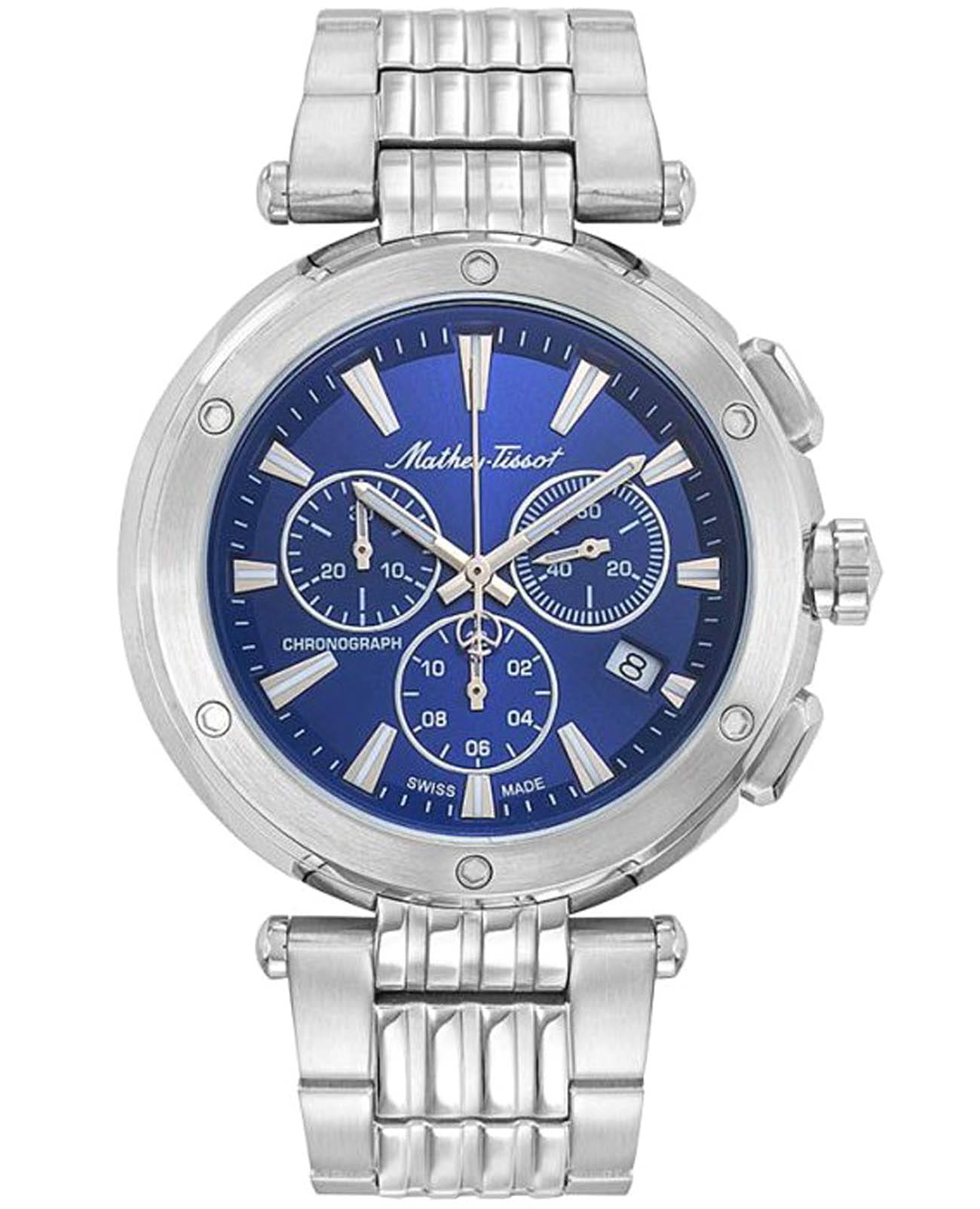 Мужские кварцевые часы-хронографХронографФункция позволяет измерять отрезки времени с особой точностью: часы, минуты, секунды. Верным признаком хронографа является наличие на циферблате 3 дополнительных окошек-счётчиков. Mathey-Tissot Neptune H912CHABU — это стильное сочетание элегантности и современного дизайна. Изящный корпус выполнен из нержавеющей стали серебристого цвета, диаметром 42 мм, что придаст образу элегантности и надежности. Изысканный циферблат с метками в виде штрихов придает модели особый блеск. Циферблат защищен минеральным стекломМинеральное стеклоМинеральное стекло представляет собой искусственно выращенный минерал кварца. Такое стекло отличается особой устойчивостью к повреждениям и царапинам. Уступает по некоторым качествам сапфировому стеклу. с сапфировым покрытием, обеспечивает устойчивость к царапинам. Стрелки и метки с люминесцентным покрытиемЛюминесцентное покрытиеПозволяет считывать показания времени в темноте. Производители наносят на стрелки, часовые индексы, безель или поверхность циферблата светонакопительный состав, дающий холодное свечение.. БезельБезельВнешний ободок, закрепляющий стекло. В спортивных часах так называется поворотное кольцо с делениями на циферблате, выполняет роль таймера – замеряет отрезки времени на шкале. Неподвижный безель – элемент декора. Однонаправленно вращающийся безель на дайверских часах позволяет фиксировать моменты погружения и выныривания на поверхность. украшен винтами. Окошко даты находится в положении 4 часа. Часы оснащены надежным кварцевым механизмом. Стальной браслет на застёжке-бабочке с кнопкамиЗастёжка "бабочка"Такой вид застёжки дополняется предохранителями, помогающими избежать случайного раскрытия браслета. Обладают изящным исполнением. , гарантирует комфортное и безопасное ношение. Класс водозащиты: 50 метров позволит защитить корпус от случайных брызг или капель дождя. Mathey-Tissot — отличный выбор для тех, кто ценит утонченность и качество.