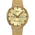 Циферблат с фирменным логотипом Mido 1950-х годов украшен накладными индексами и стрелками с люминесцентным покрытиемЛюминесцентное покрытиеПозволяет считывать показания времени в темноте. Производители наносят на стрелки, часовые индексы, безель или поверхность циферблата светонакопительный состав, дающий холодное свечение., обеспечивающим читаемость даже в условиях слабого освещения. На «3 часах» расположено двойное окошко календаря — день недели и дата. Стальной браслет миланского плетения с PVD-покрытиемPVDУльтратонкое покрытие наносится в технике вакуумного напыления, сочетает в себе нитрид титана особой прочности со слоем золота или оксида хрома. Несёт в себе декоративную или защитную функцию. на раскладном замкеРаскладной замокДанный вариант застежки используется только на часах с металлическим браслетом. Отличительная особенность такого крепления в том, что длина браслета становится универсальной и вы можете самостоятельно отрегулировать нужный вам размер – застежка просто двигается по браслету часов..Модель защищена акриловым стеклом, сохраняющим аутентичный винтажный характер. Прозрачная задняя крышка открывает вид на автоматический механизм с автоподзаводом и 80-часовым запасом хода.