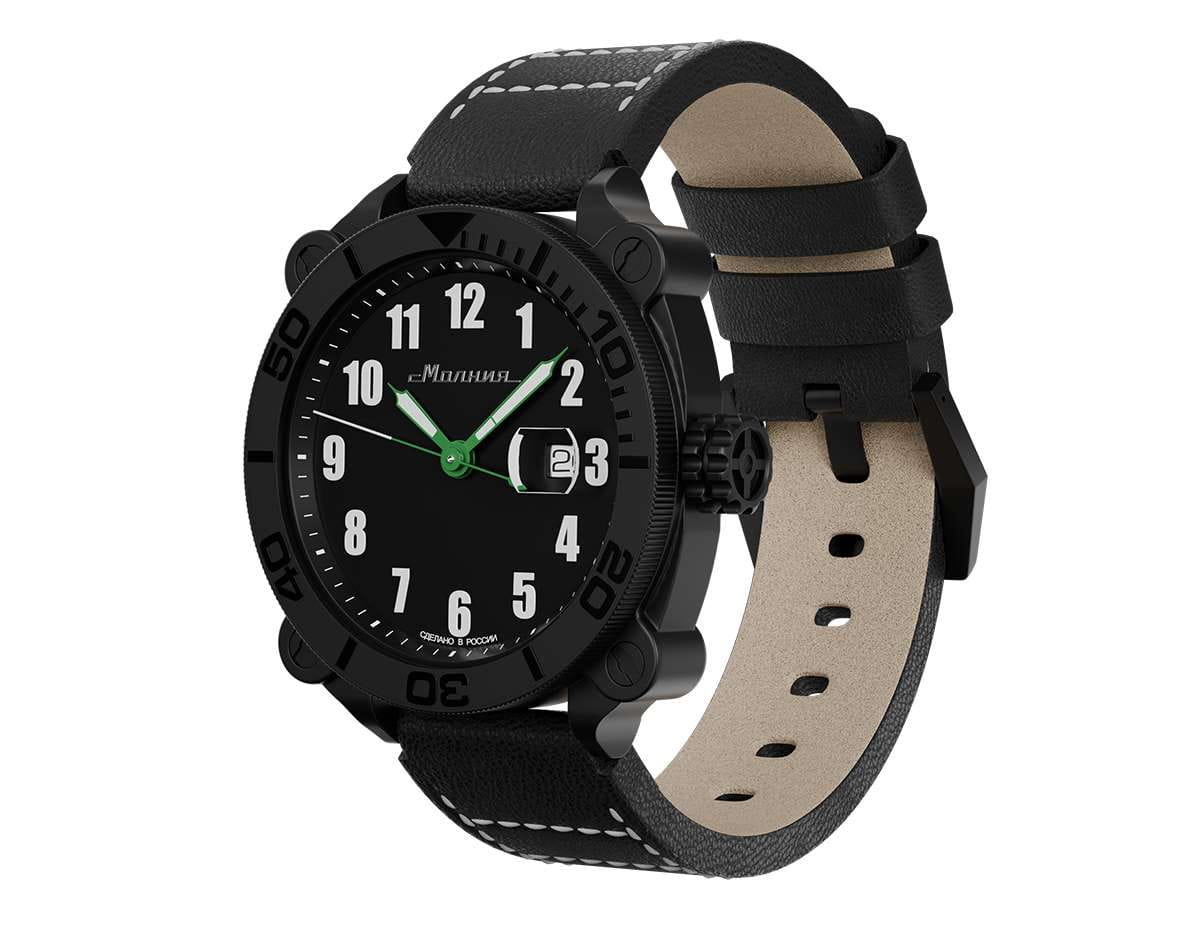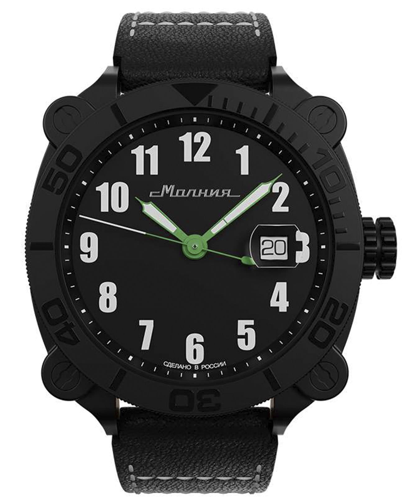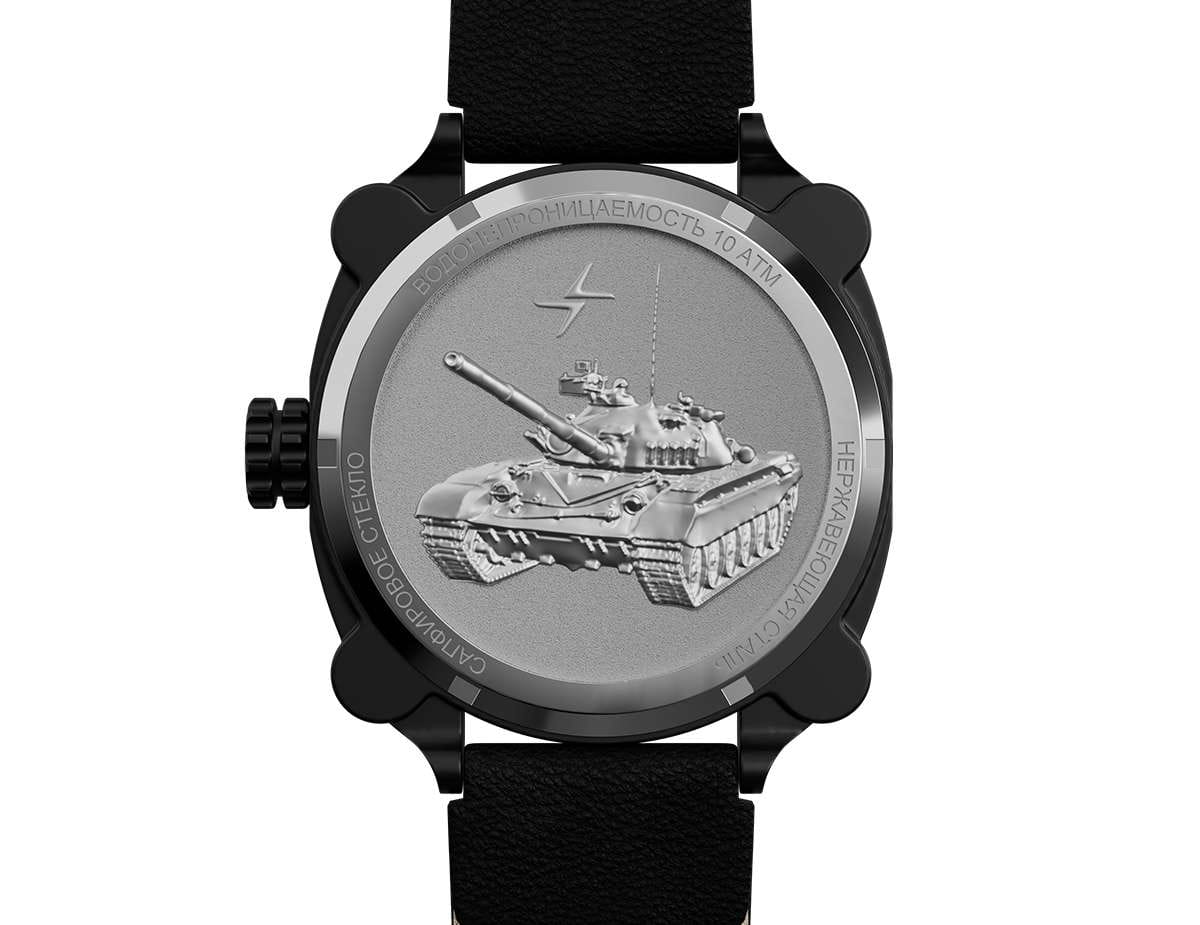 Мужские механические часы с автоподзаводом от бренда «МОЛНИЯ» — это стильный аксессуар, вдохновлённый дизайном приборной панели легендарного танка Т-72. Корпус диаметром 42 мм и толщиной 12 мм выполнен из нержавеющей стали 316L с IP-покрытиемIP-покрытиеМетод ионного напыления. Демонстрирует повышенную устойчивость к истиранию, окислению и химическим веществам. Под воздействием высокого давления и температуры около 1500°C молекулы металла надёжно соединяются с частицами корпуса часов.. БезельБезельВнешний ободок, закрепляющий стекло. В спортивных часах так называется поворотное кольцо с делениями на циферблате, выполняет роль таймера – замеряет отрезки времени на шкале. Неподвижный безель – элемент декора. Однонаправленно вращающийся безель на дайверских часах позволяет фиксировать моменты погружения и выныривания на поверхность. однонаправленный, вращающийся. Циферблат чёрного цвета оформлен арабскими цифрами и логотипом бренда. Окошко даты расположено в положении 3 часов и оснащено увеличительным стеклом. Стрелки и метки с люминесцентным покрытиемЛюминесцентное покрытиеПозволяет считывать показания времени в темноте. Производители наносят на стрелки, часовые индексы, безель или поверхность циферблата светонакопительный состав, дающий холодное свечение. Super-LumiNova. Циферблат защищён сапфировым стекломСапфировое стеклоПрочный и надёжный материал из кристалла сапфира синтетического происхождения, характеризующийся особой твёрдостью и устойчивостью к царапинам и повреждениям. с антибликовым покрытиемАнтибликовое покрытиеСлой оксида металла в 0,13-0,3 микрон, благодаря которому стекло часов не бликует и не отражает свет. Антибликовое покрытие уменьшает отражение света в 10 раз, обеспечивая отличную читаемость показателей циферблата.. Механизм — японский автоматический калибр Miyota 8215 запас хода до 42 часов. Заводная головка стилизована под гусеничную ленту, задняя крышка с гравировкой танка Т-72. Часы оснащены кожаным ремешком чёрного цвета с классической пряжкой и системой быстрой замены. Водонепроницаемость 100 м позволяет использовать часы для плавания и повседневного ношения. Идеальный выбор для тех, кто ценит инженерное наследие и мощный дизайн.